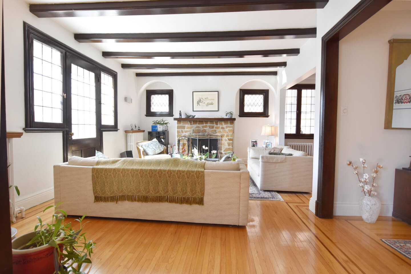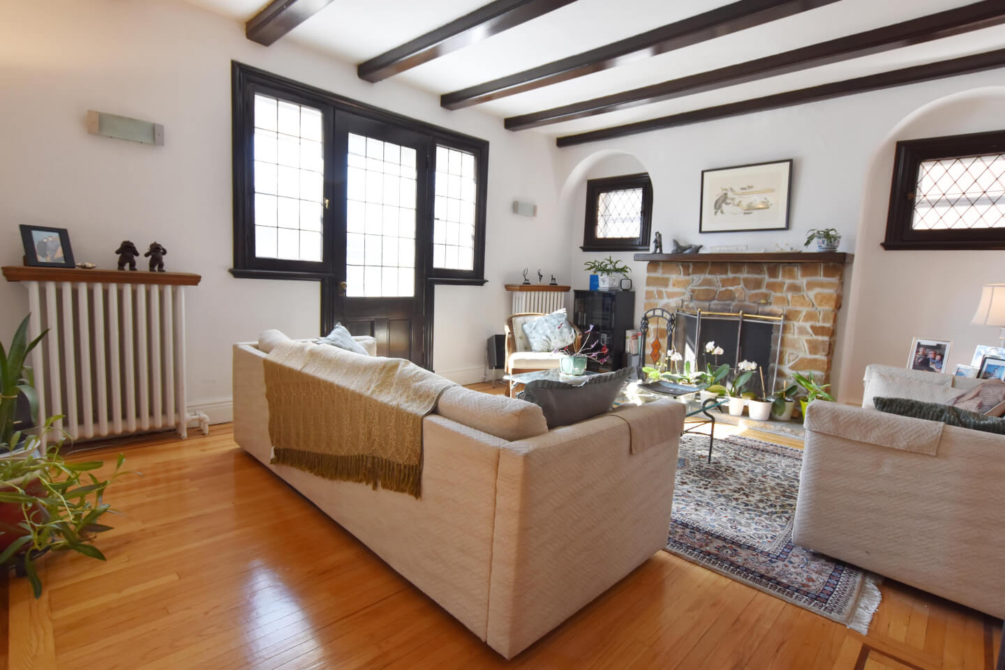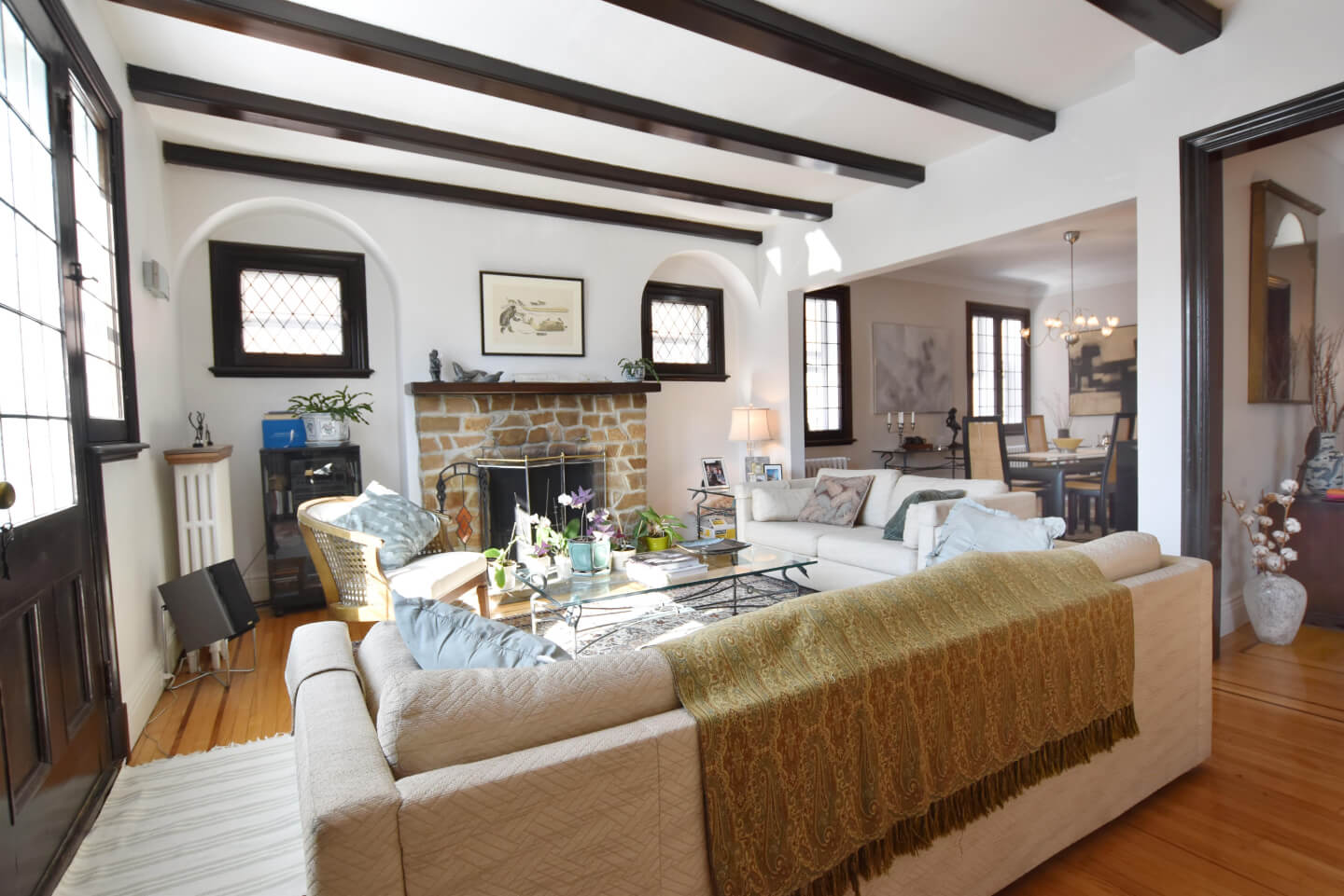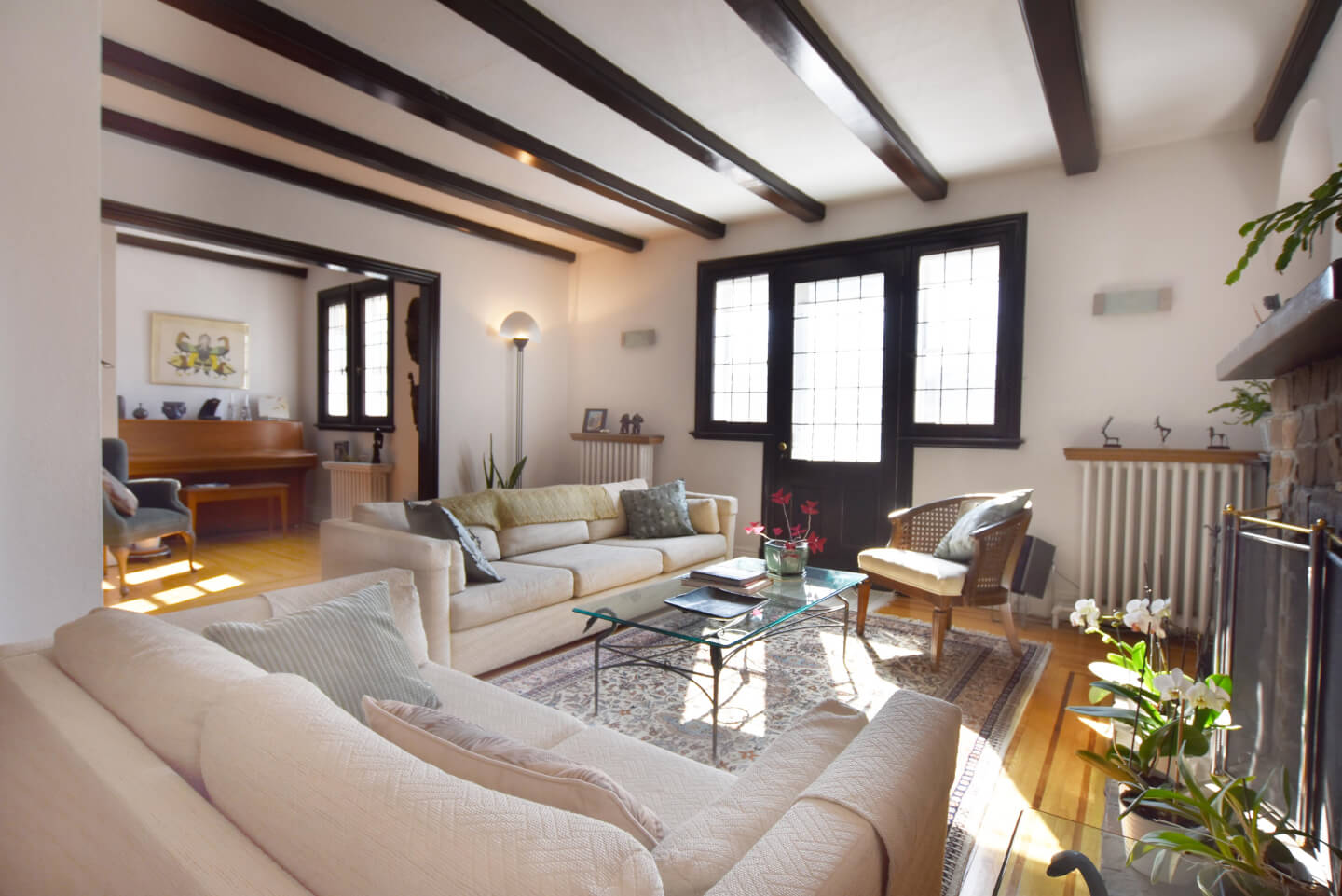 Magnificent living room, super bright, ceiling beams, front balcony (fireplace nonfunctional as per municipal bylaw), open to dining room