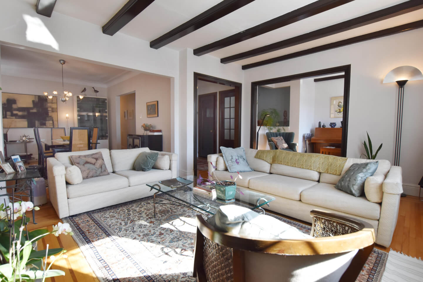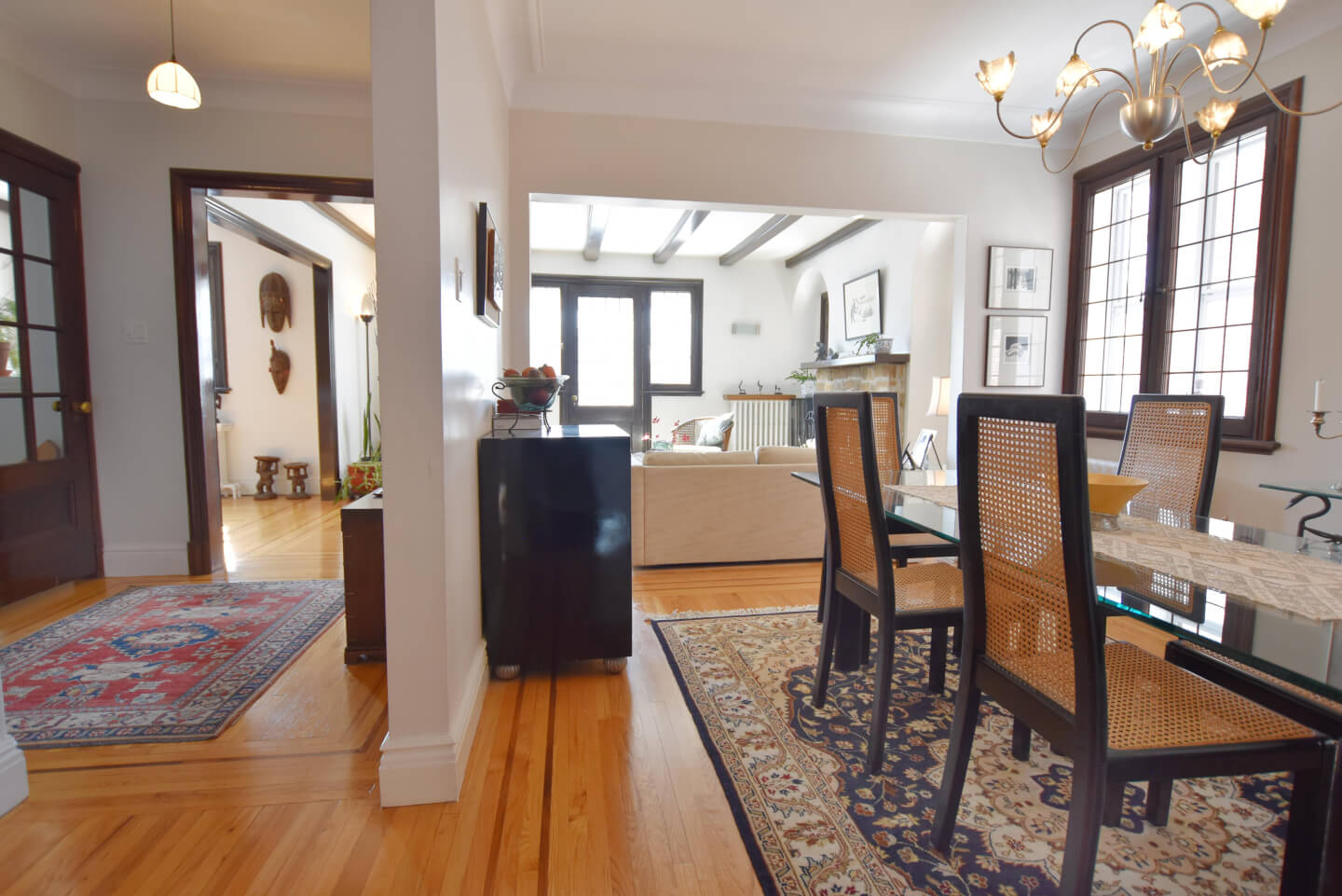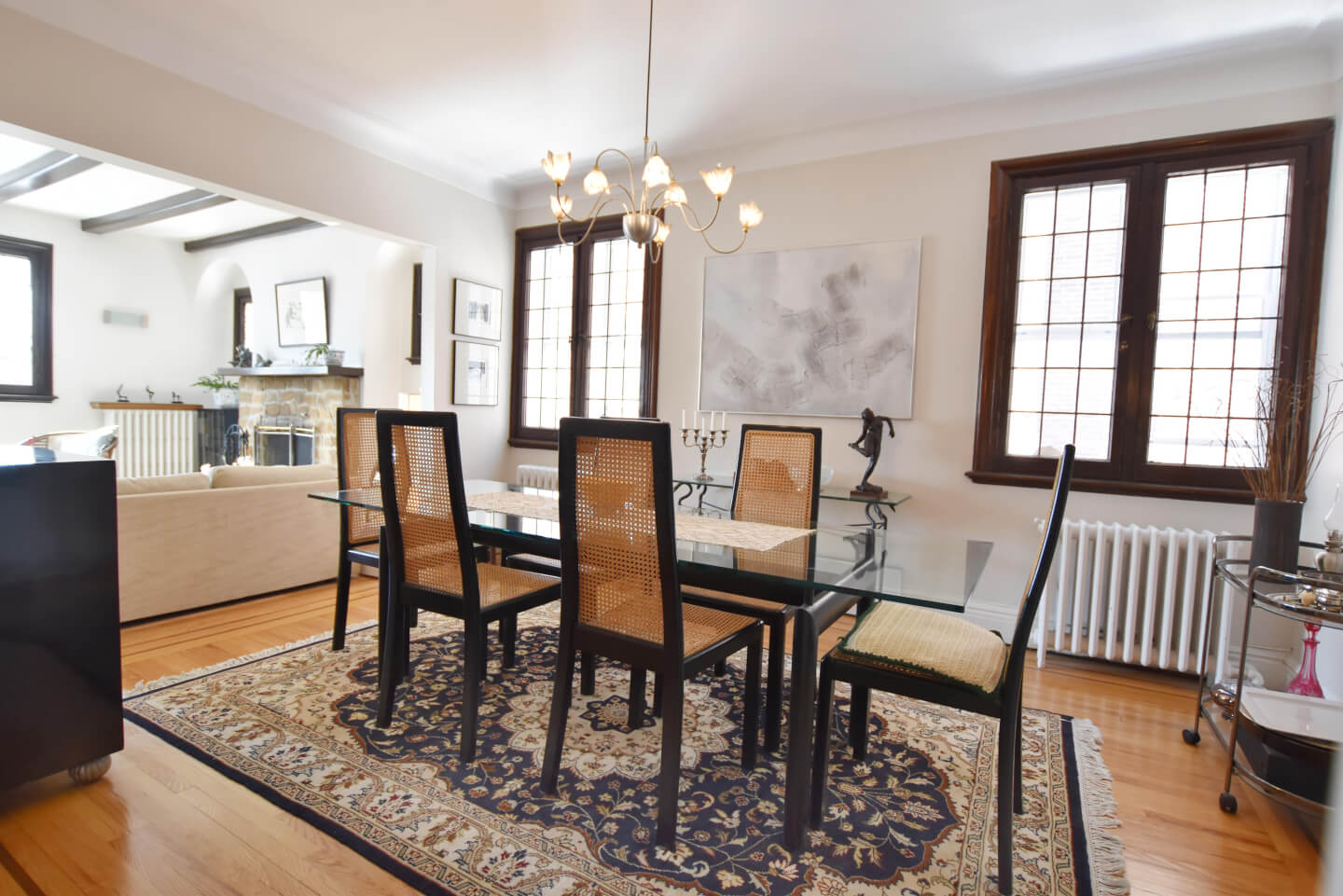 Magnificent living room, super bright, ceiling beams, front balcony (fireplace nonfunctional as per municipal bylaw), open to dining room