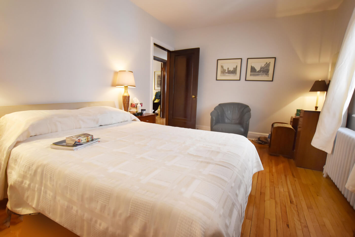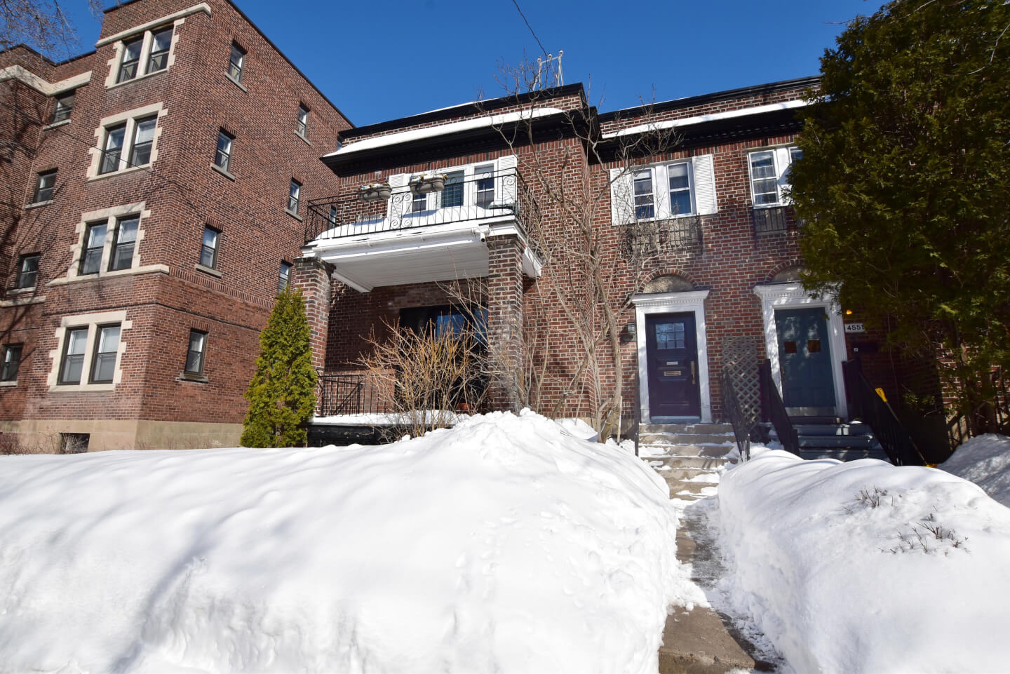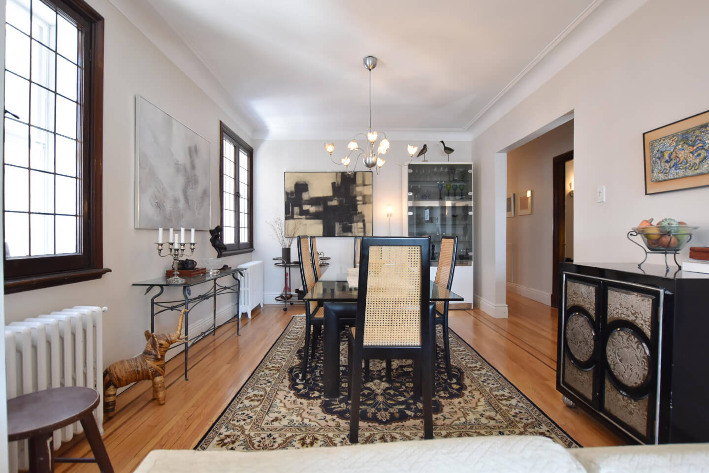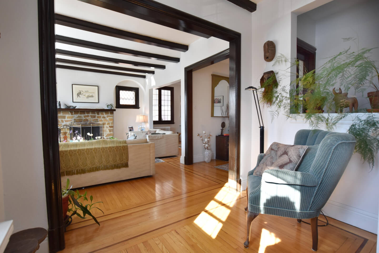 Magnificent living room, super bright, ceiling beams, front balcony (fireplace nonfunctional as per municipal bylaw), open to dining room
