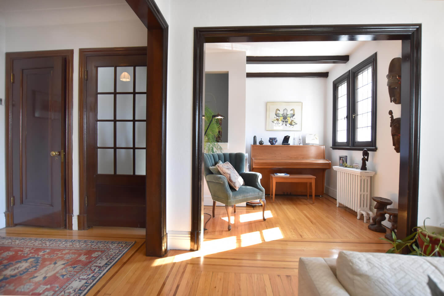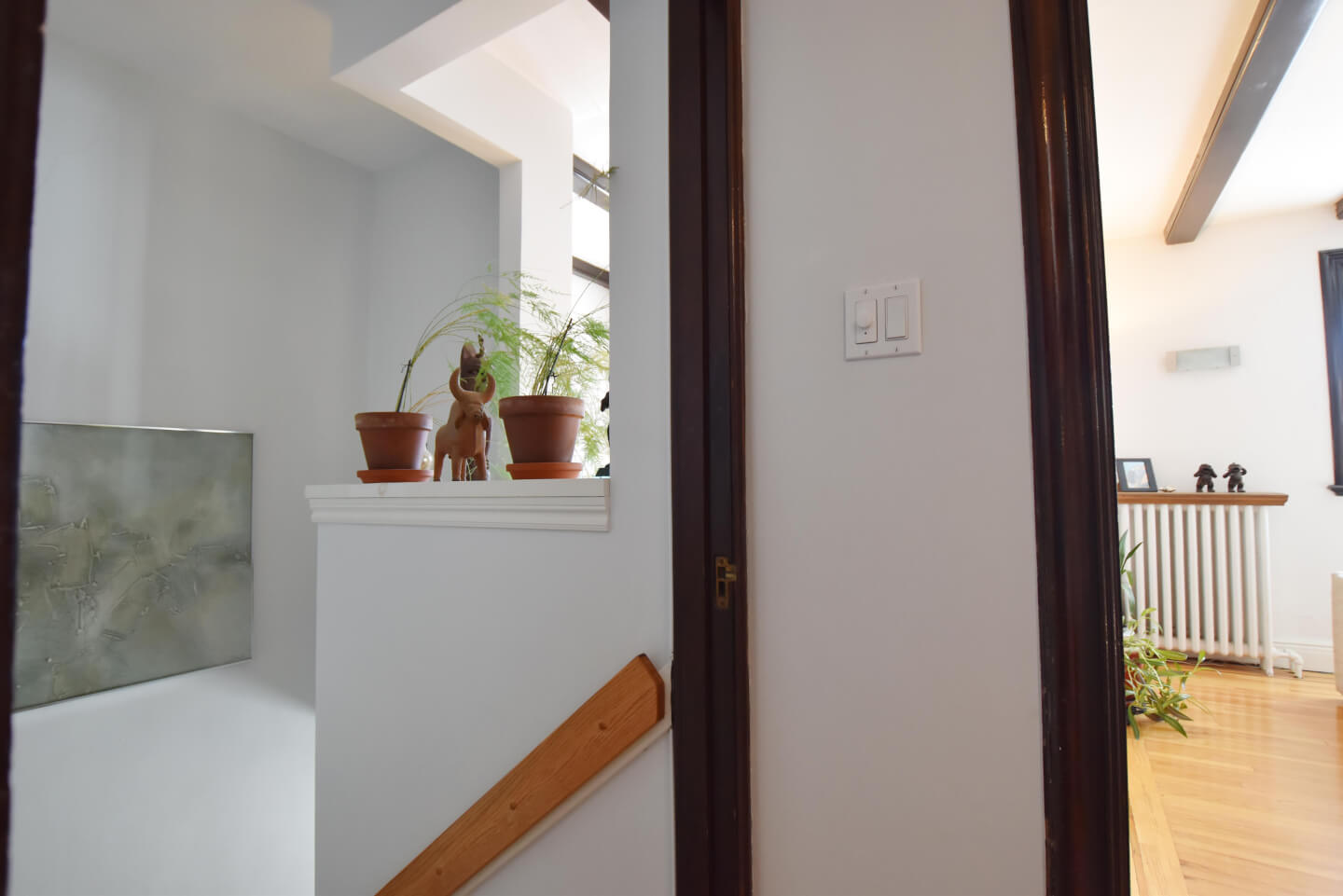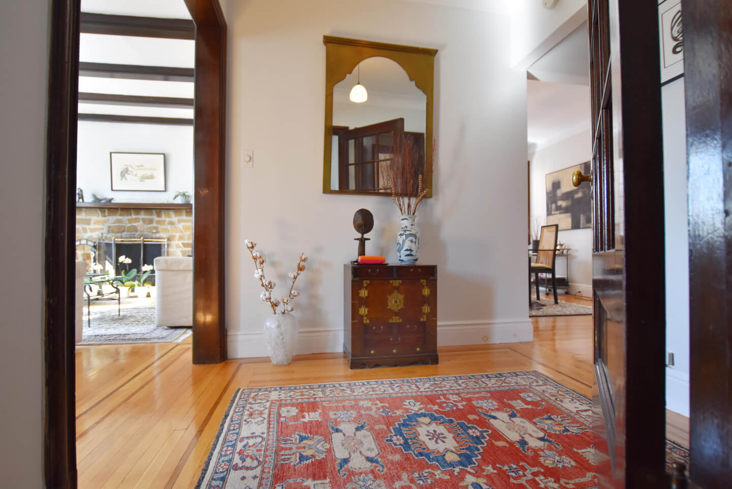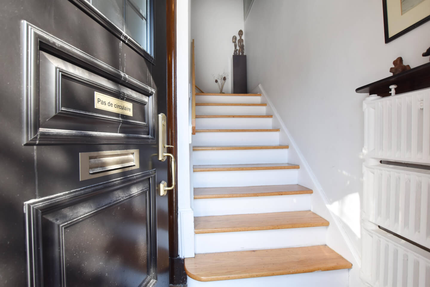 Entrance hall and its staircase are drenched with daylight from the opening from the den /office