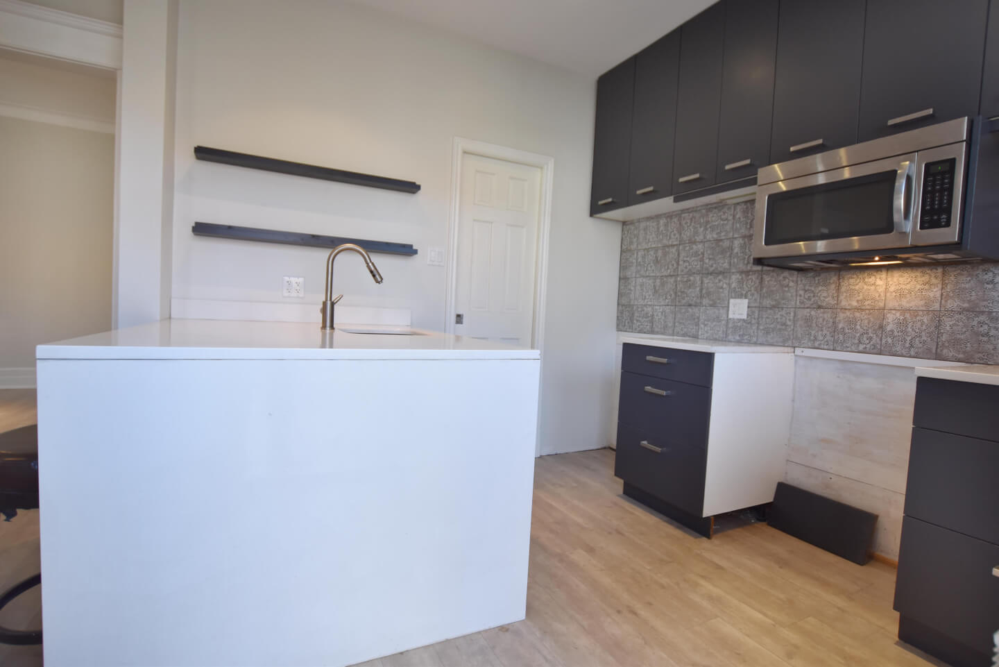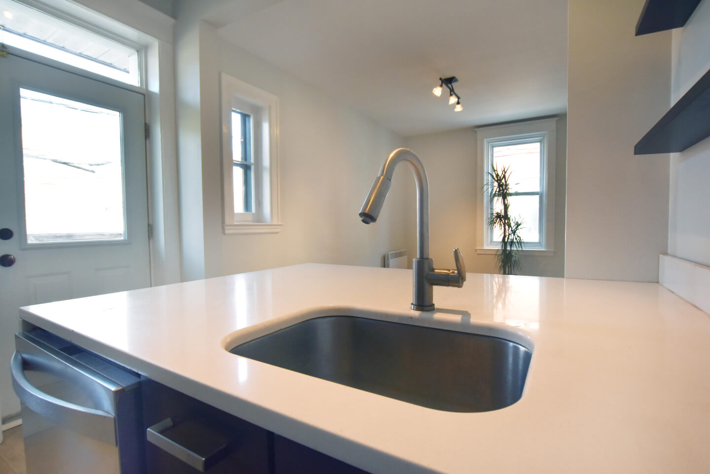 Kitchen +/-2008, Quartz counter top & eat-in island, door to the terrace &