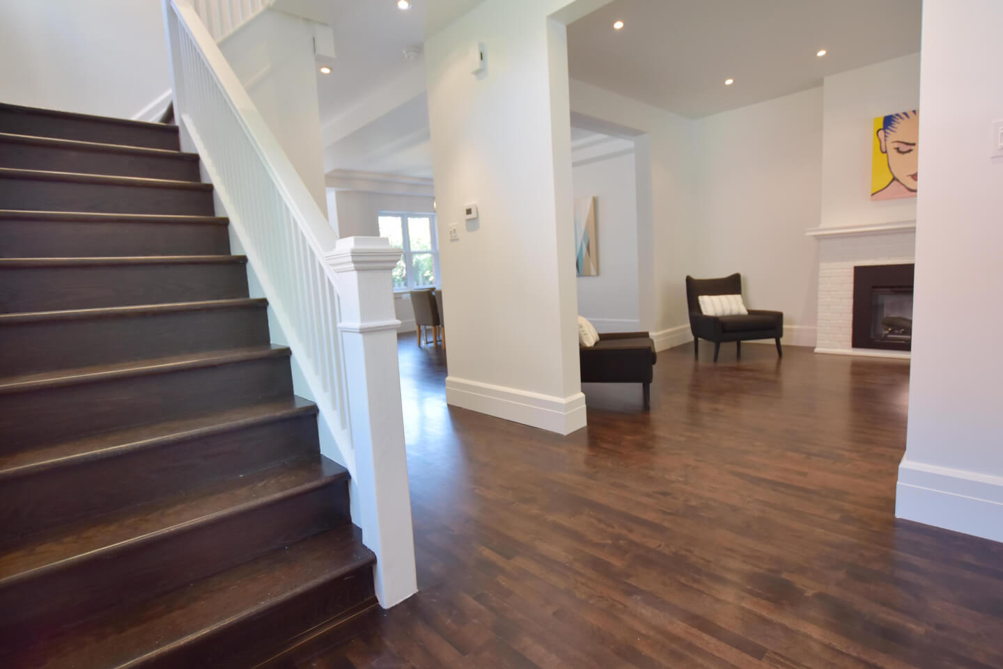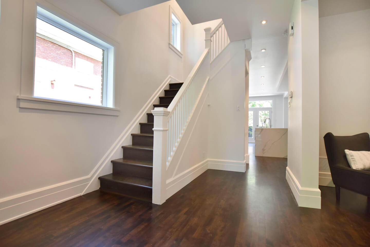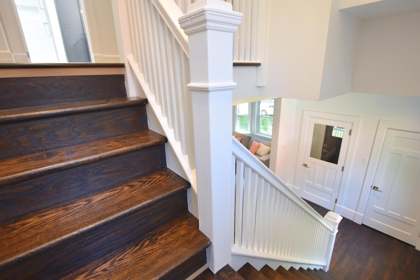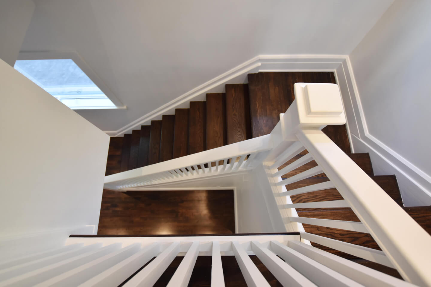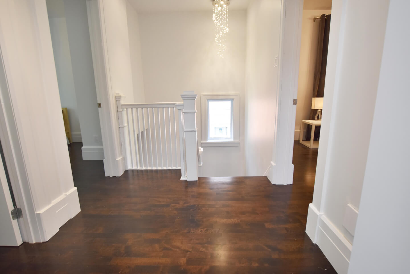 New Hardwood floors chocolate color on the 3 floors and wood baseboards painted white