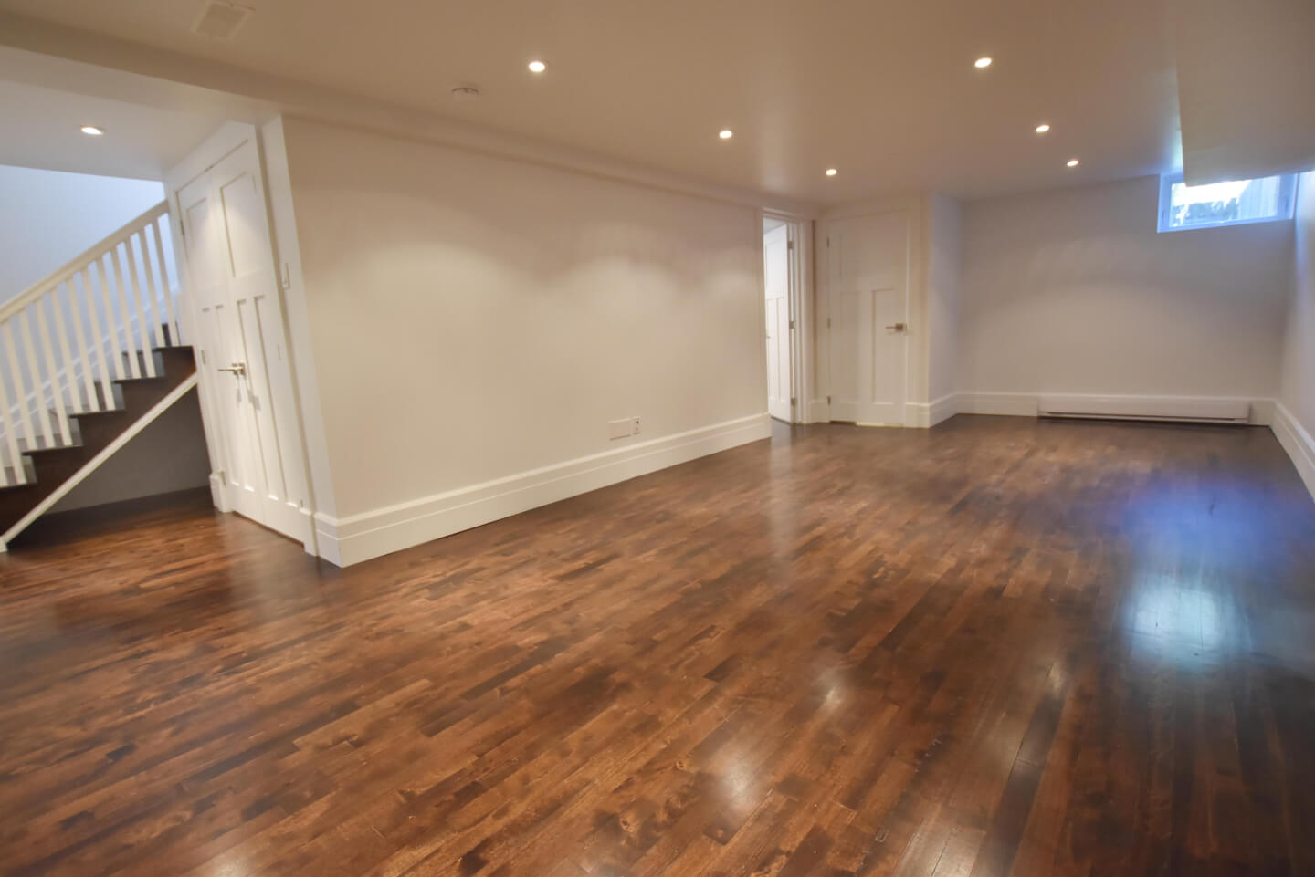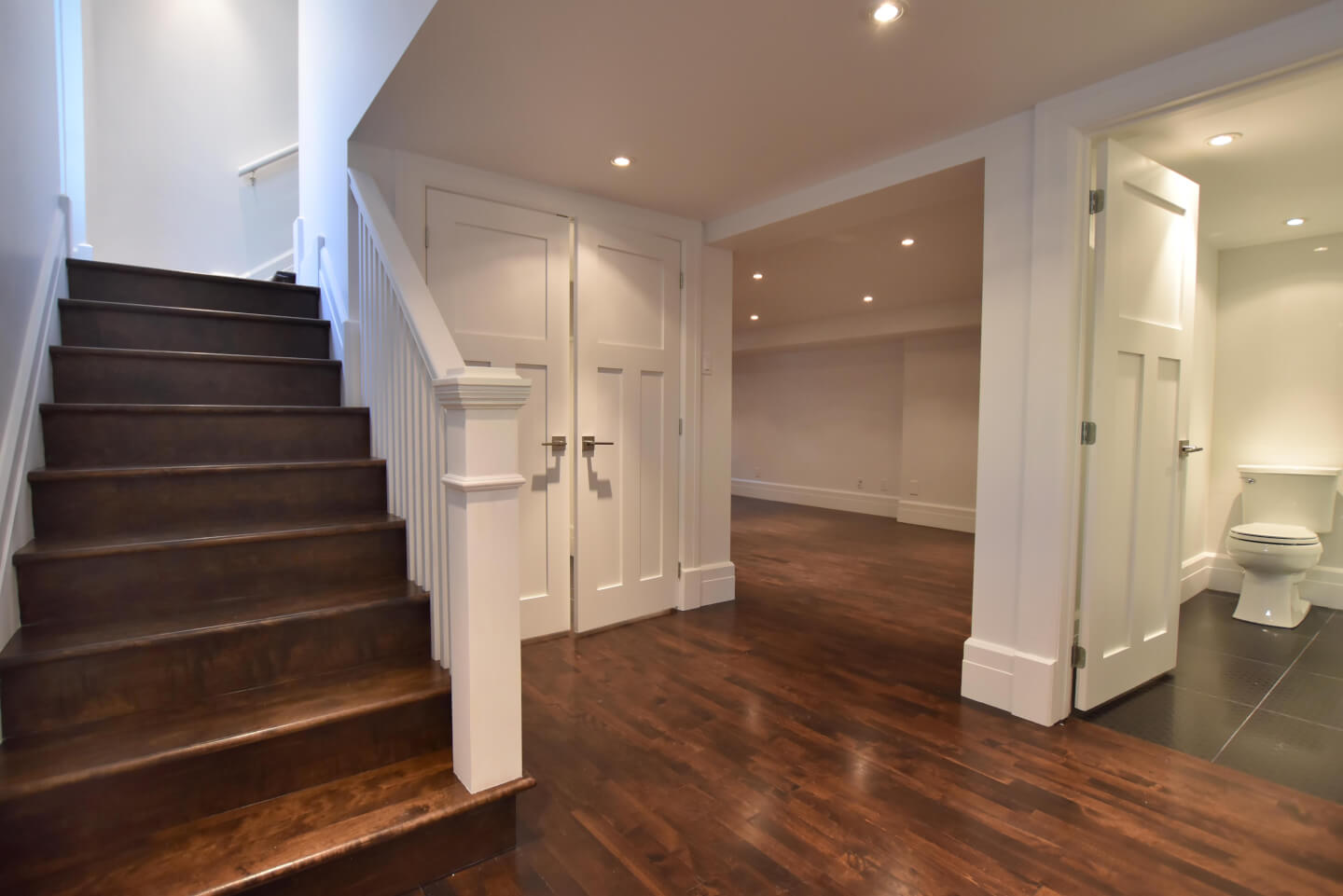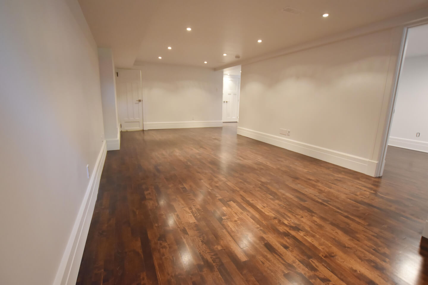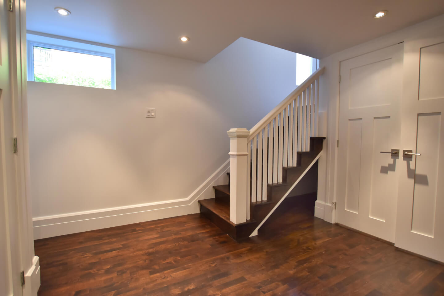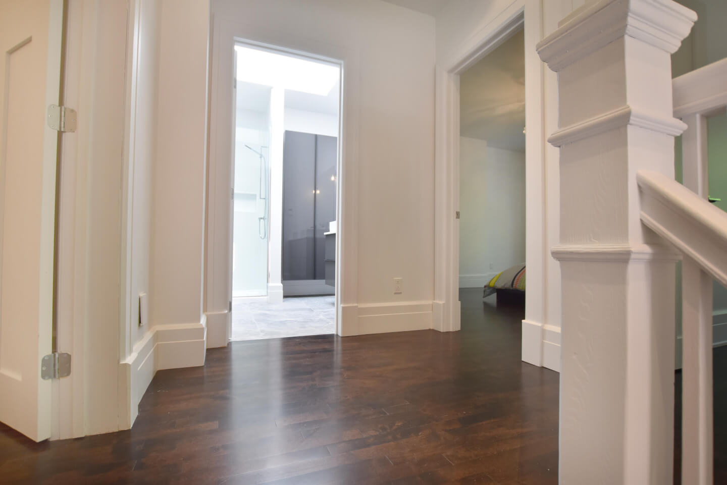 New Hardwood floors chocolate color on the 3 floors and wood baseboards painted white