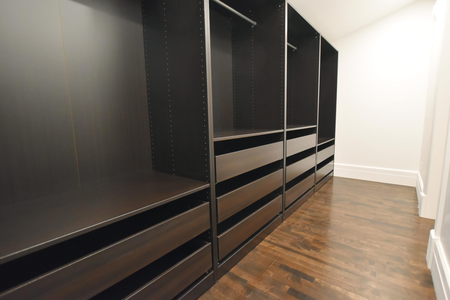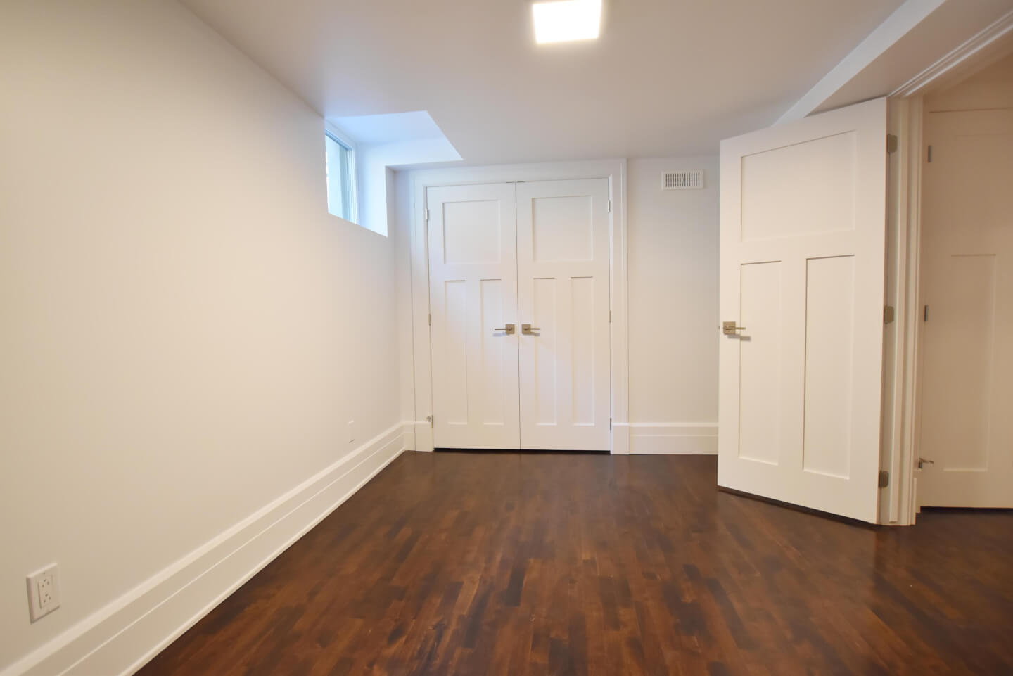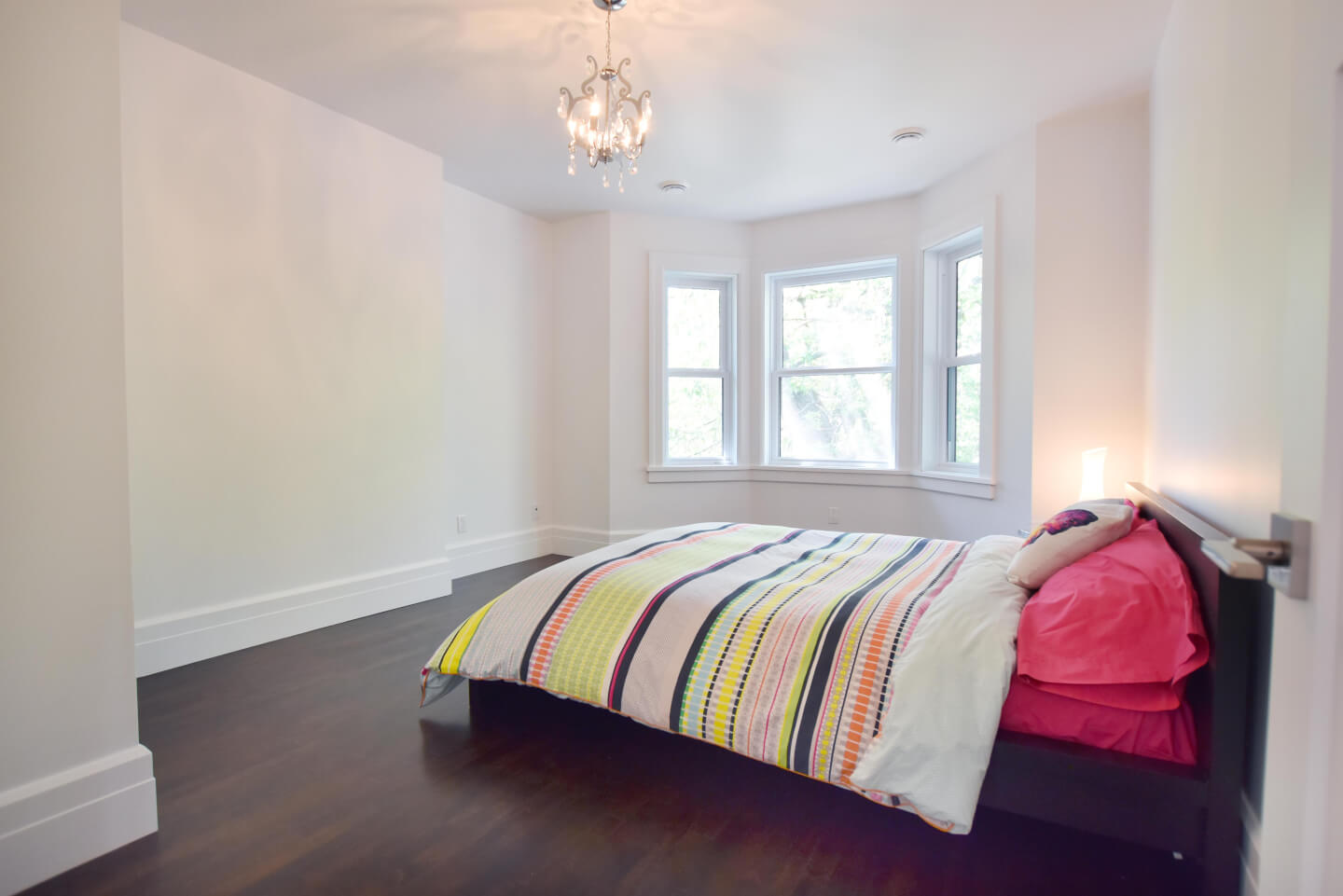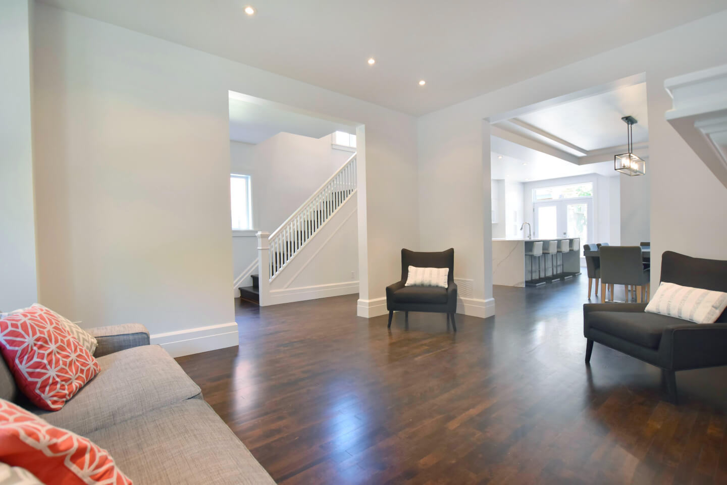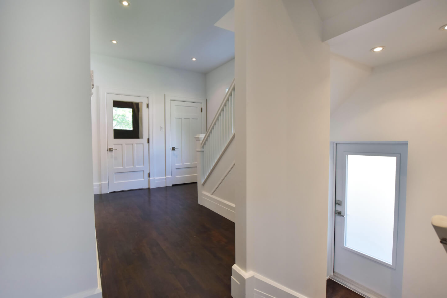 New Hardwood floors chocolate color on the 3 floors and wood baseboards painted white