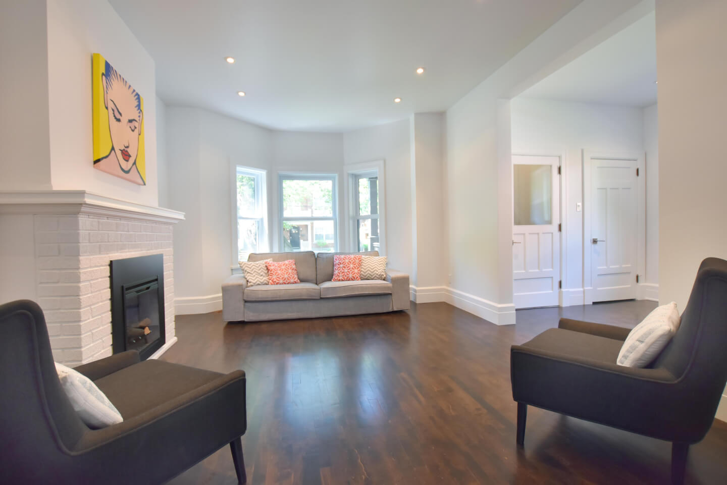 Open concept Living room / dining room with a bay window & Electric fireplace