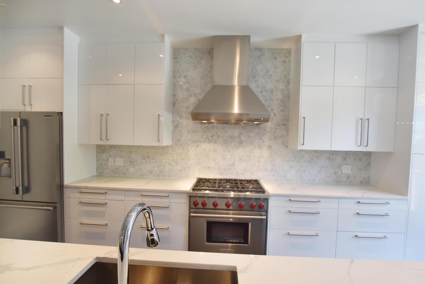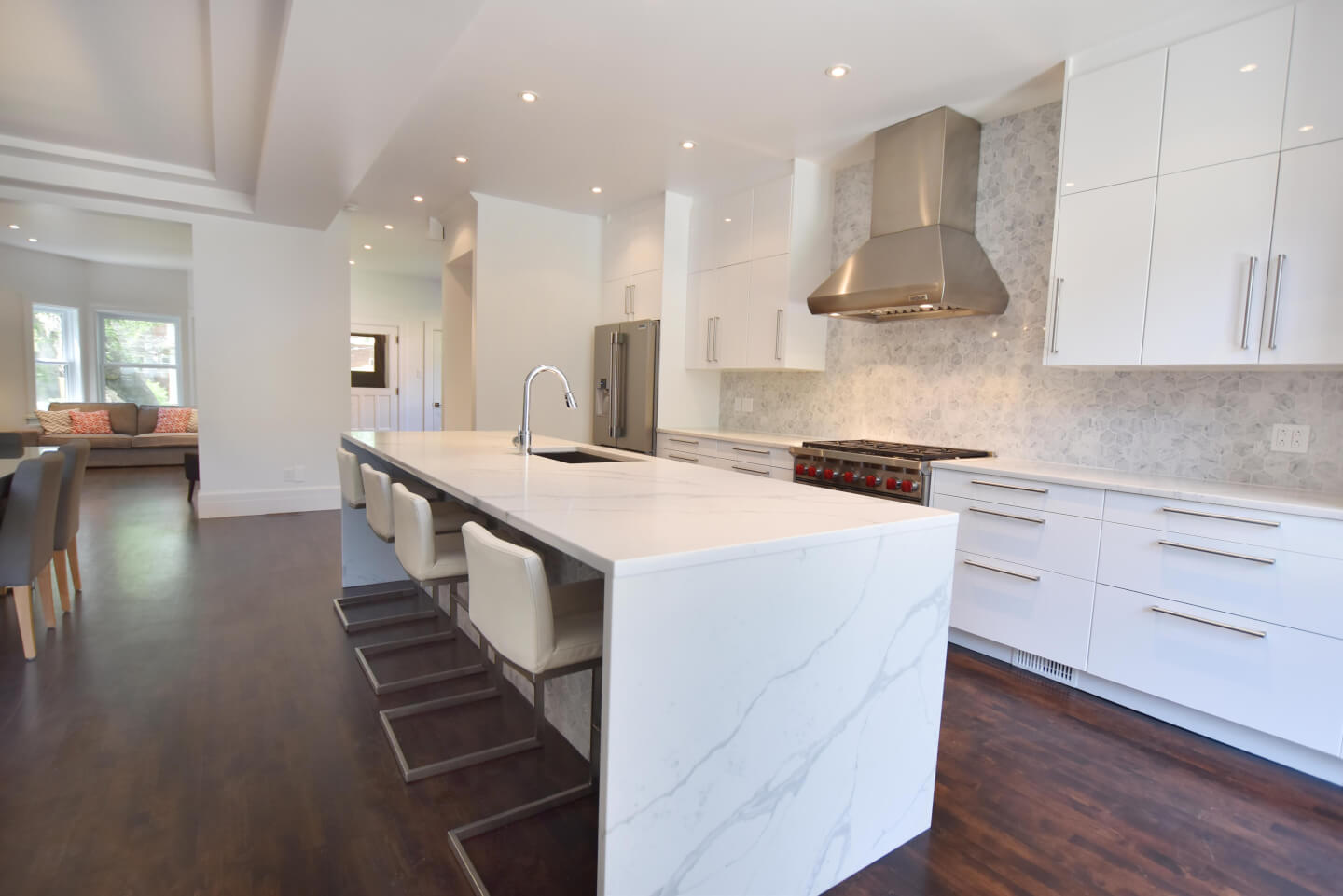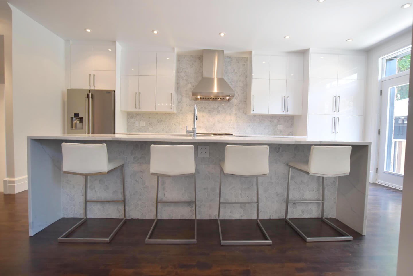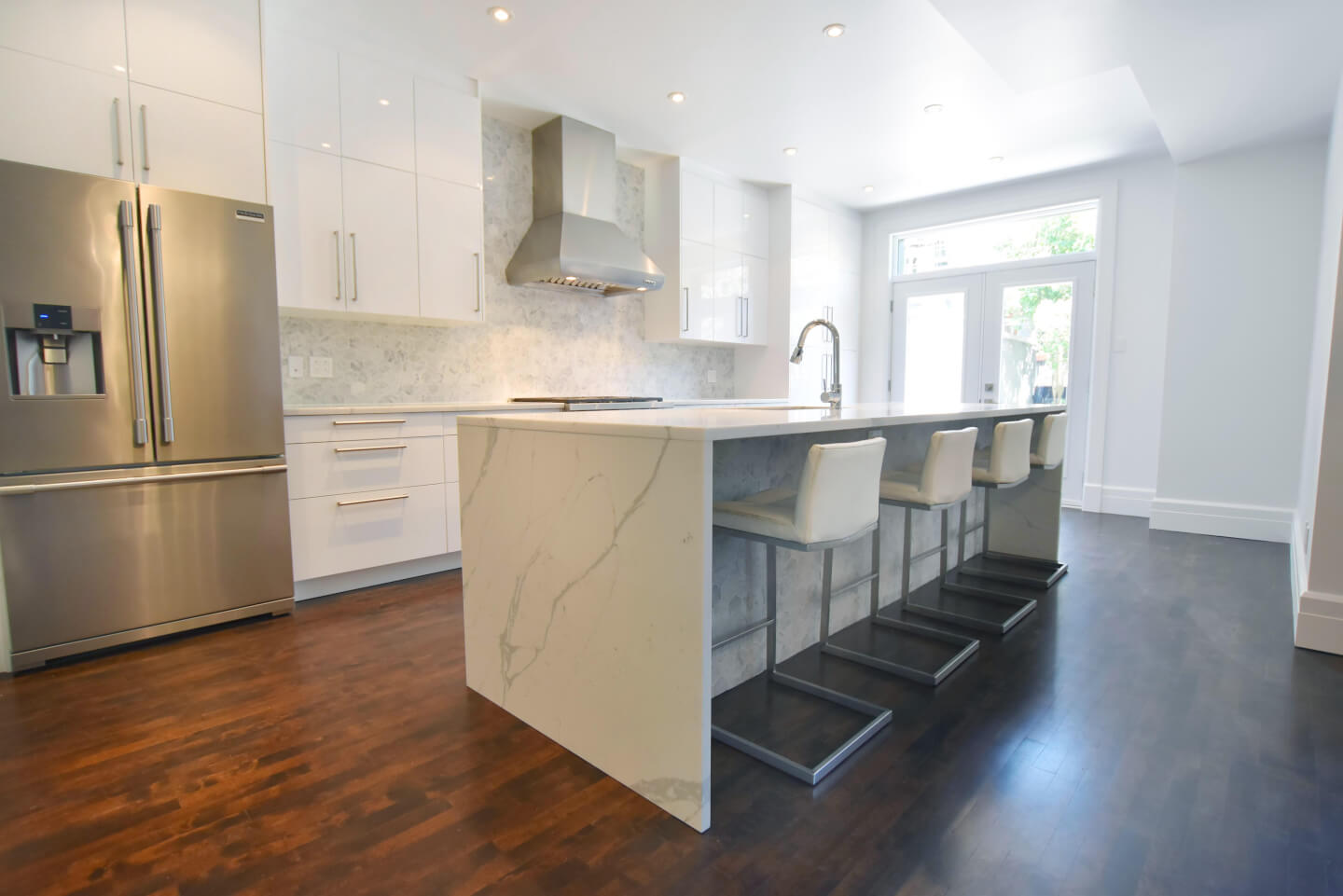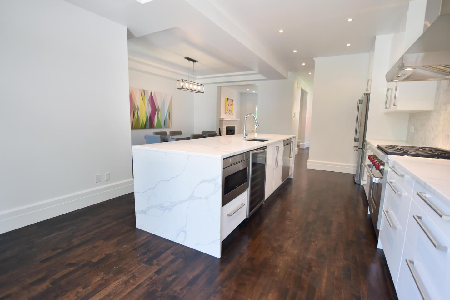 Spectacular large Ikea Kitchen, high end appliances included * gas Wolf stove*, Quartz countertop, marble back splash mosaic, central Island counter bar breakfast