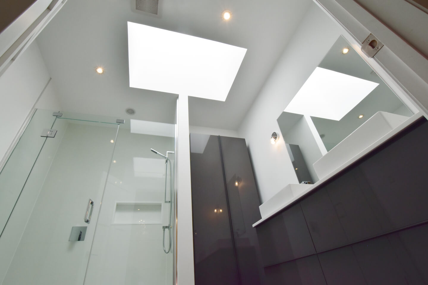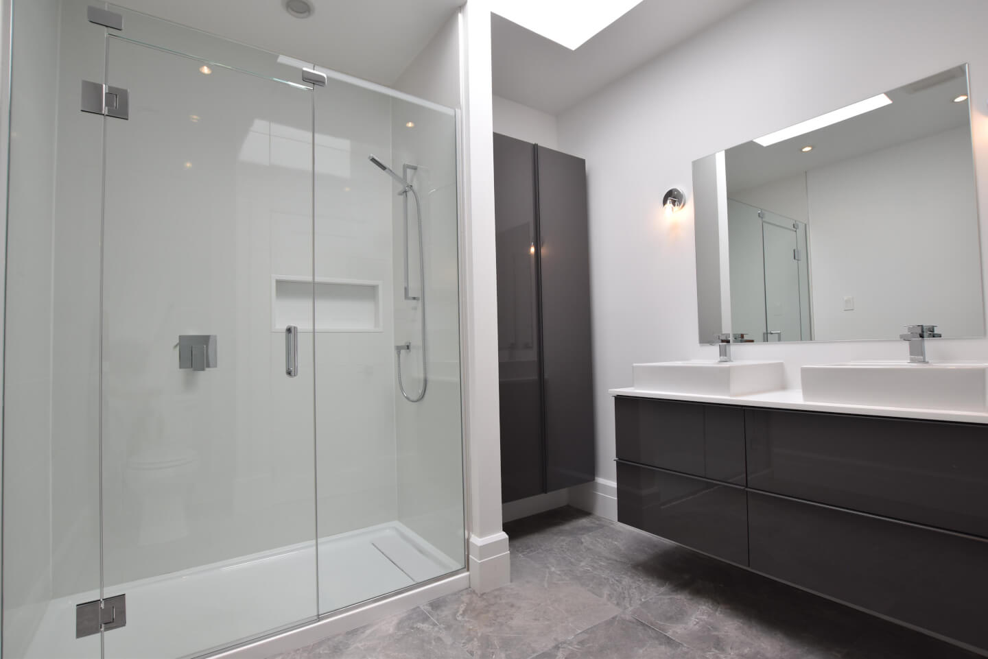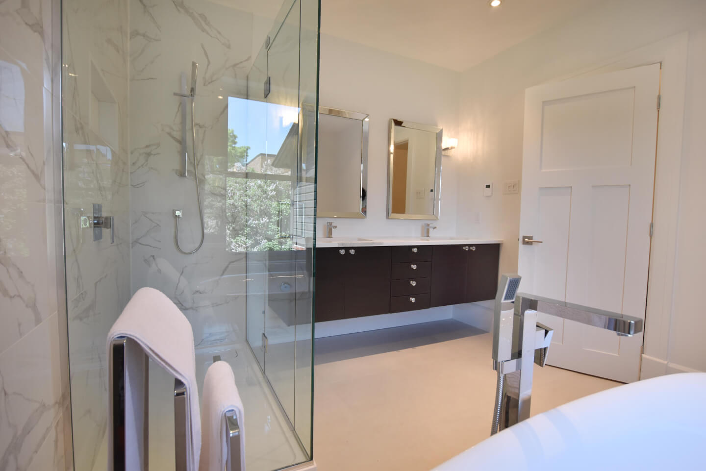Main superb bathroom, with glass shower, 2 sinks, skylight all on radiant floor