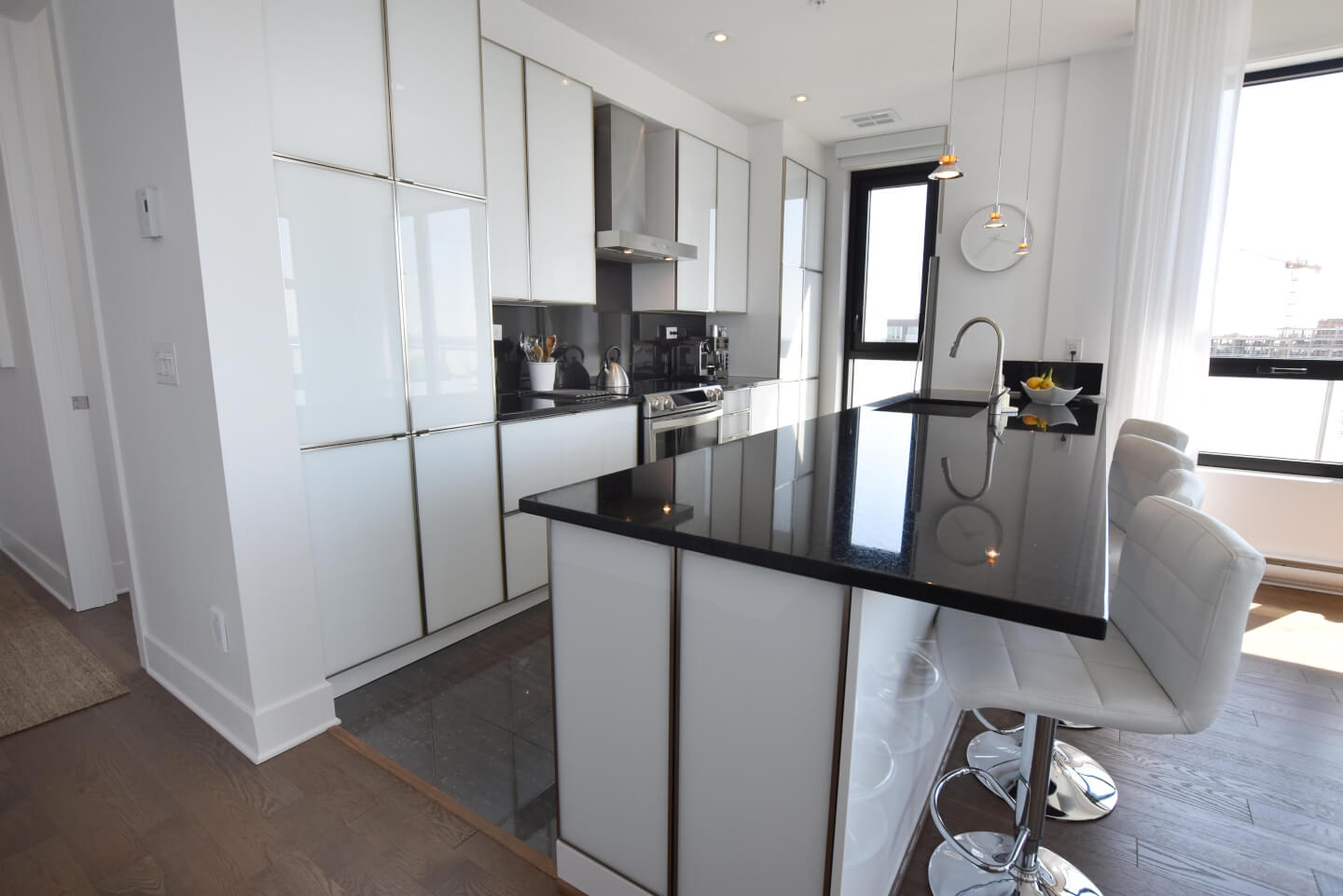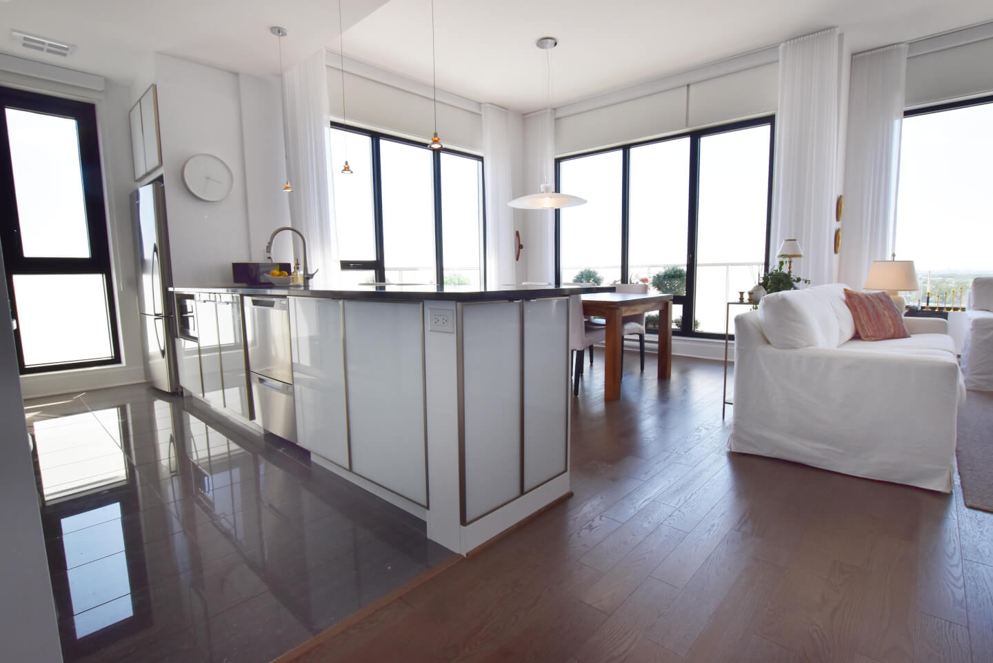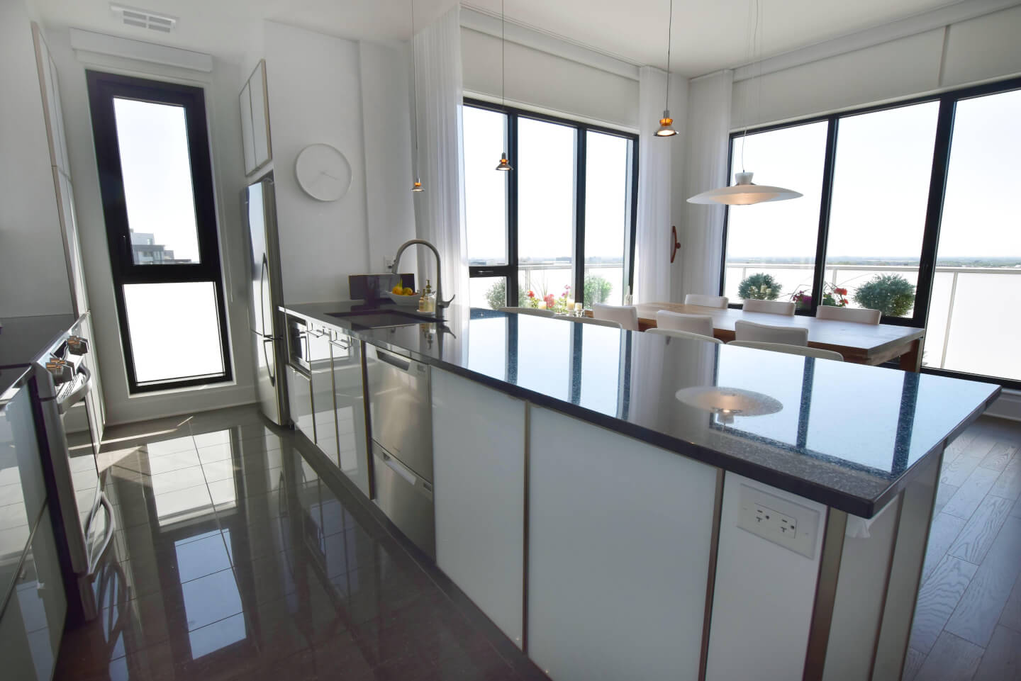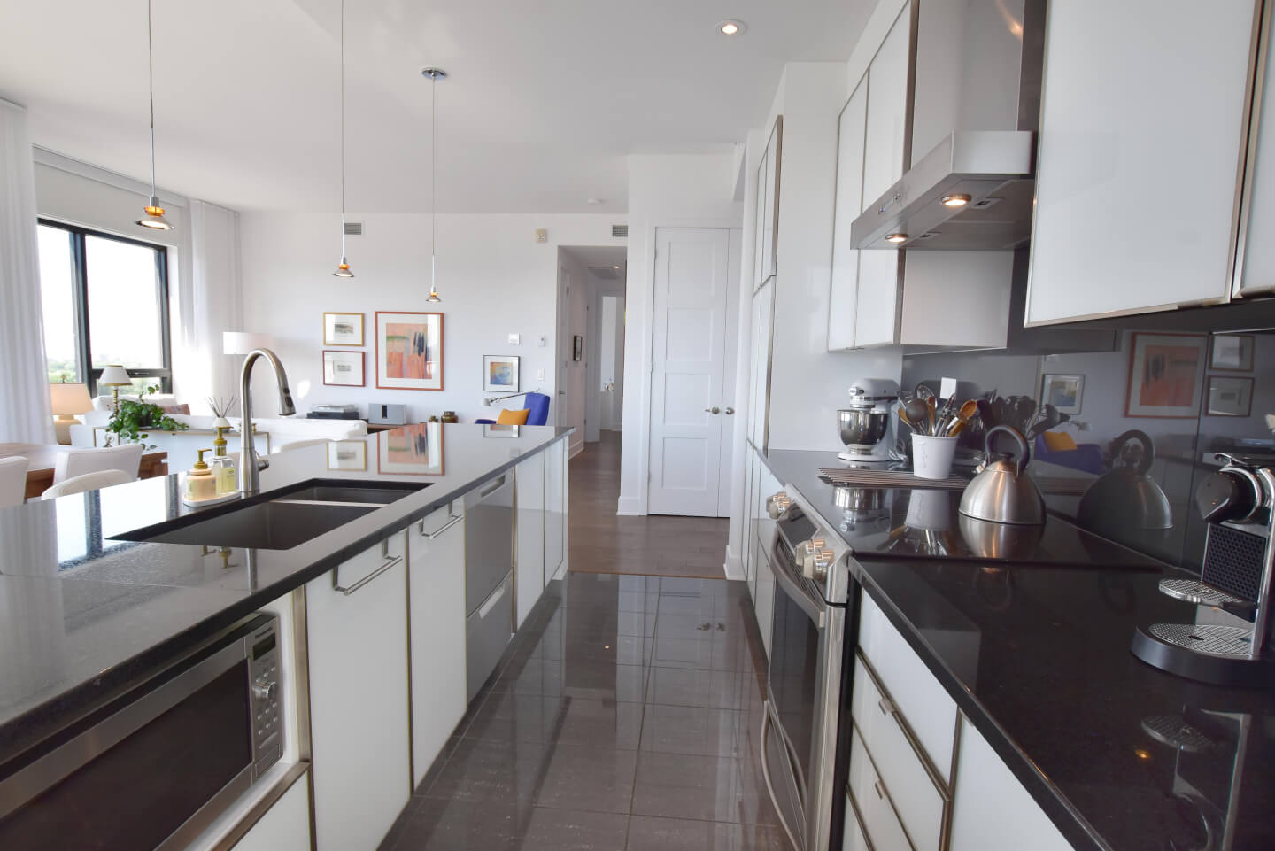 Modern kitchen, quartz counters, ceramic floor