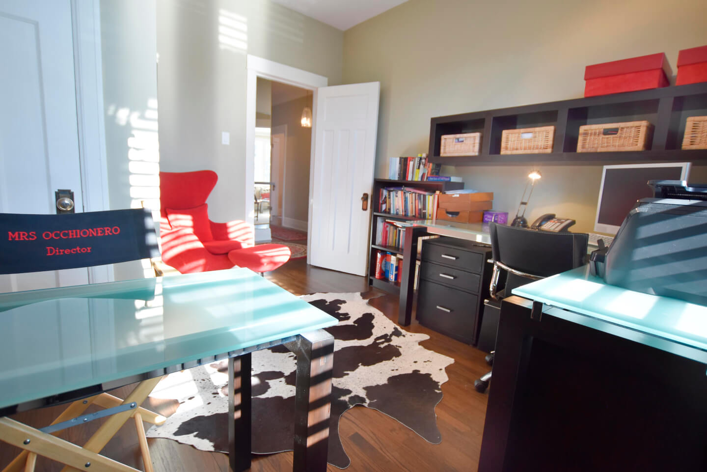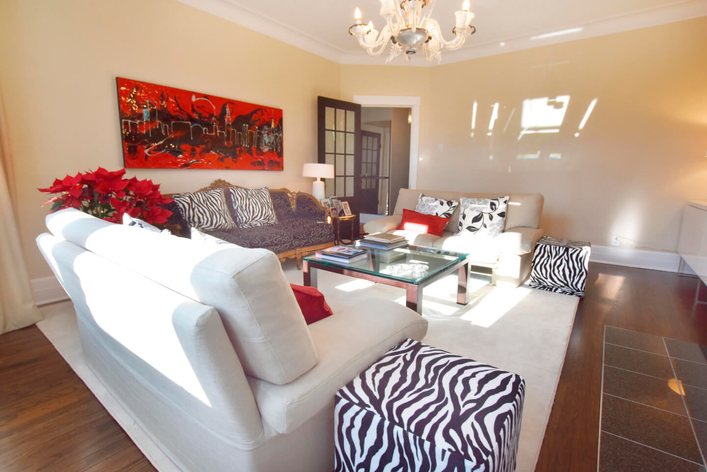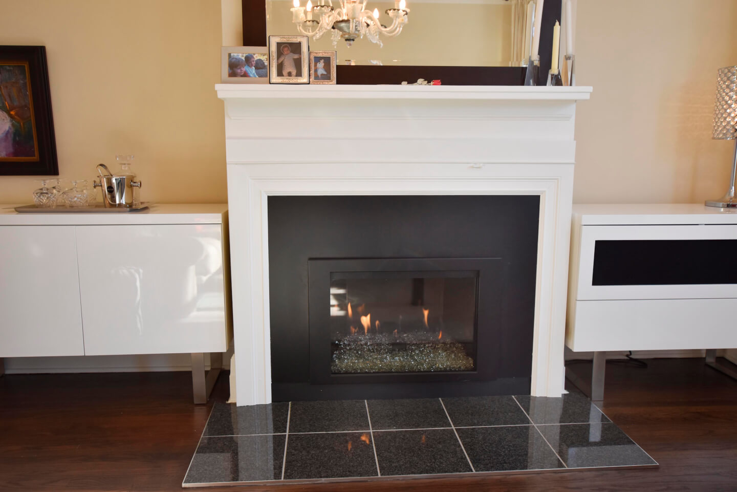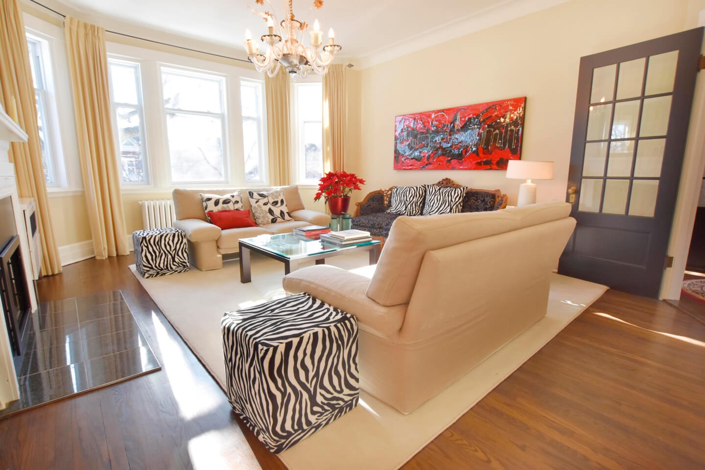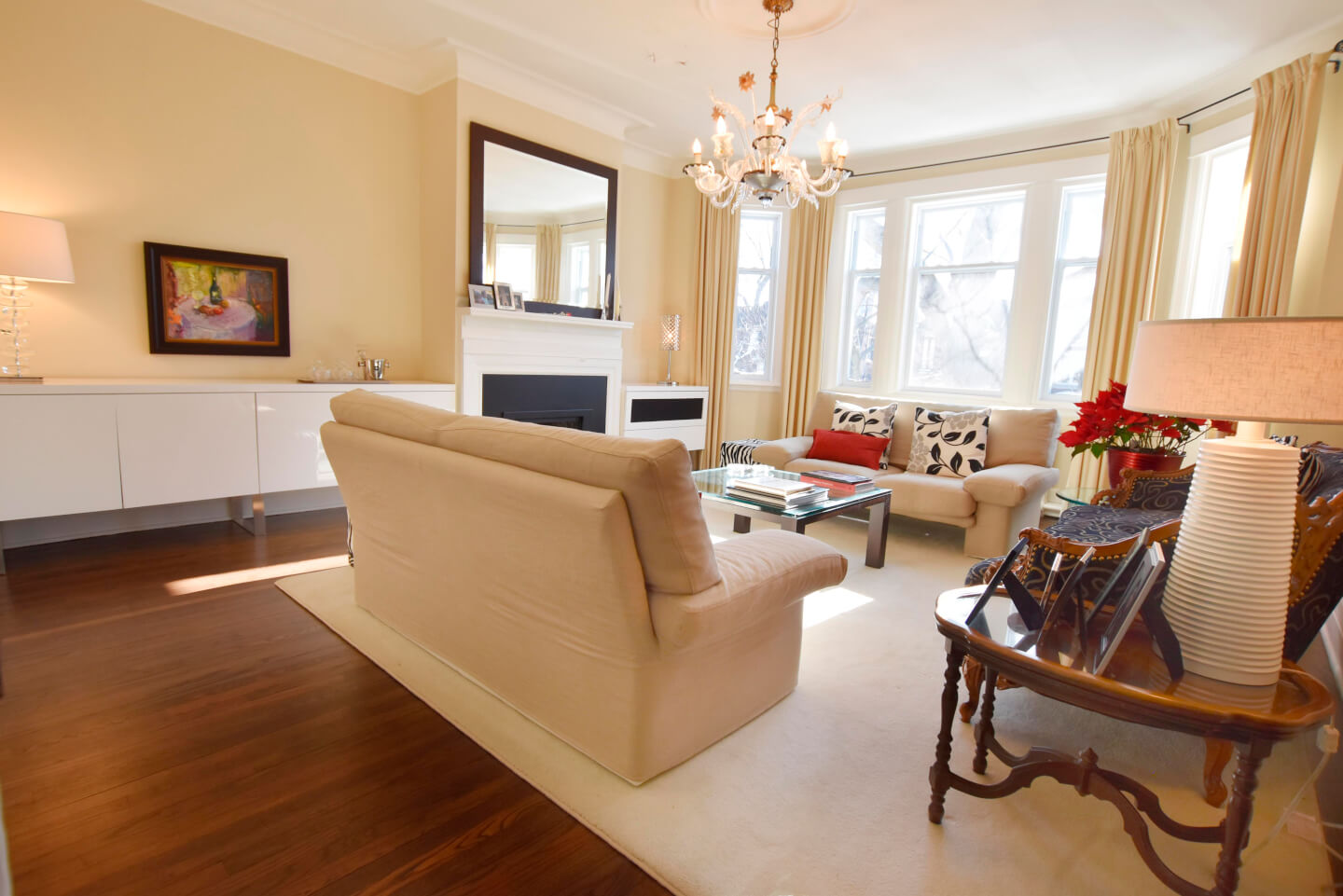 Elegant spacious living room drenched of daylight with a magnificent bay window and a gas fireplace