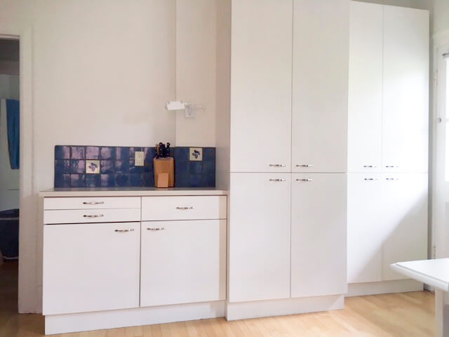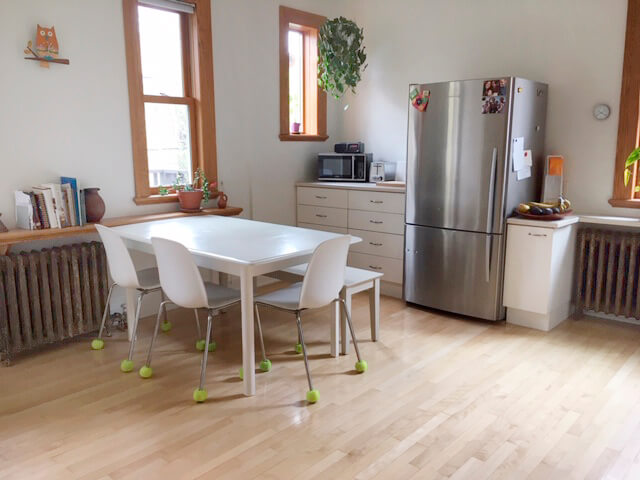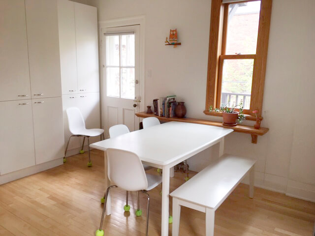 Large Kitchen with roomy dinette area, Melamine cabinets, hardwood floor, door to the terrace