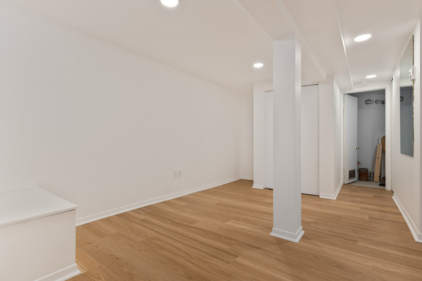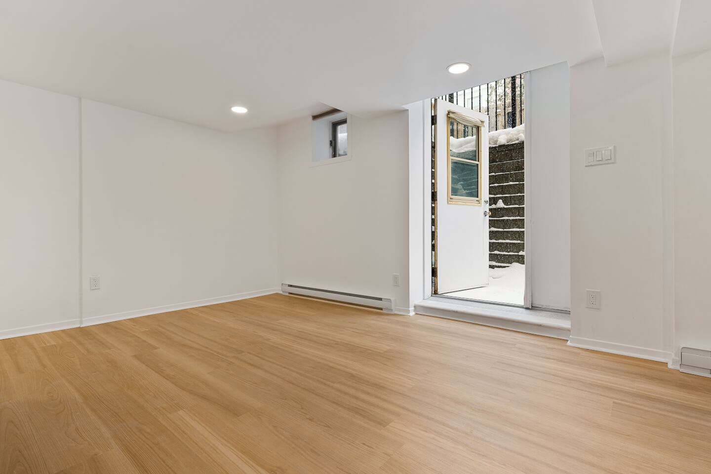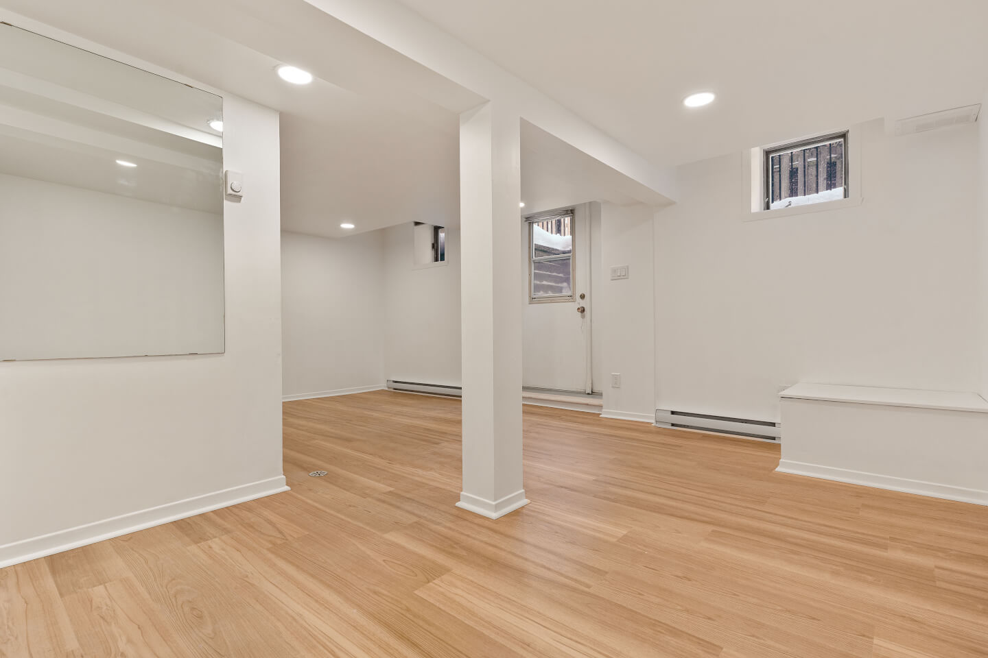Finished basement, with floating floor Ceiling height 6”-4” Family room or Bedrooms 2nd modest bathroom Exit door to your Urban garden Storage, concrete floor