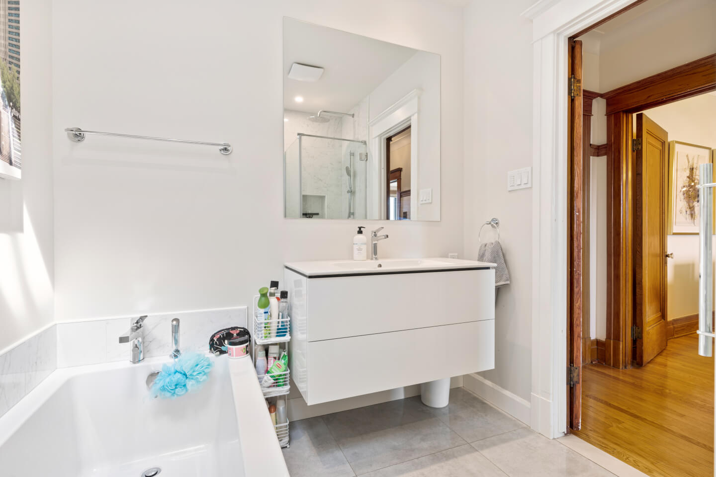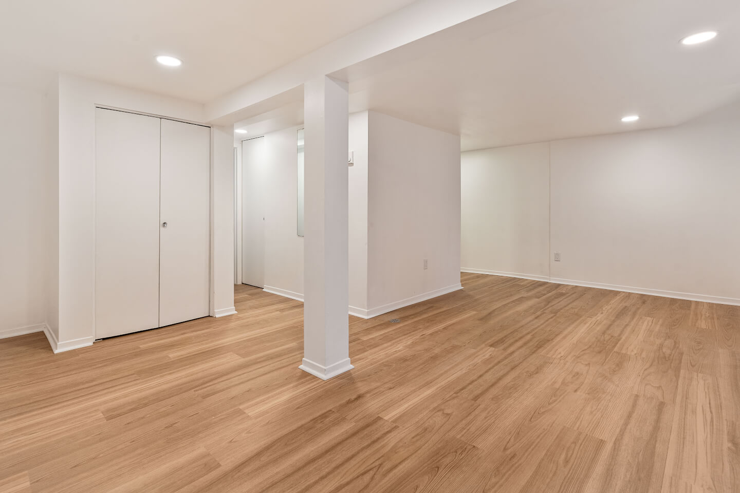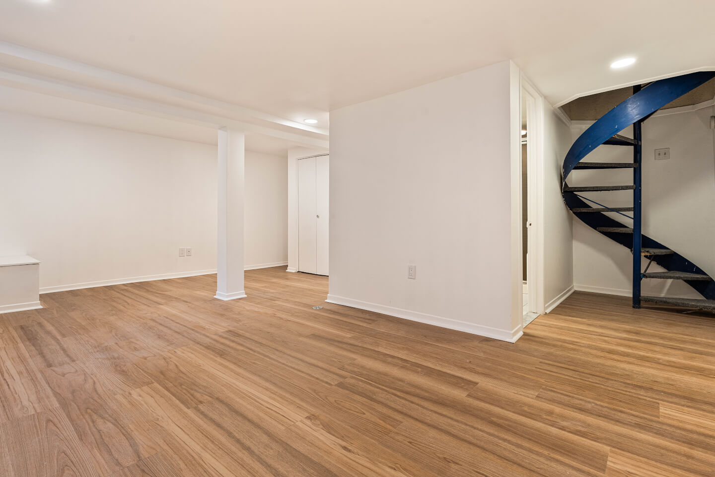 Finished basement, with floating floor Ceiling height 6”-4” Family room or Bedrooms 2nd modest bathroom Exit door to your Urban garden Storage, concrete floor