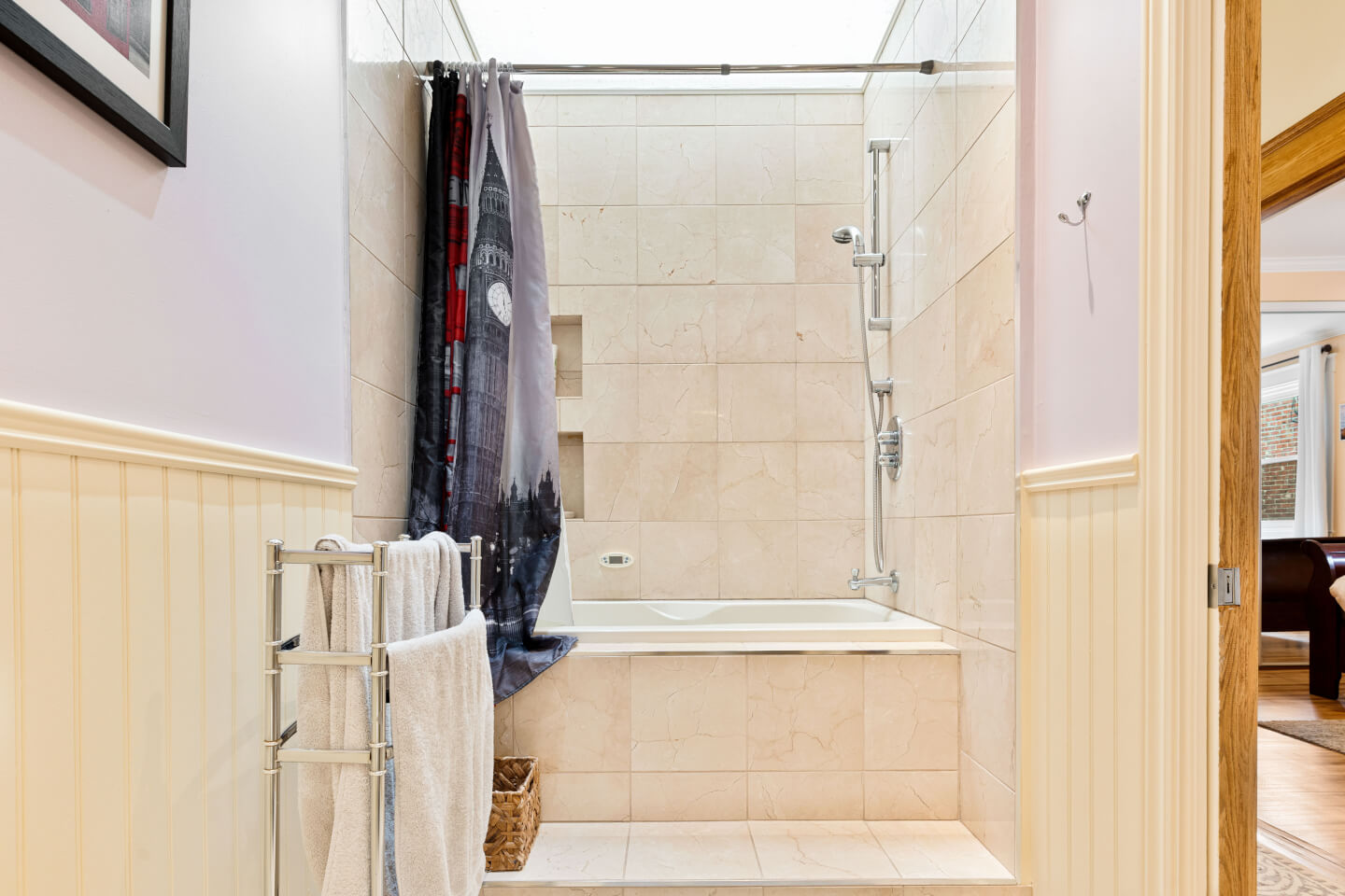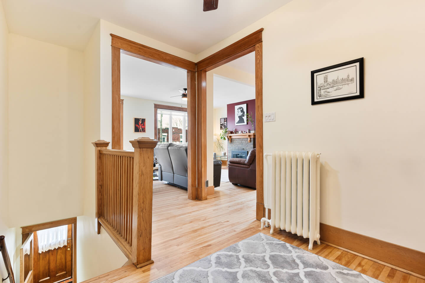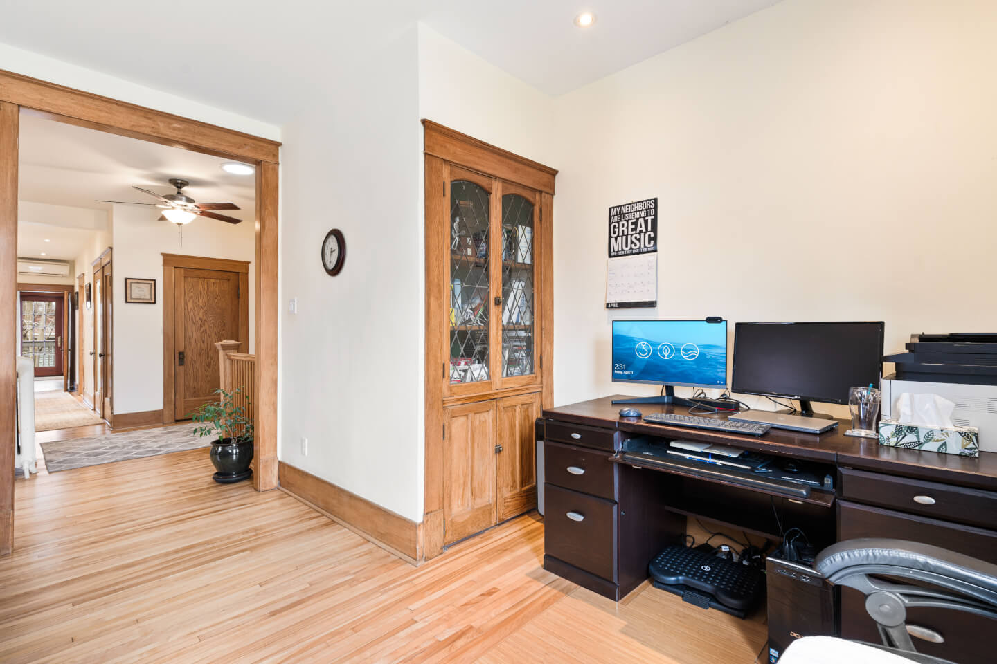Large open concept living room (*original fireplace), dining room with 2nd tubular stainless-steel skylight, office area with its built-in & front balcony