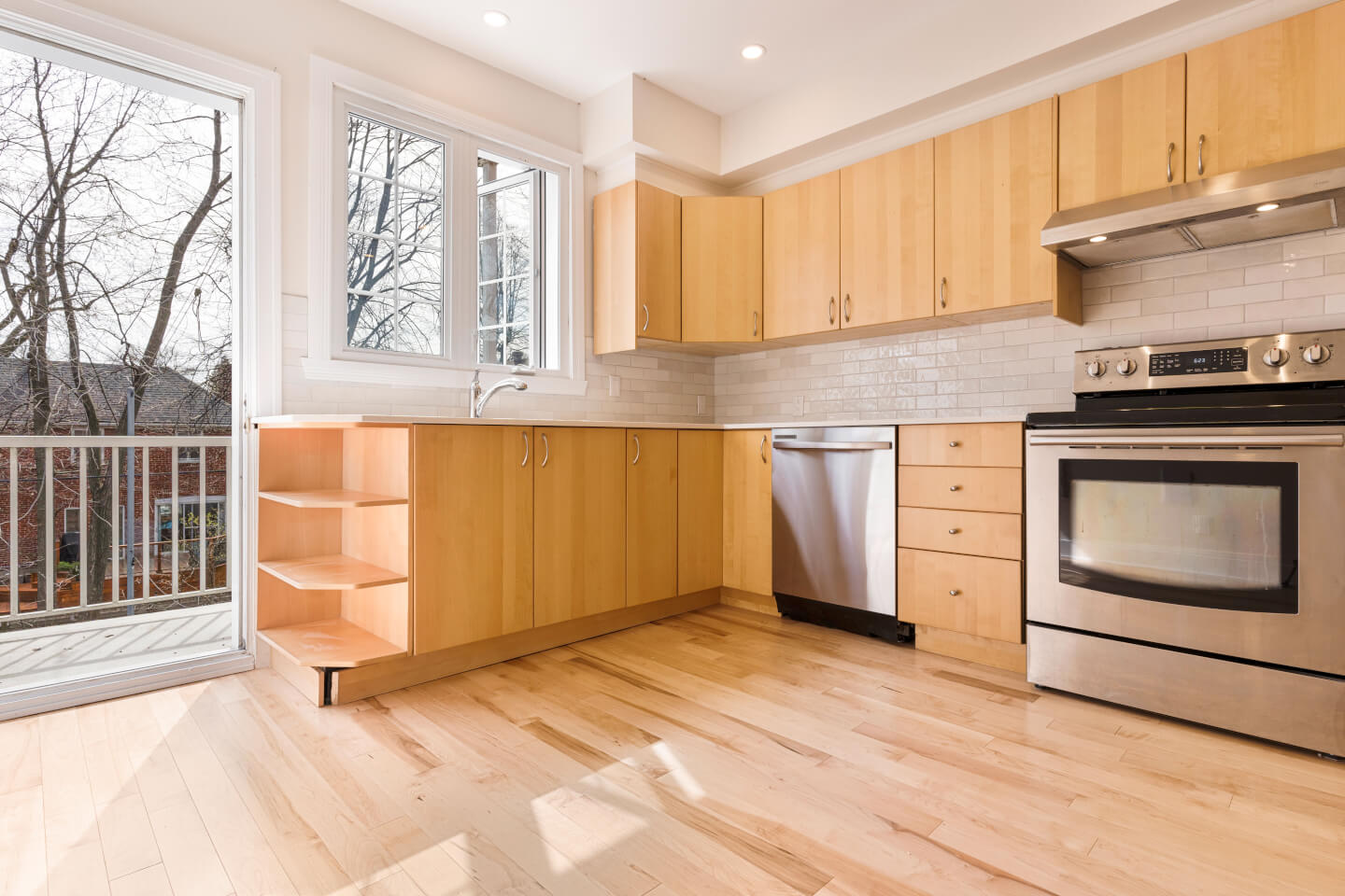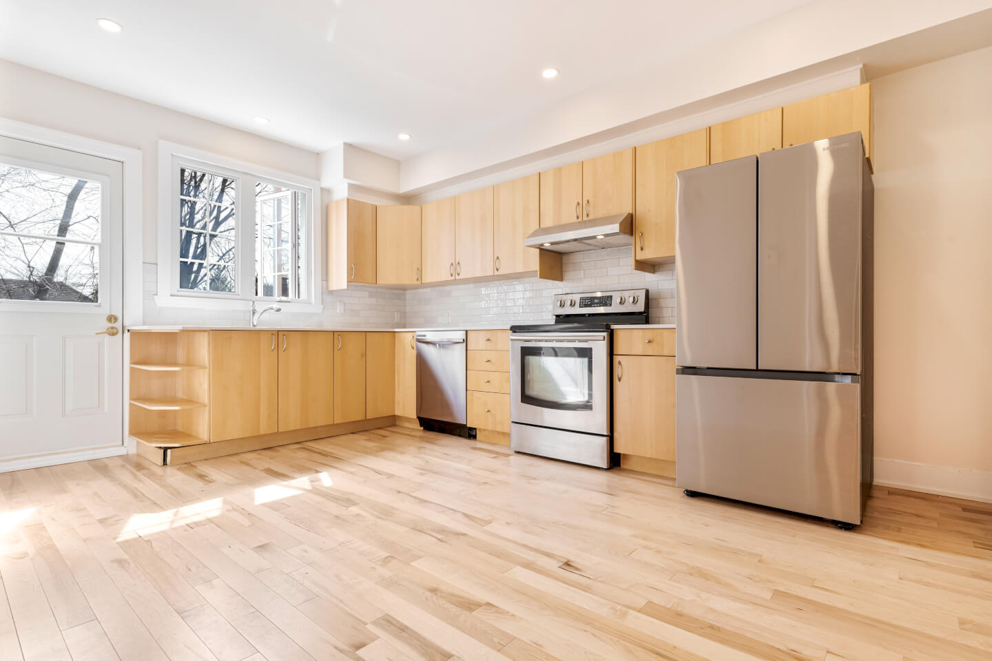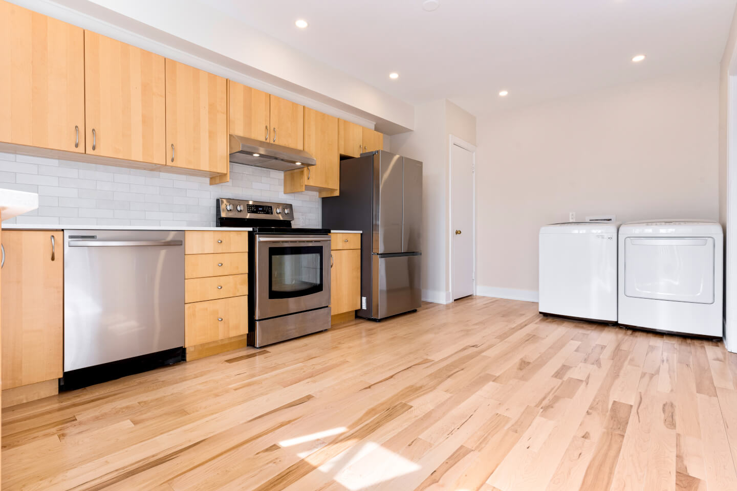 Kitchen, quartz countertop and wooden floor