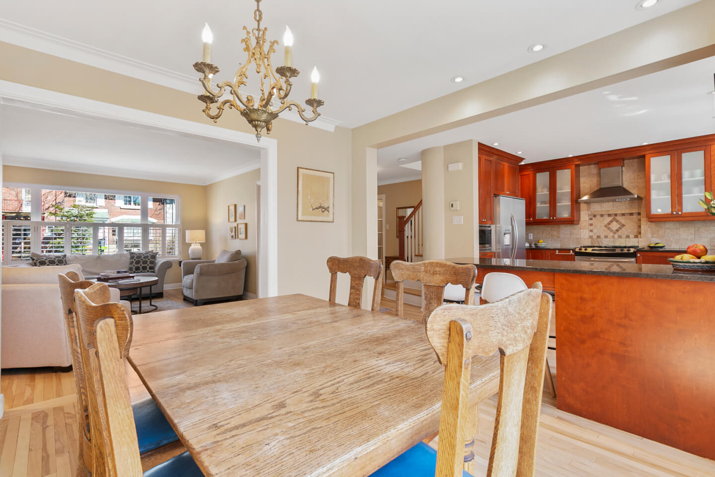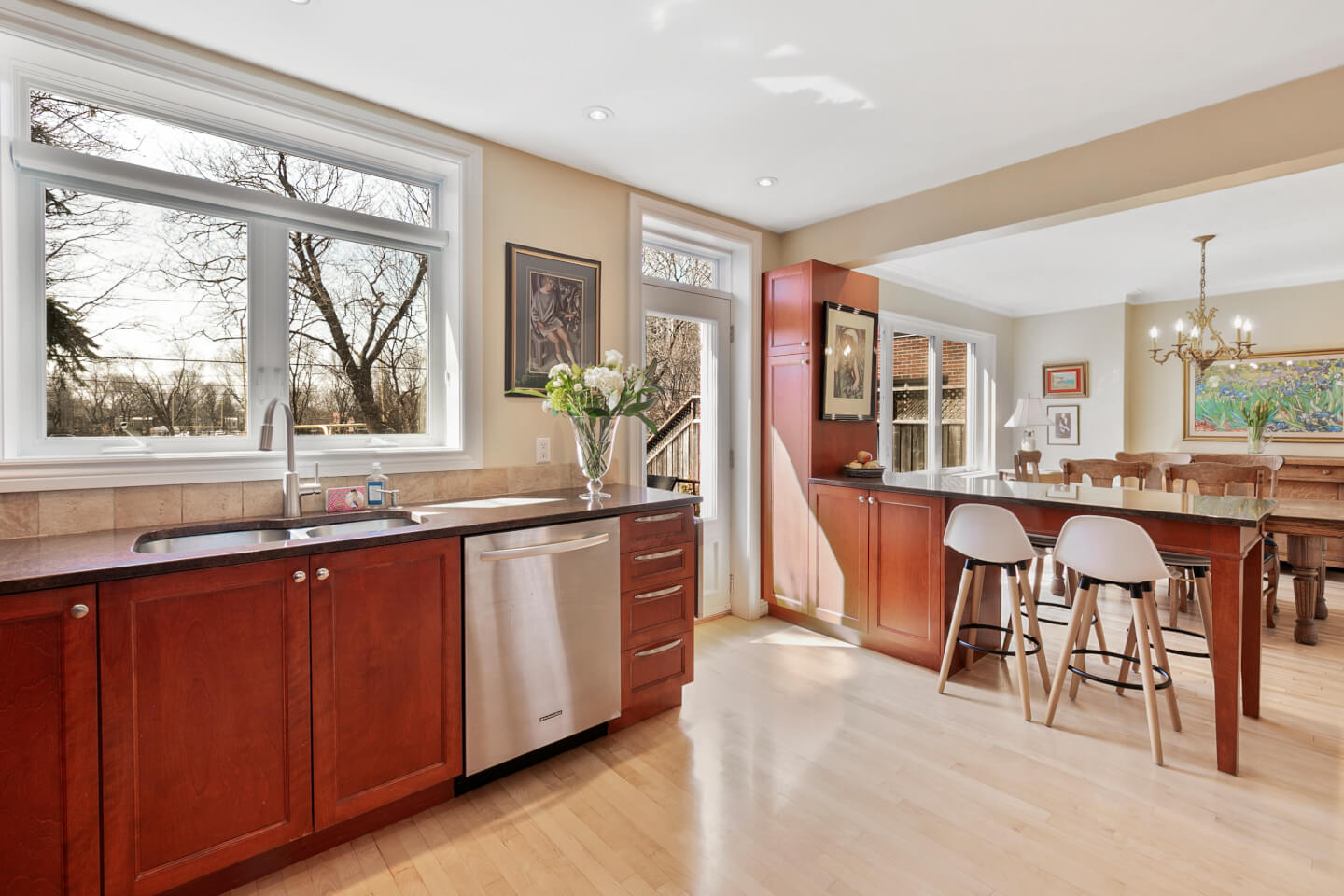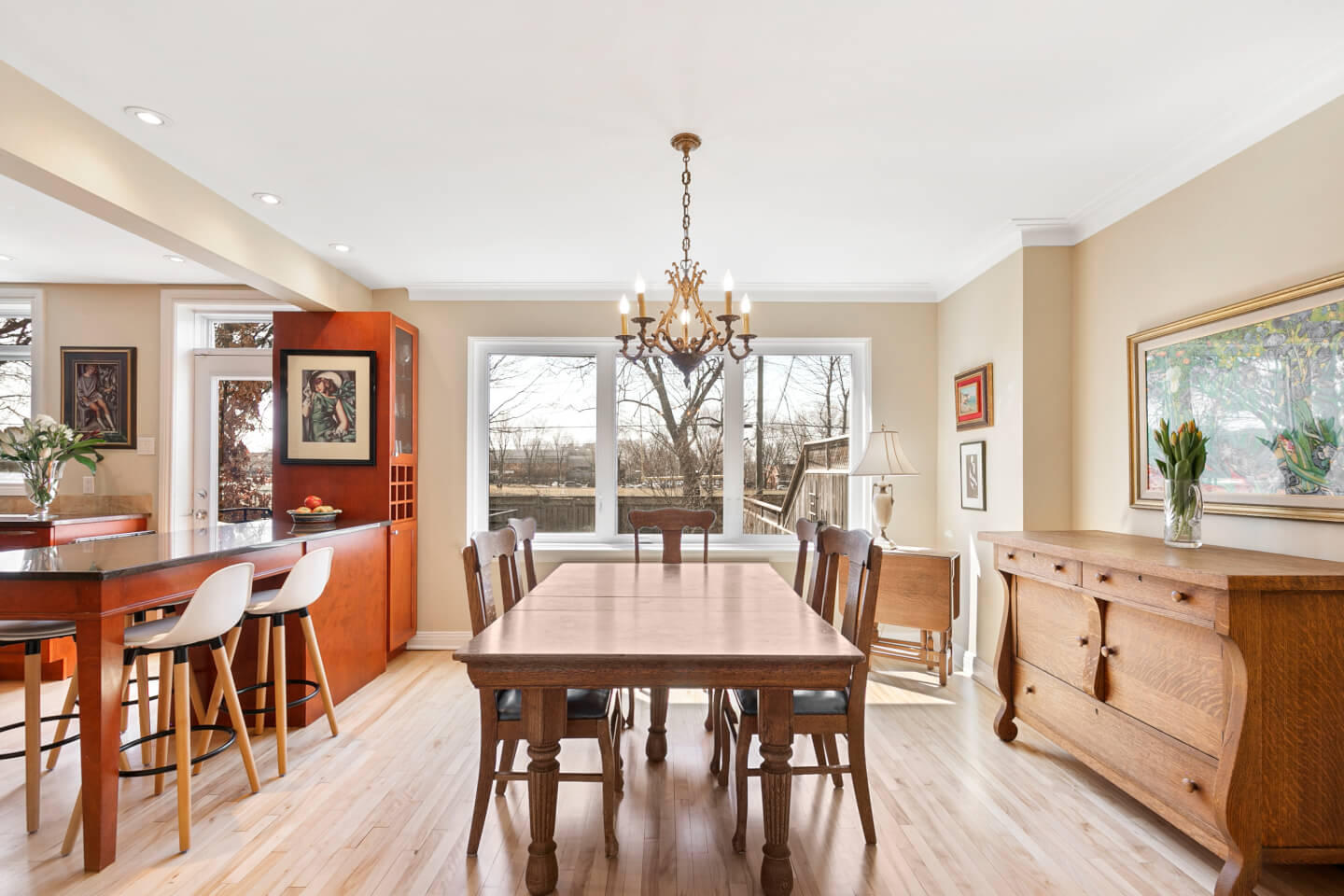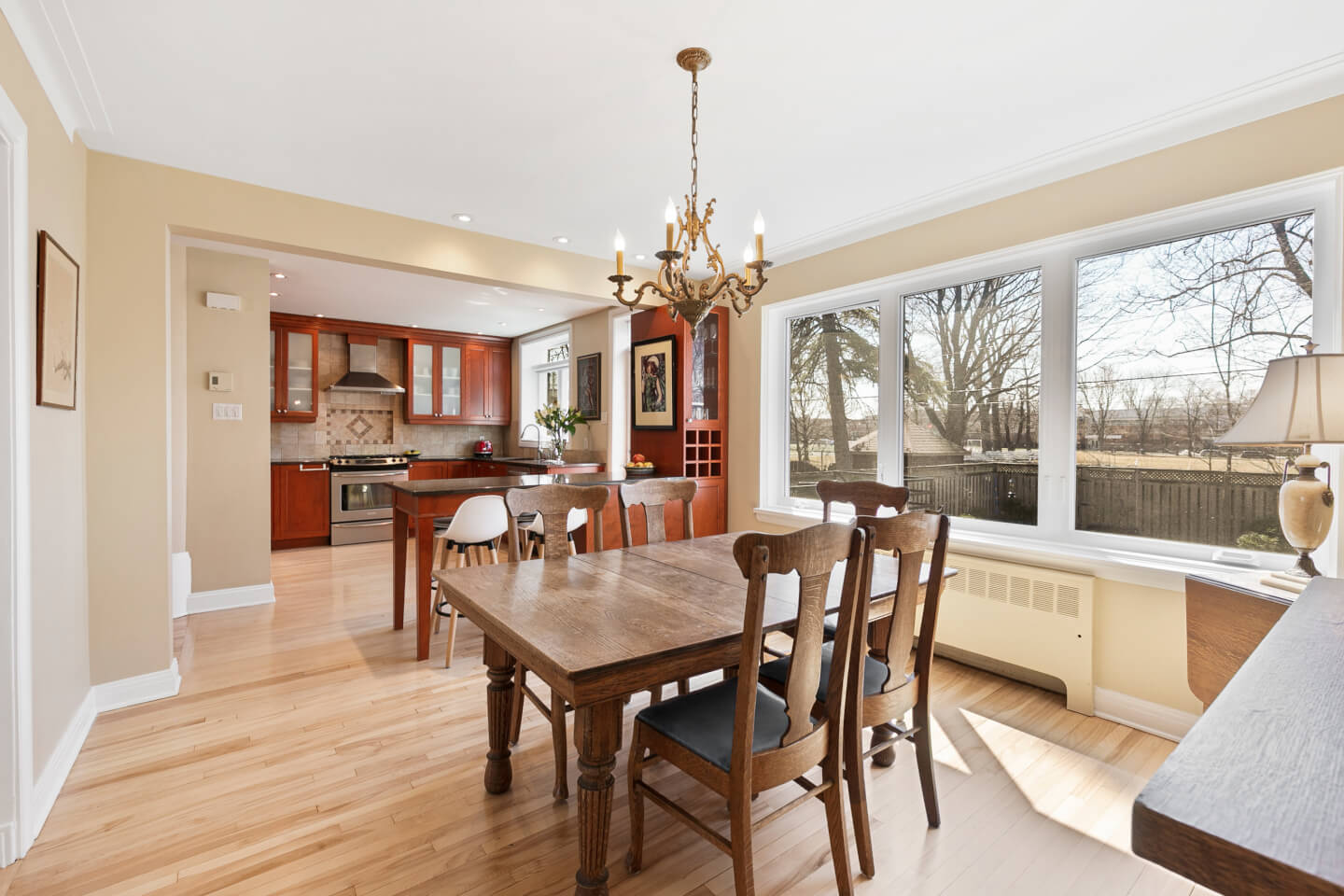 Dining room with large window, open to the kitchen