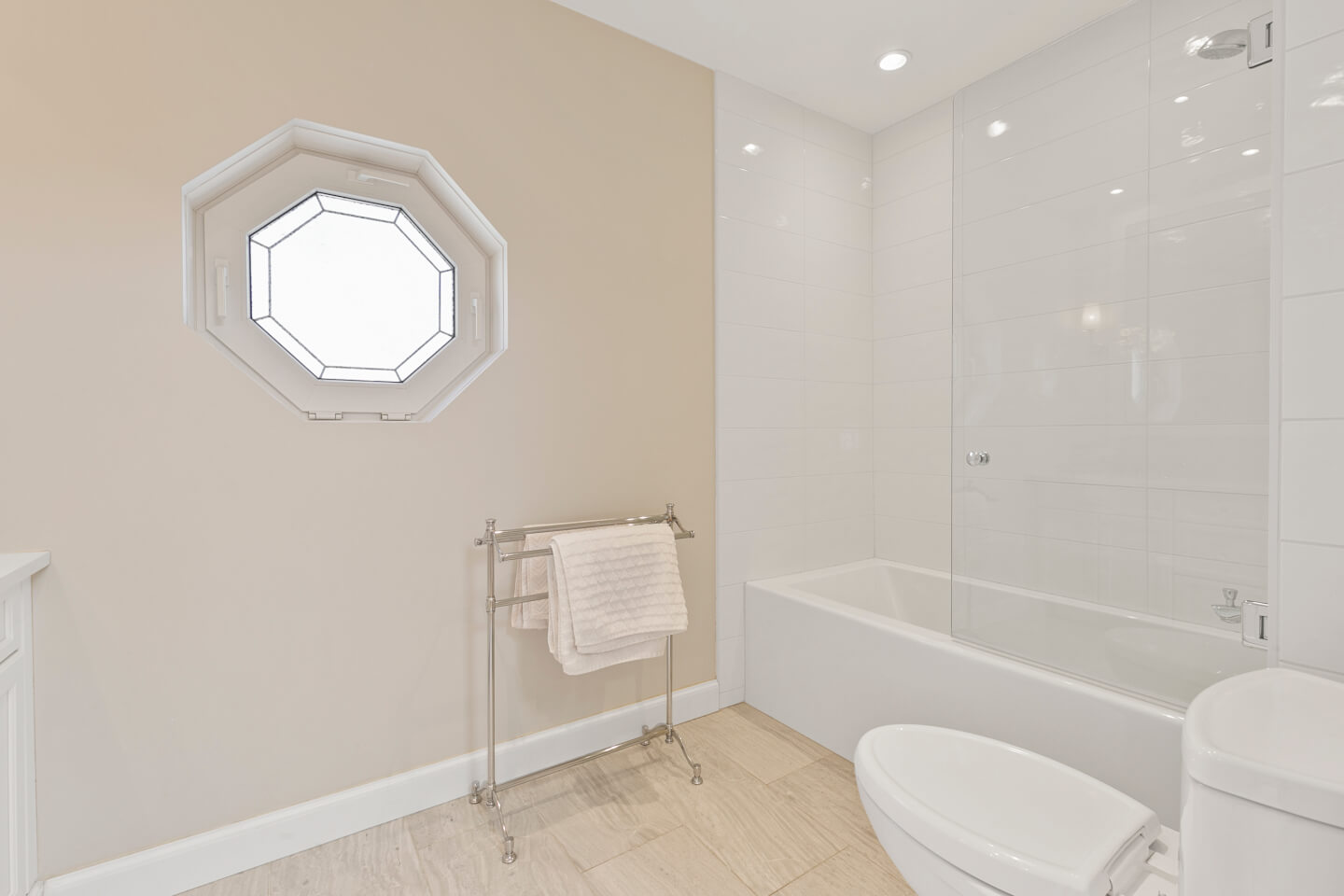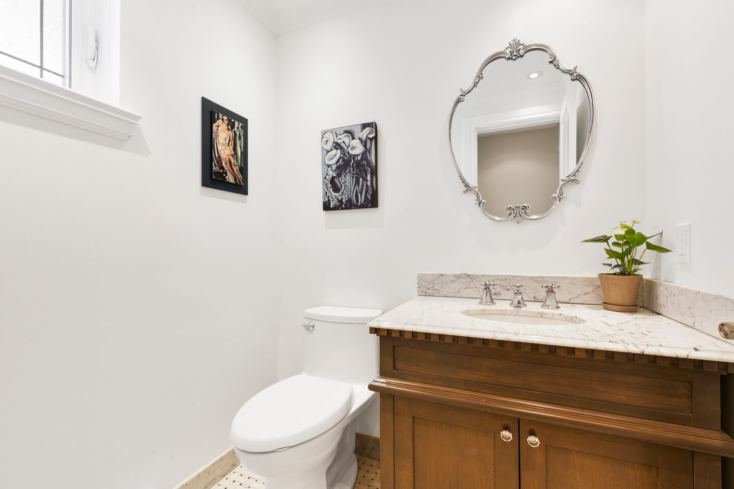Elegant Powder room on radiant ceramic floor