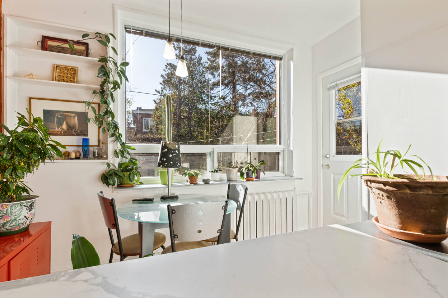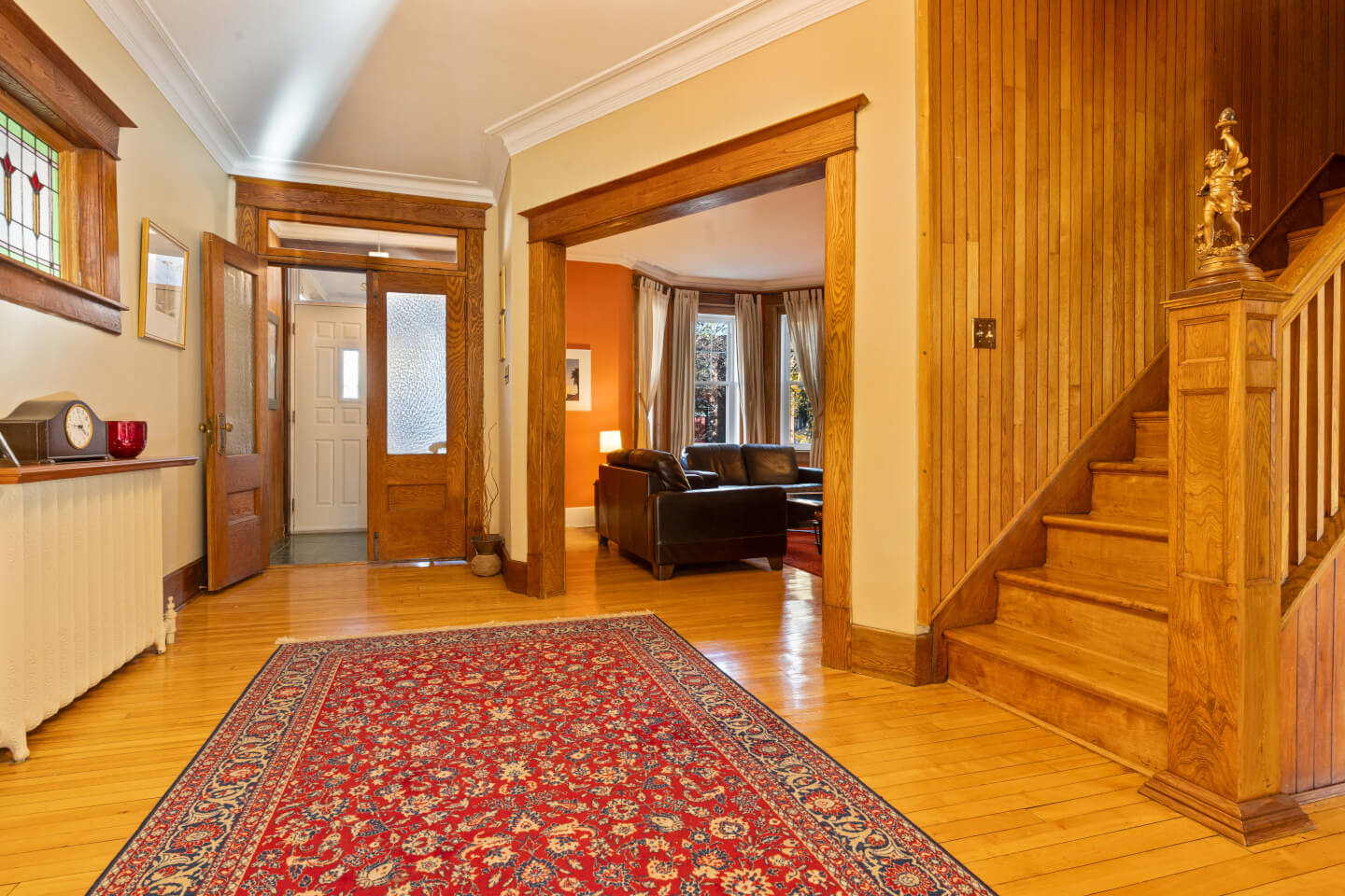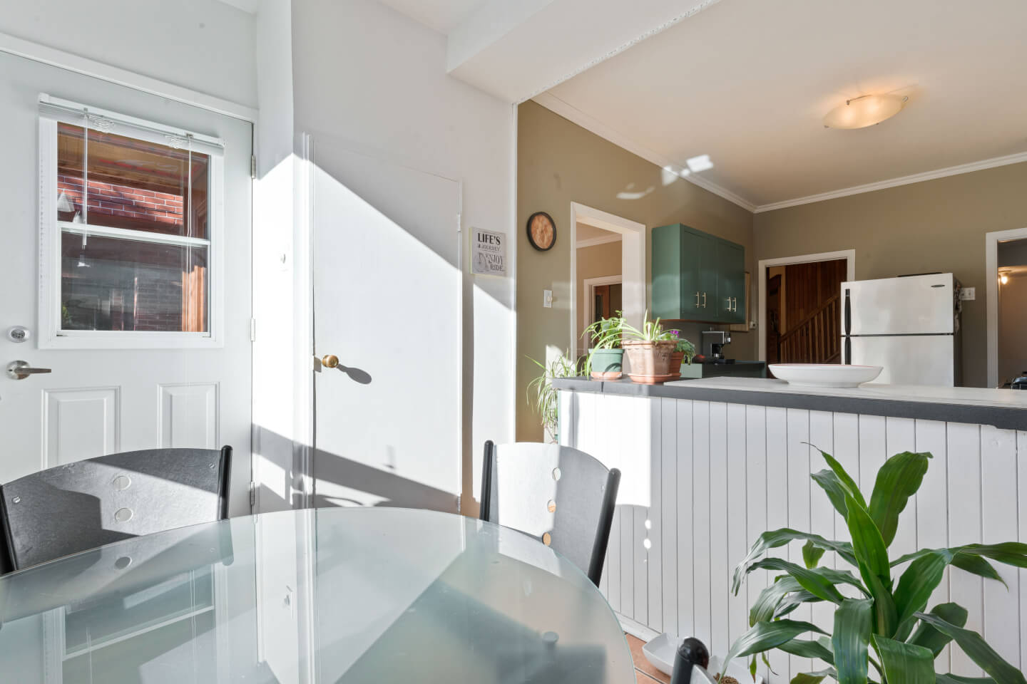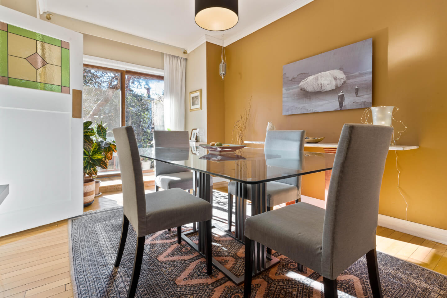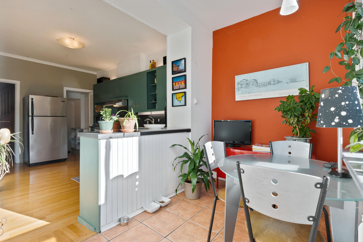 This elegant single-family home with its spacious cross-hall plan, living room and dining room, offers a refreshed 90’s kitchen and open to its sunny dinette.
