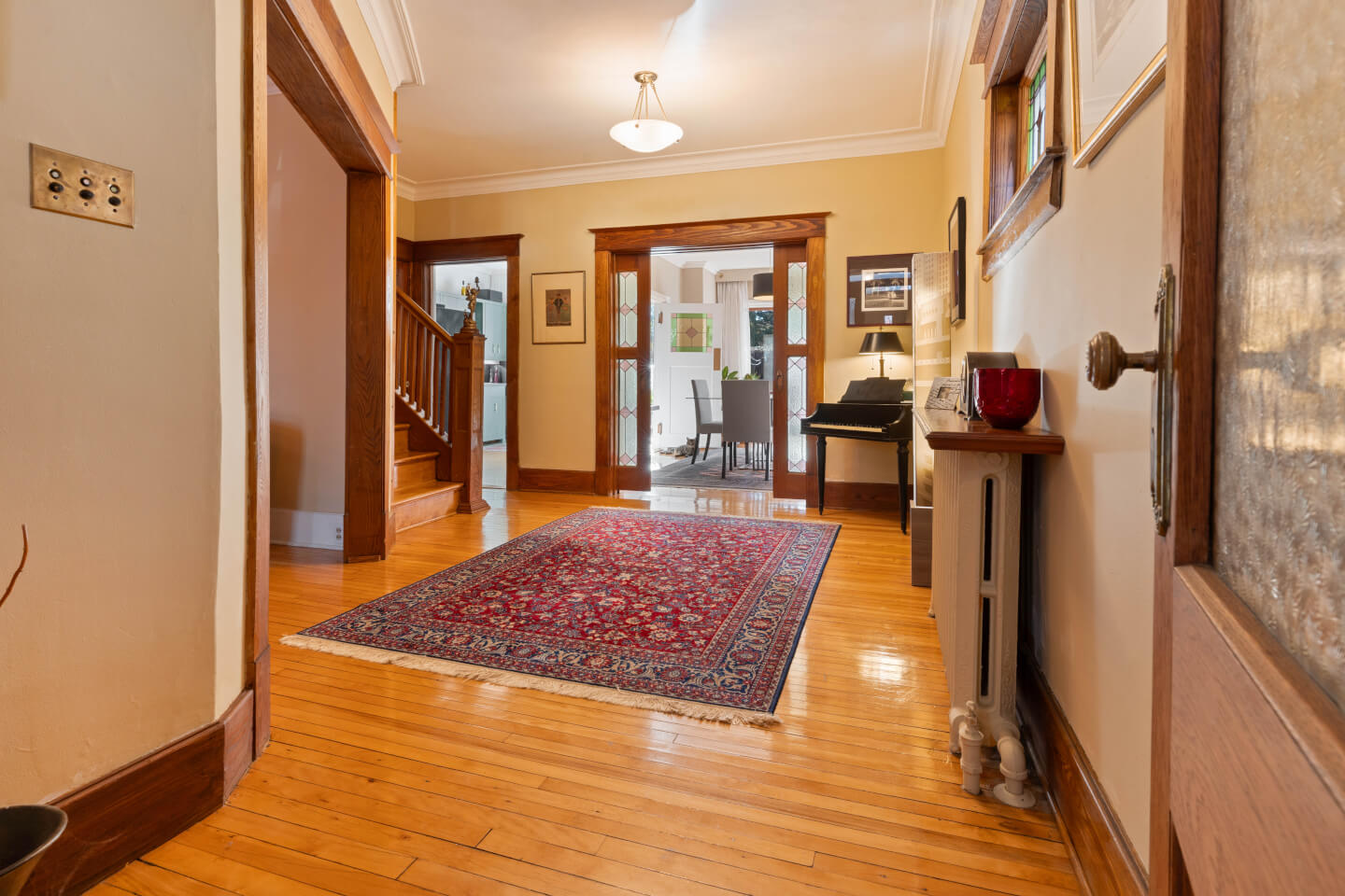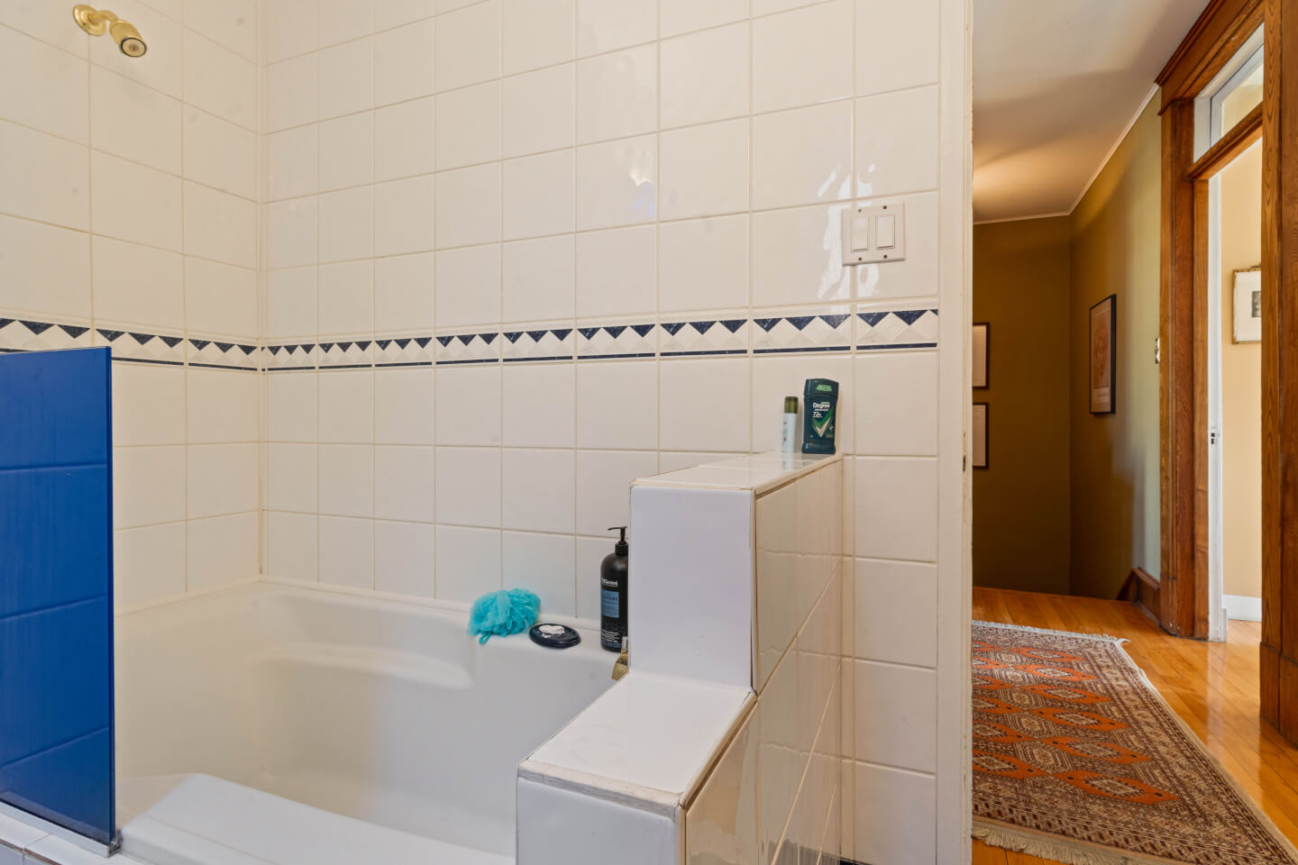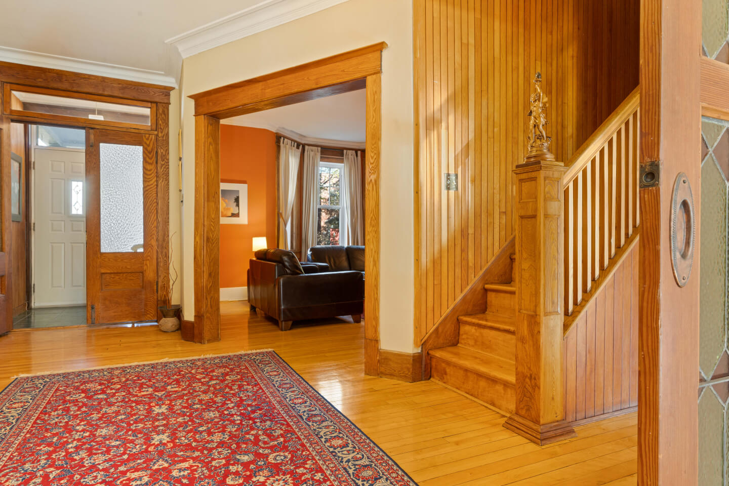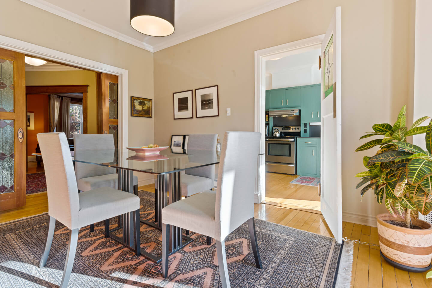 This elegant single-family home with its spacious cross-hall plan, living room and dining room, offers a refreshed 90’s kitchen and open to its sunny dinette.