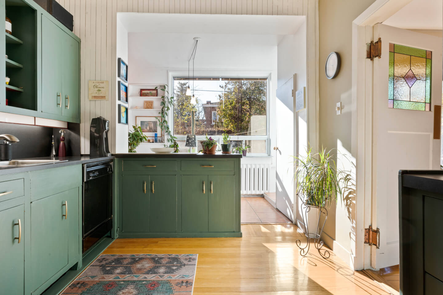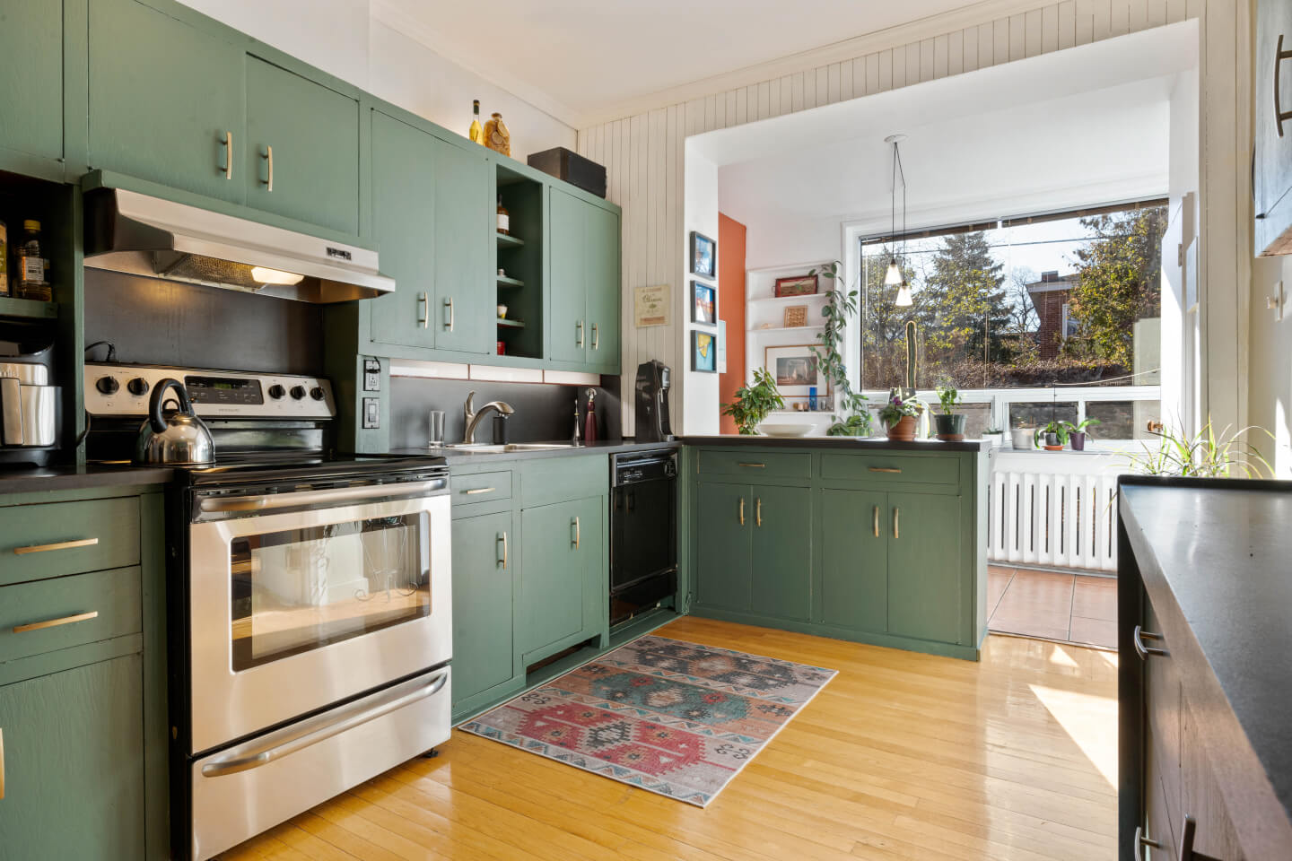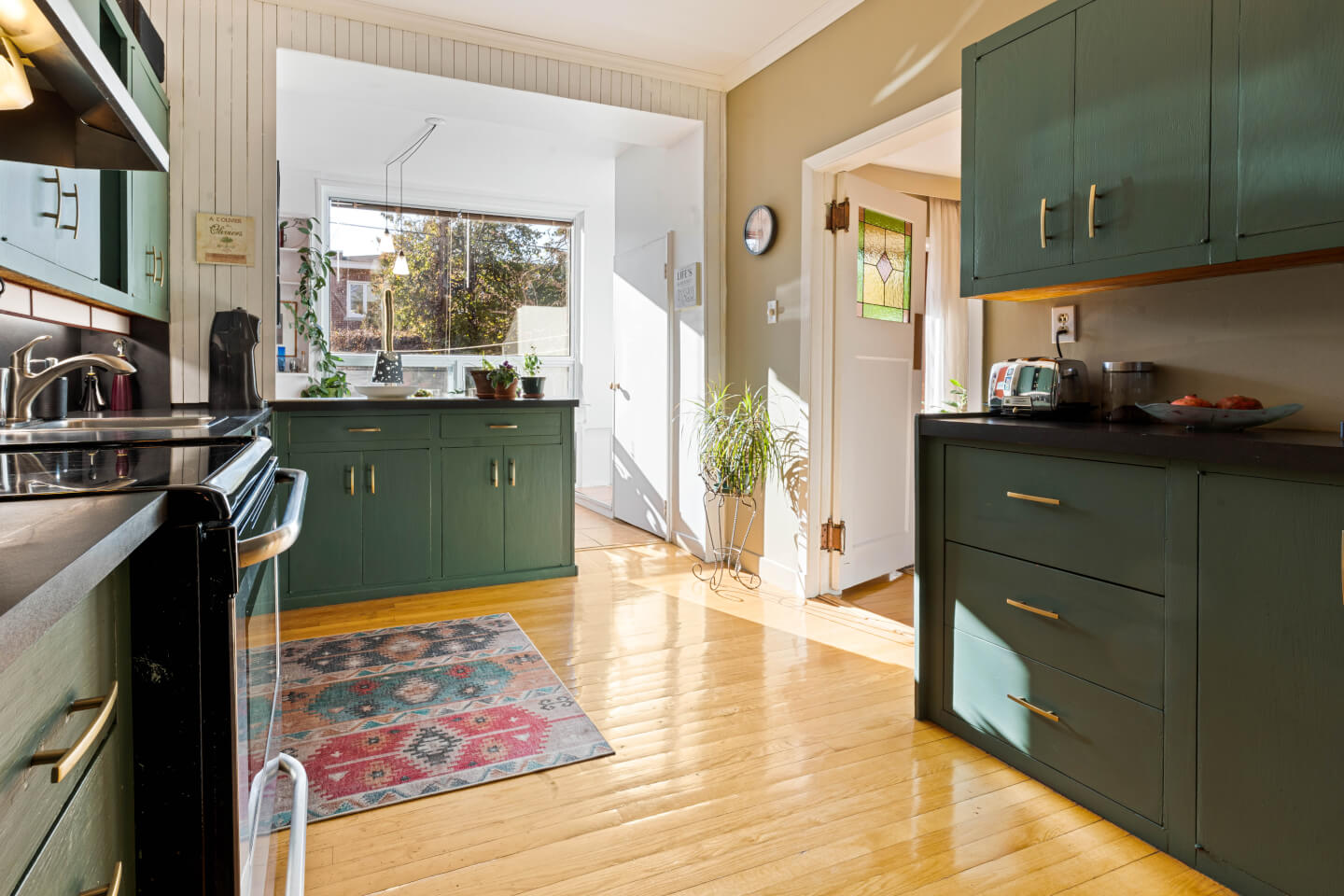 Attractively refreshed kitchen on oak floors, open to its dinette