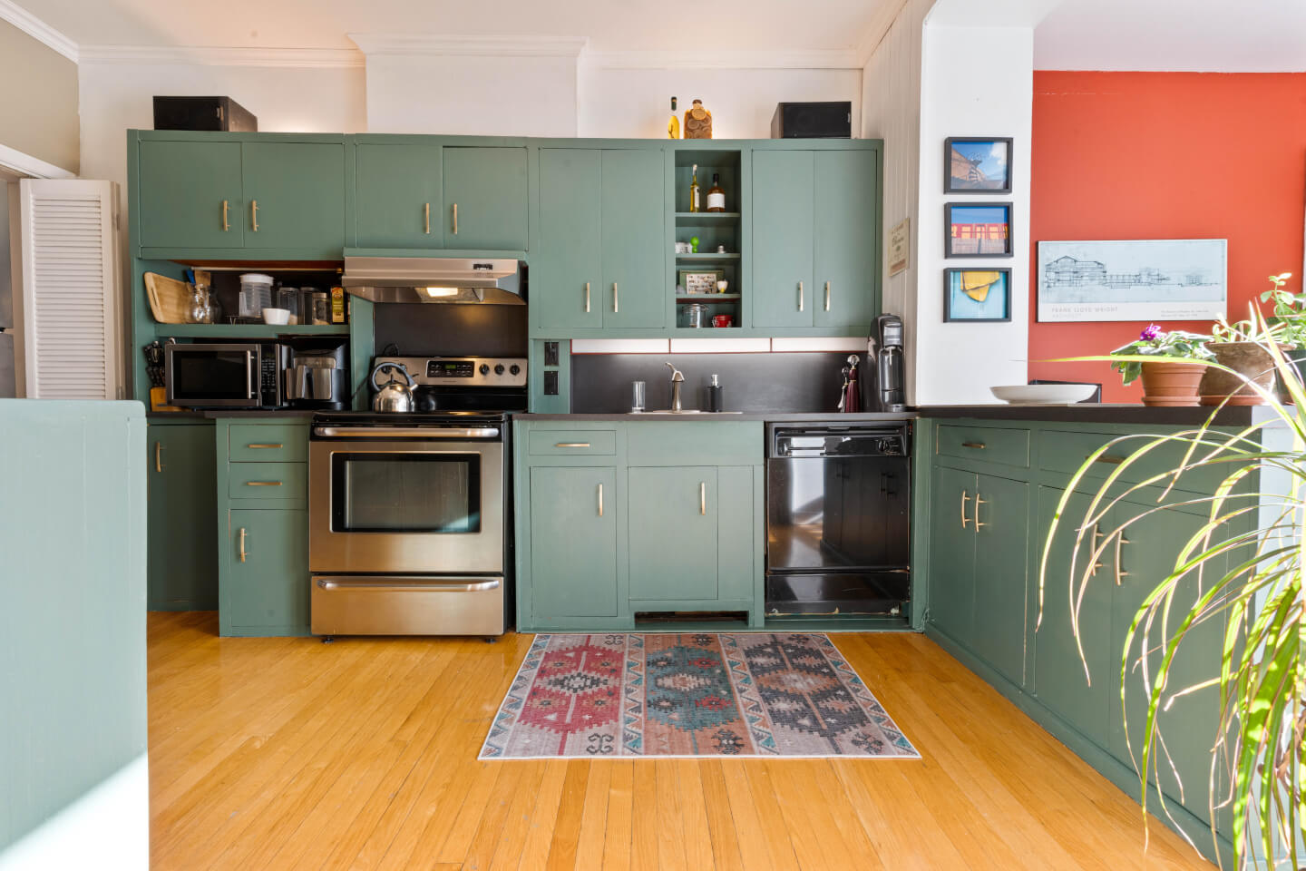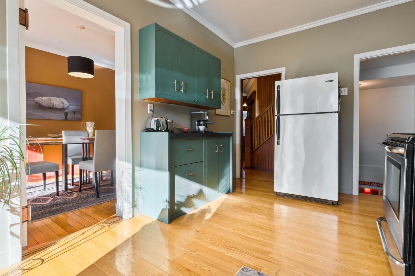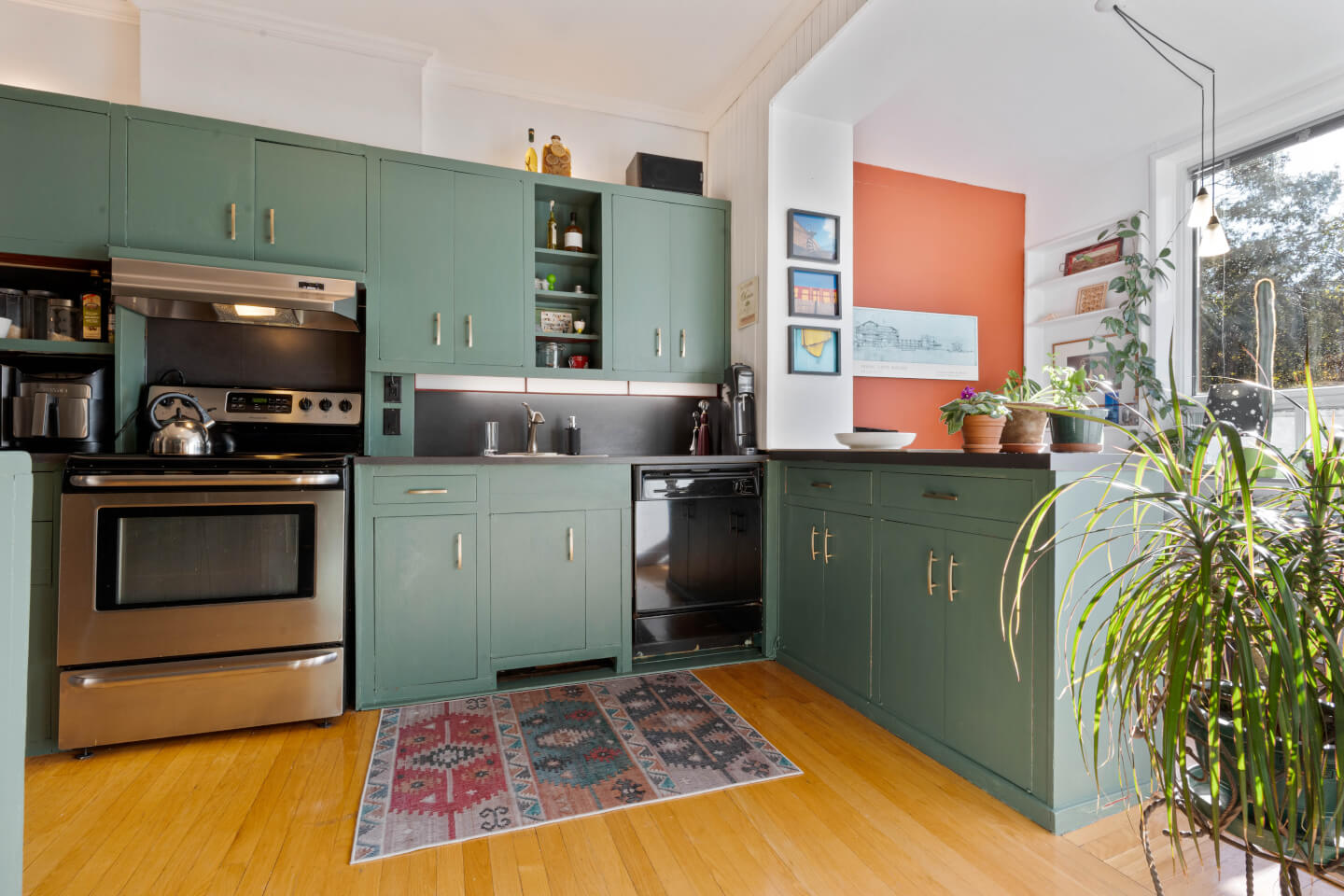 Attractively refreshed kitchen on oak floors, open to its dinette