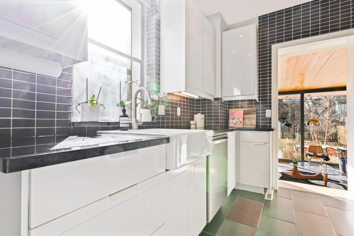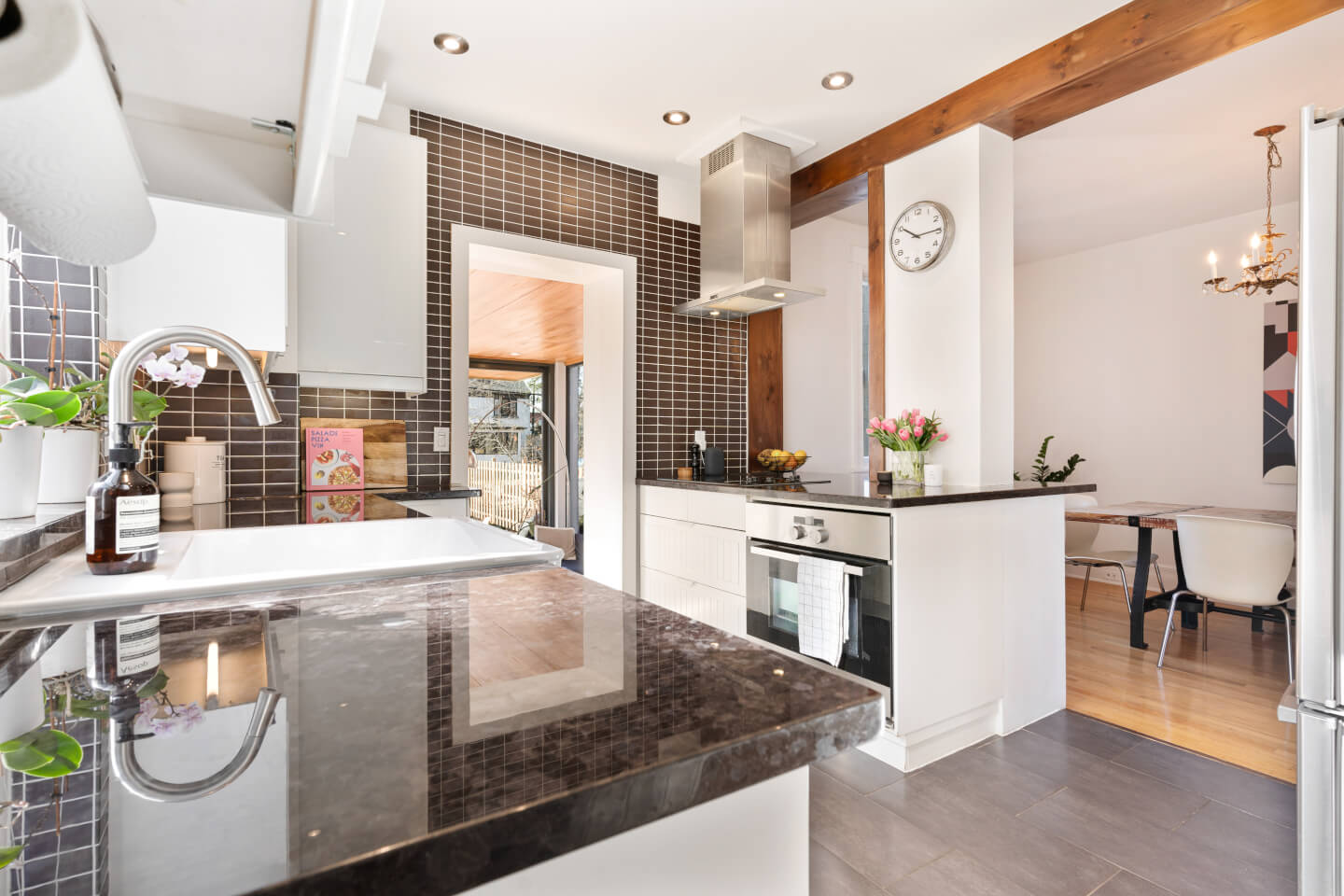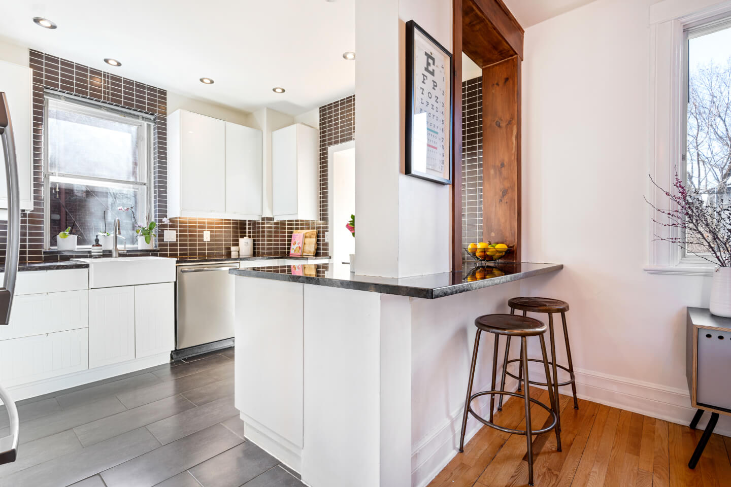 Kitchen, granite countertop, ceramic floor, lunch counter