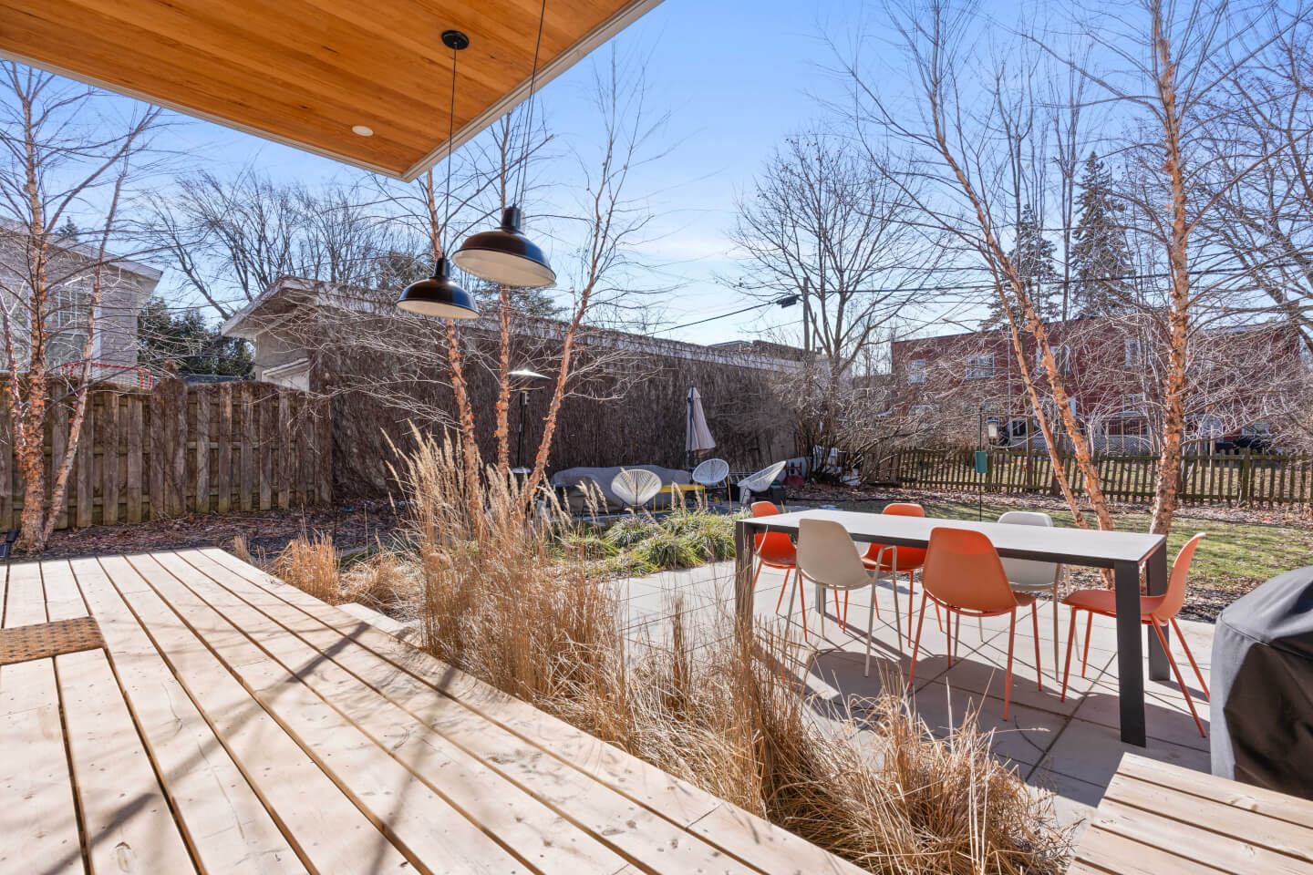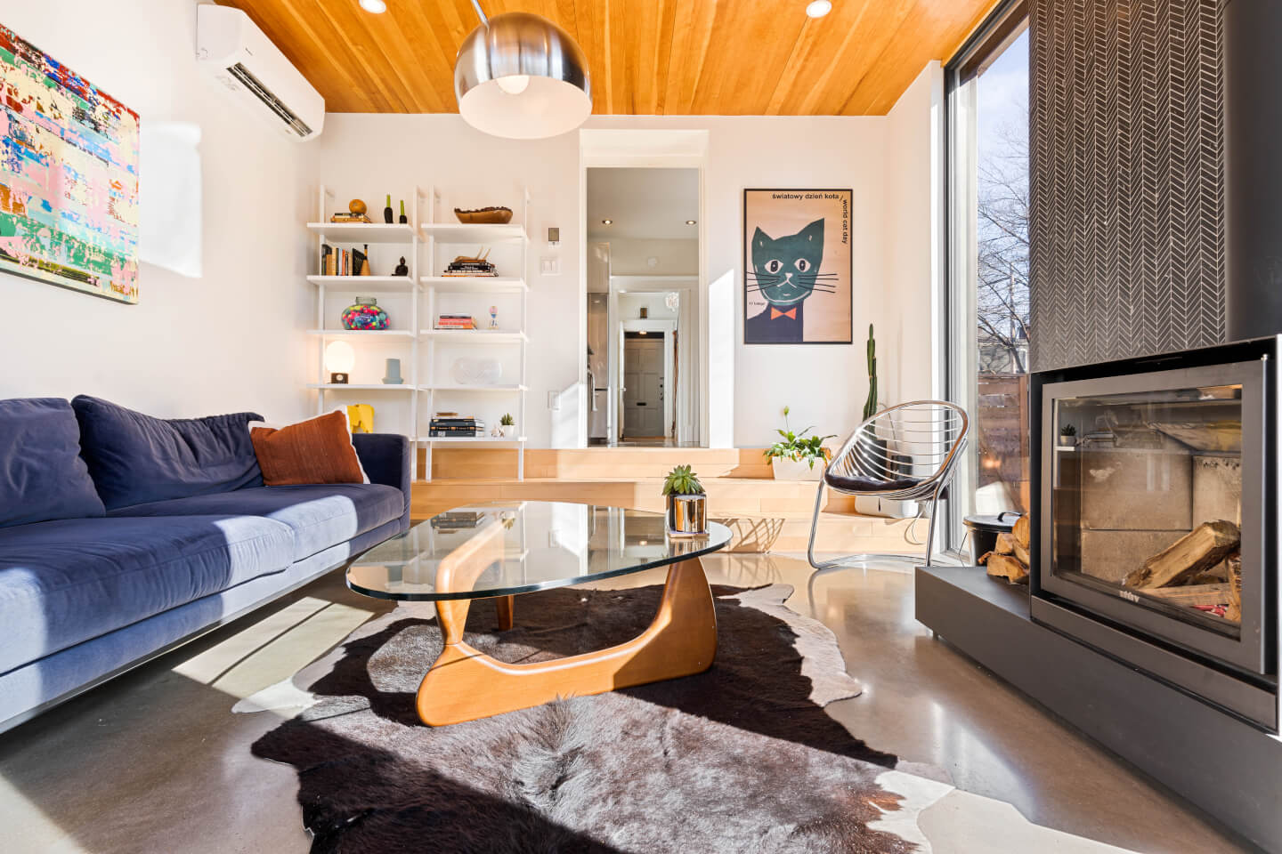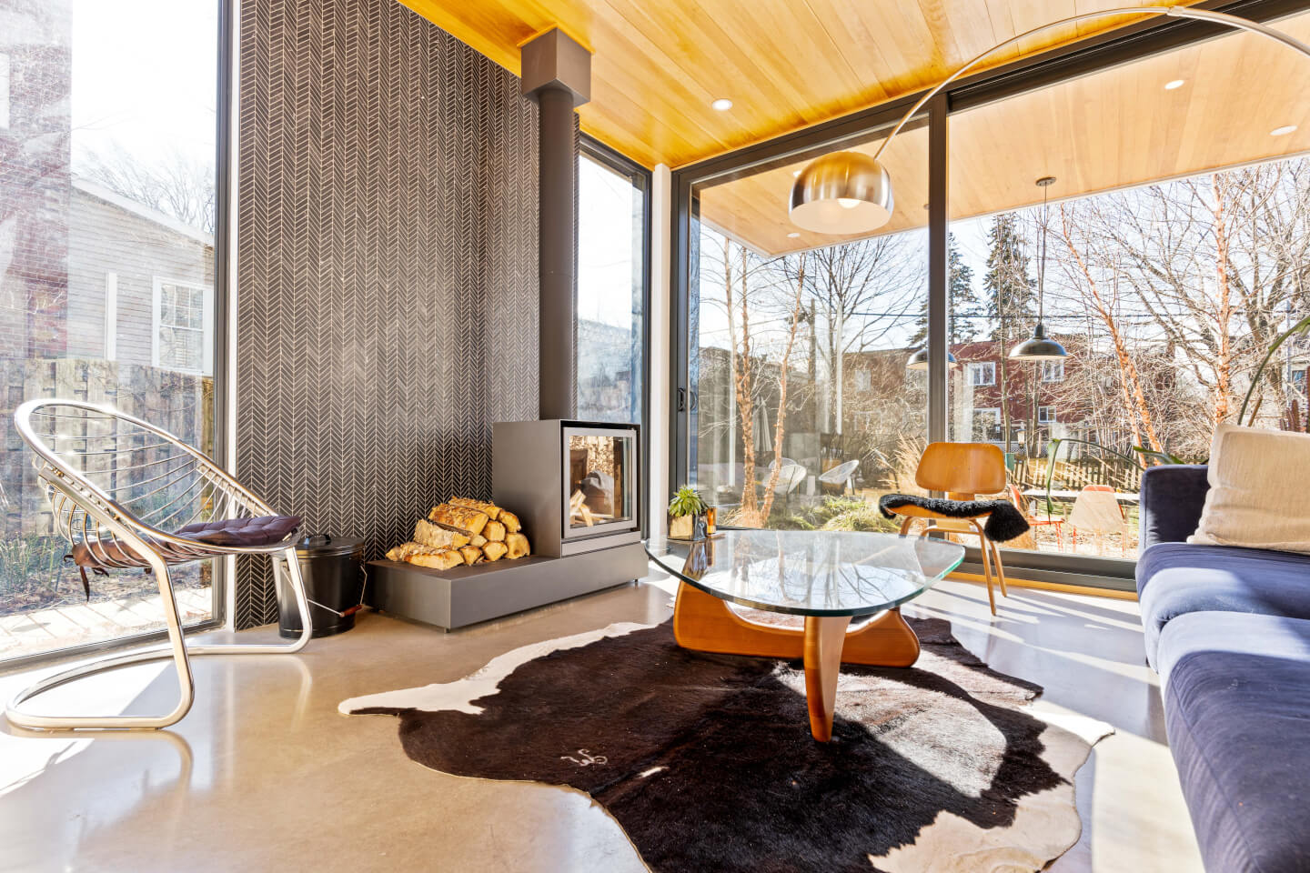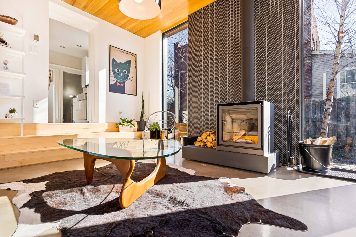 Access to the beautiful family room, heated concrete floor, 2020 wood fireplace in accordance with city regulations, A/C, wall-to-wall fenestration for total immersion in the landscaped garden