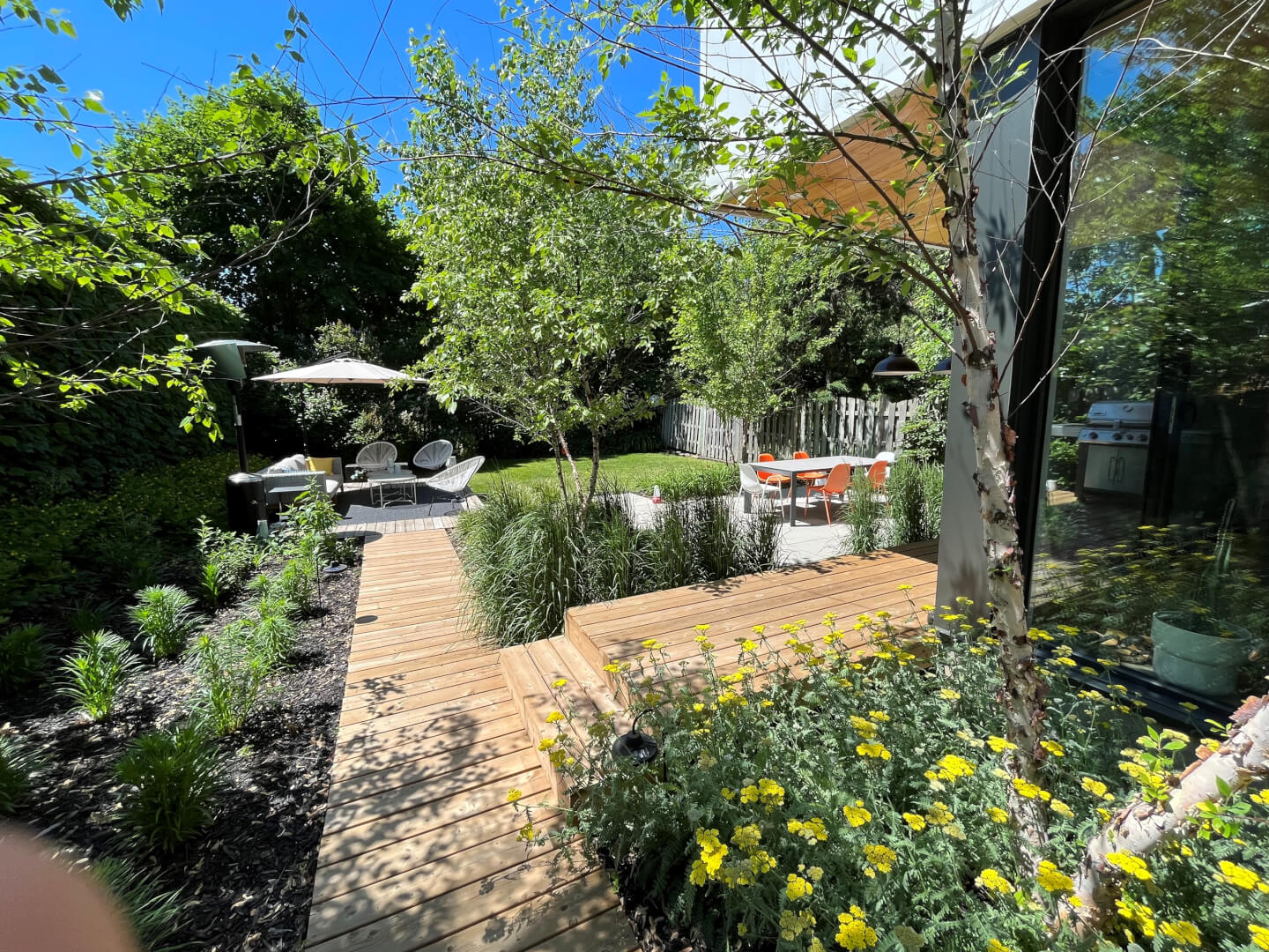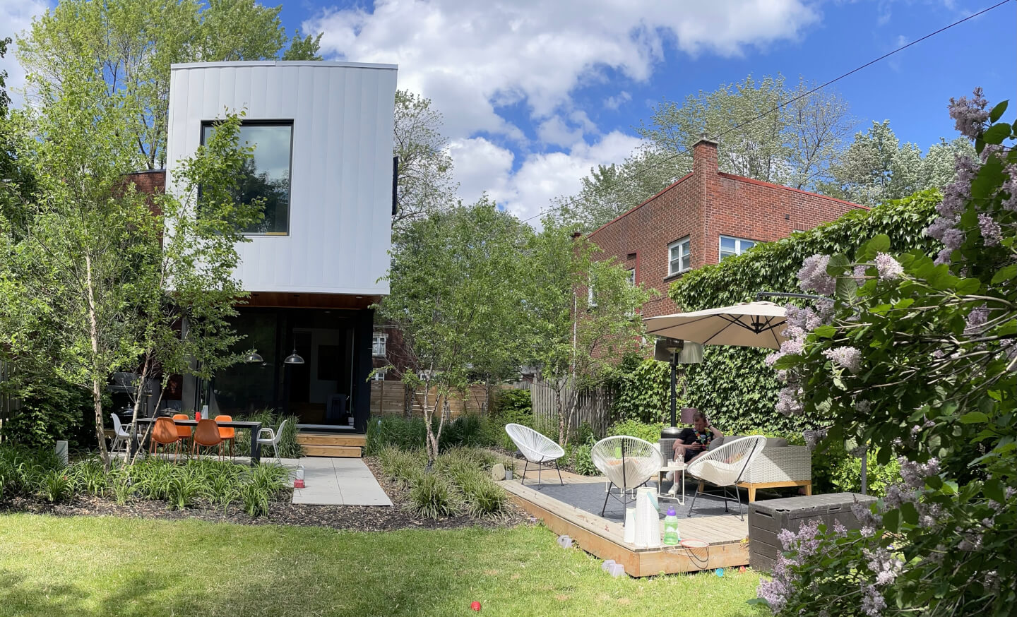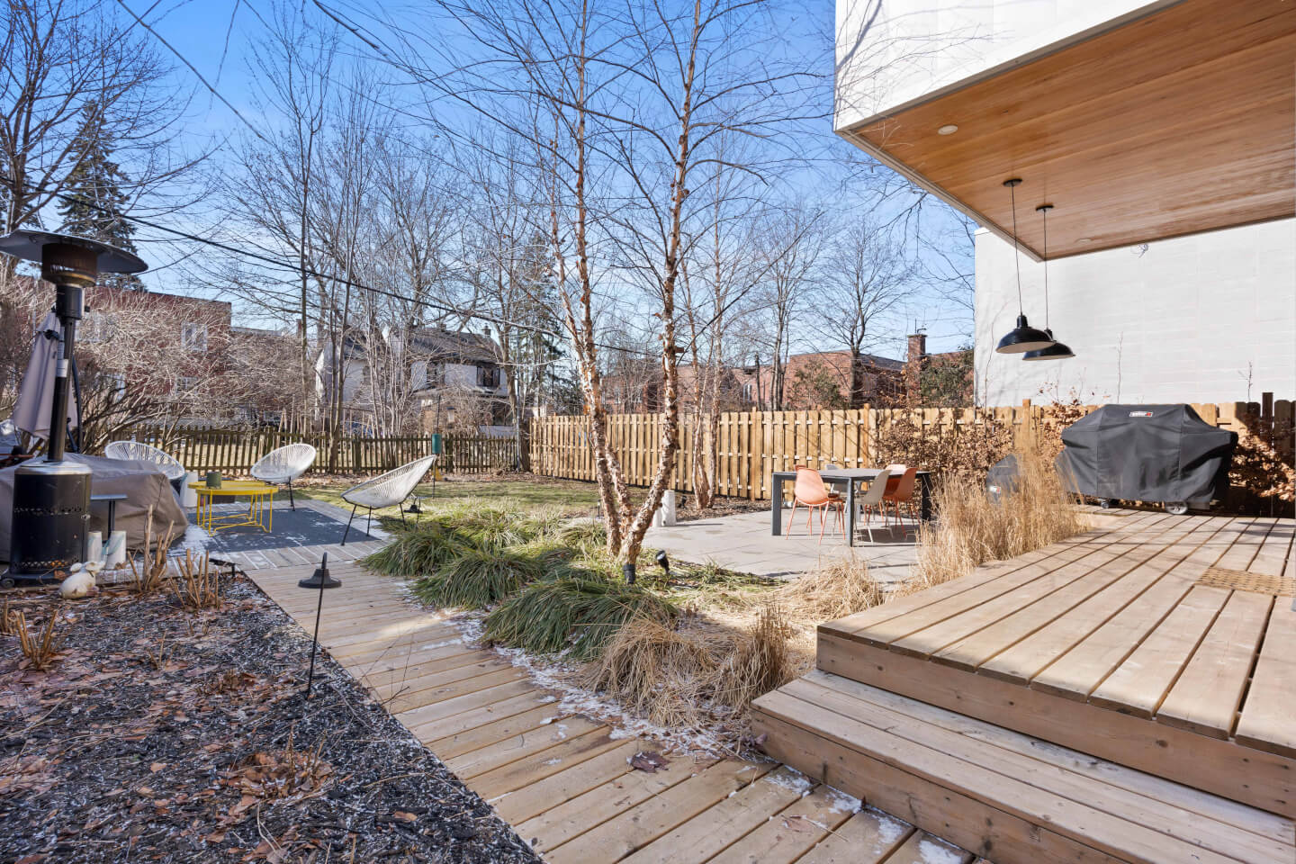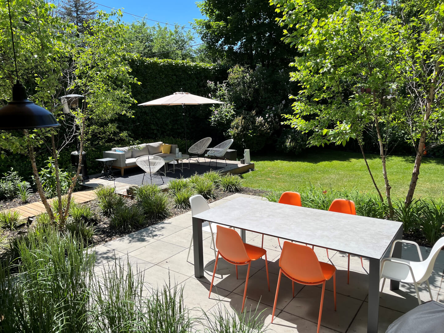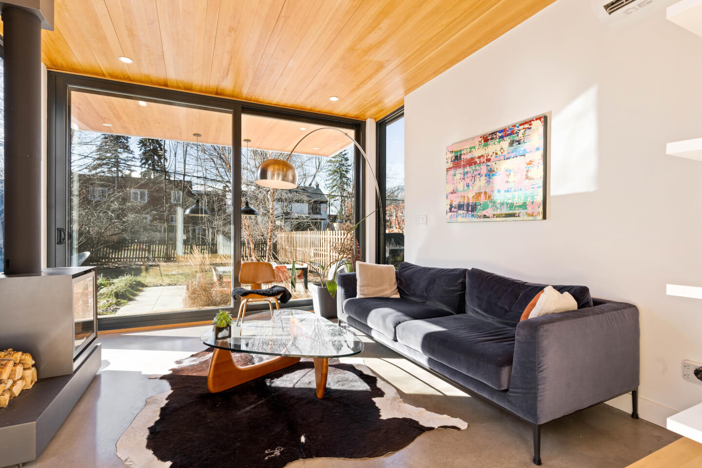 Access to the beautiful family room, heated concrete floor, 2020 wood fireplace in accordance with city regulations, A/C, wall-to-wall fenestration for total immersion in the landscaped garden