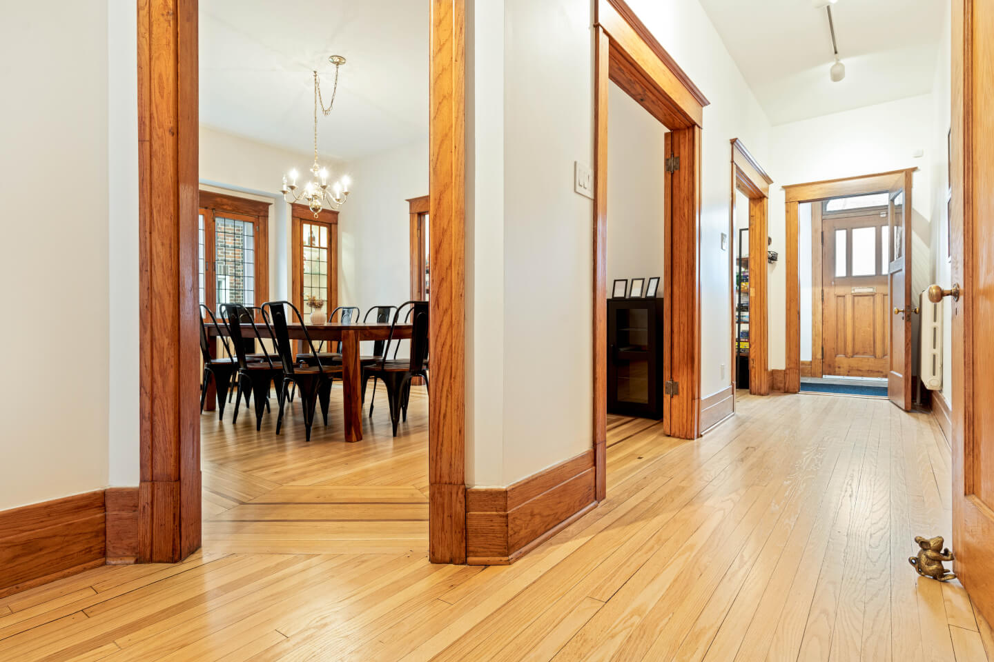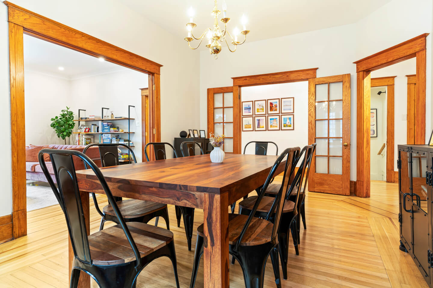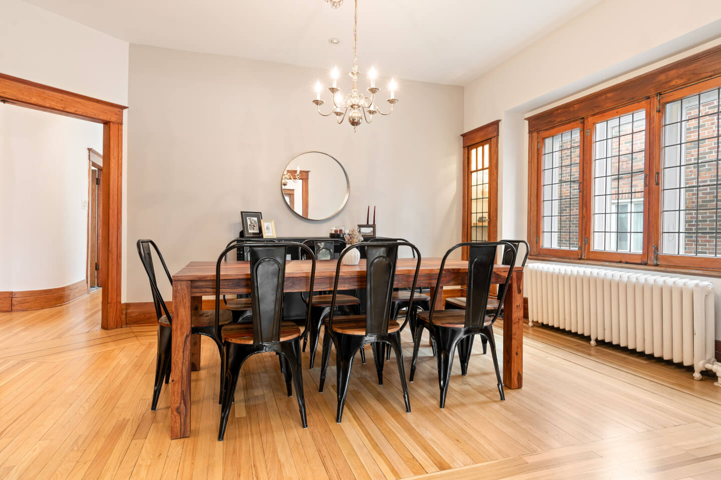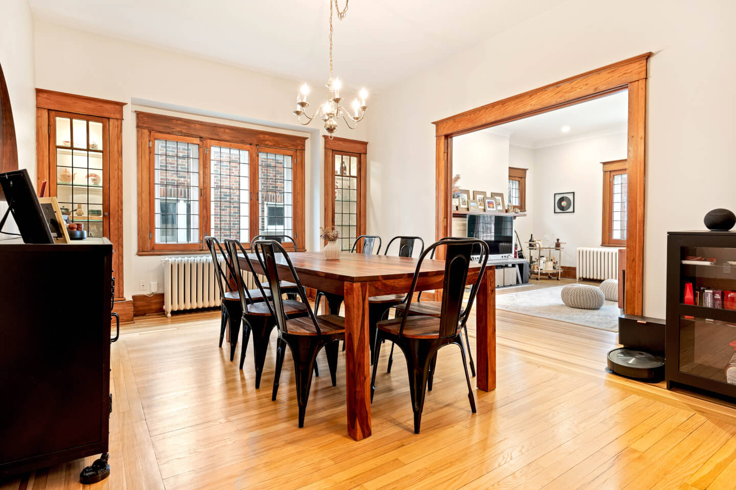 Dining room, built-in cabinet, oak floor, and mahogany insert