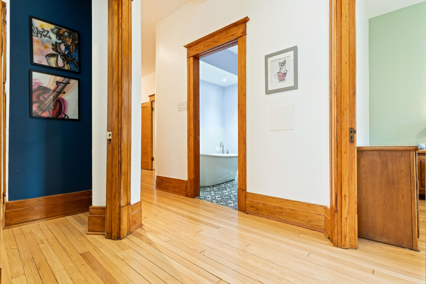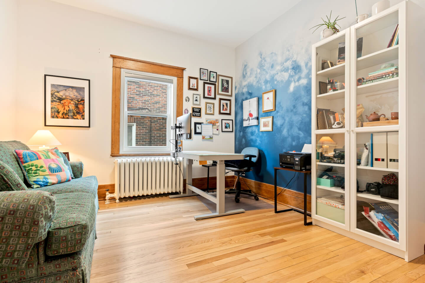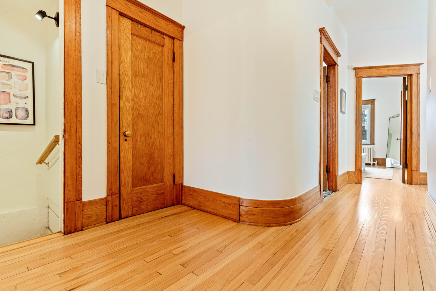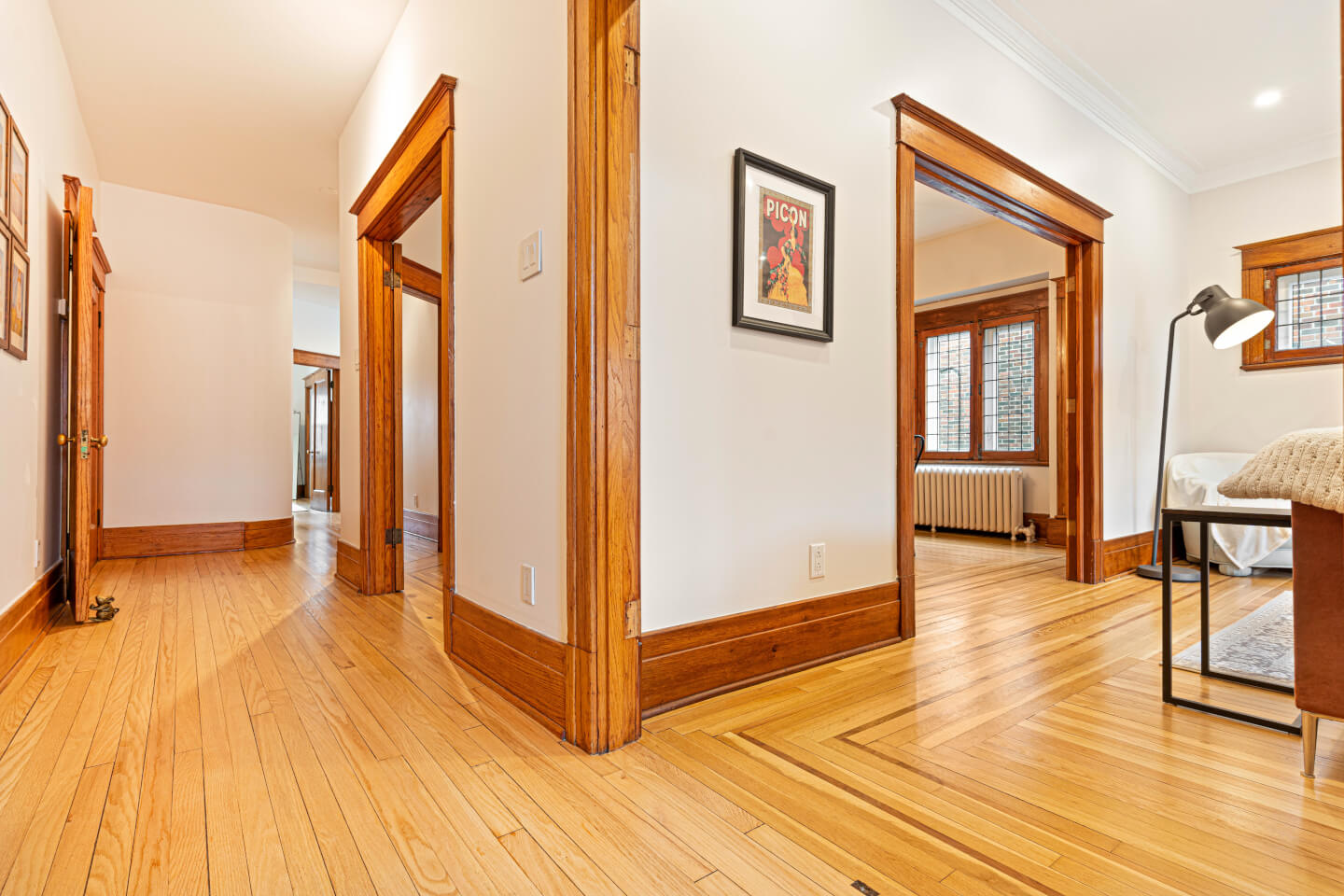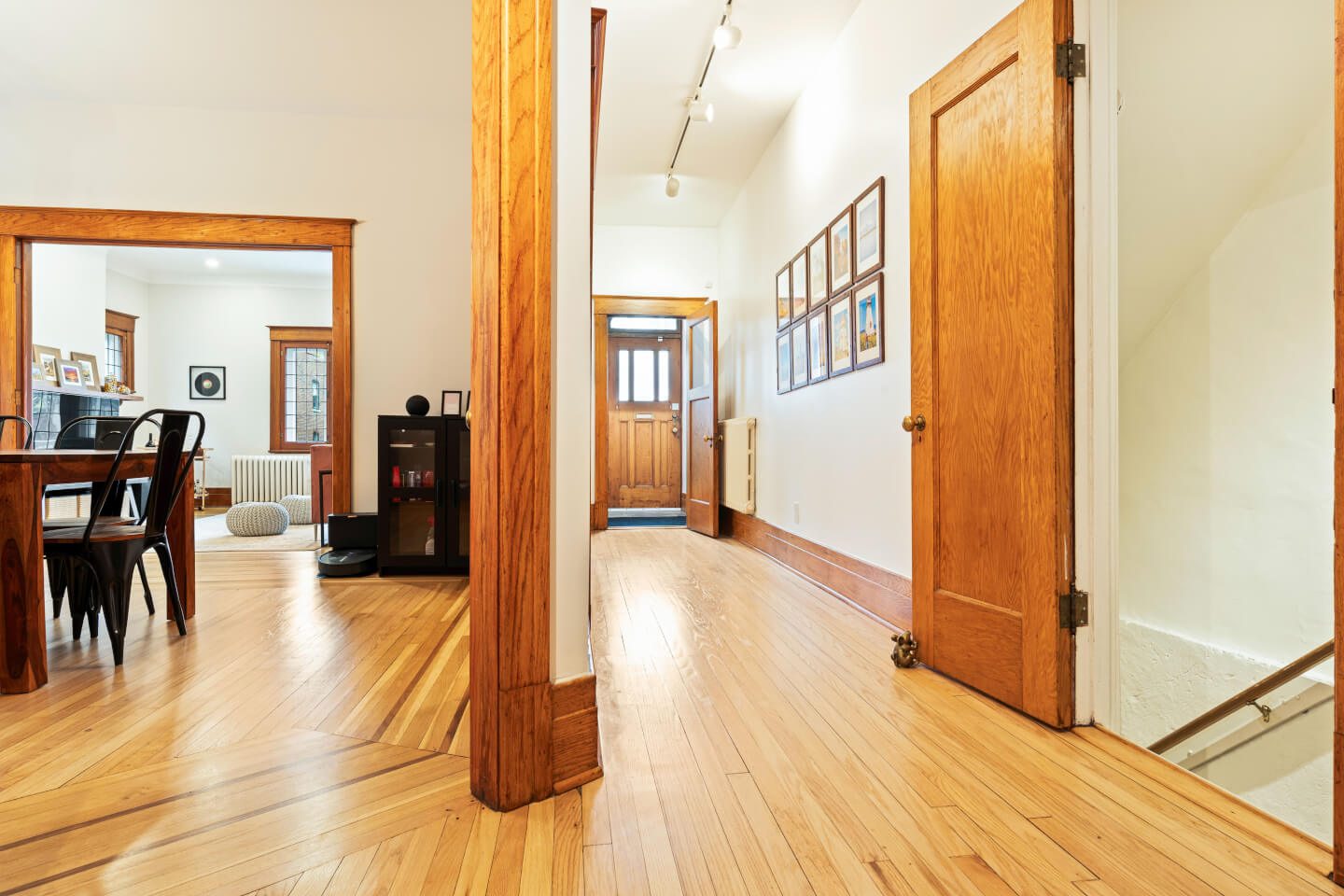 Dining room, built-in cabinet, oak floor, and mahogany insert
