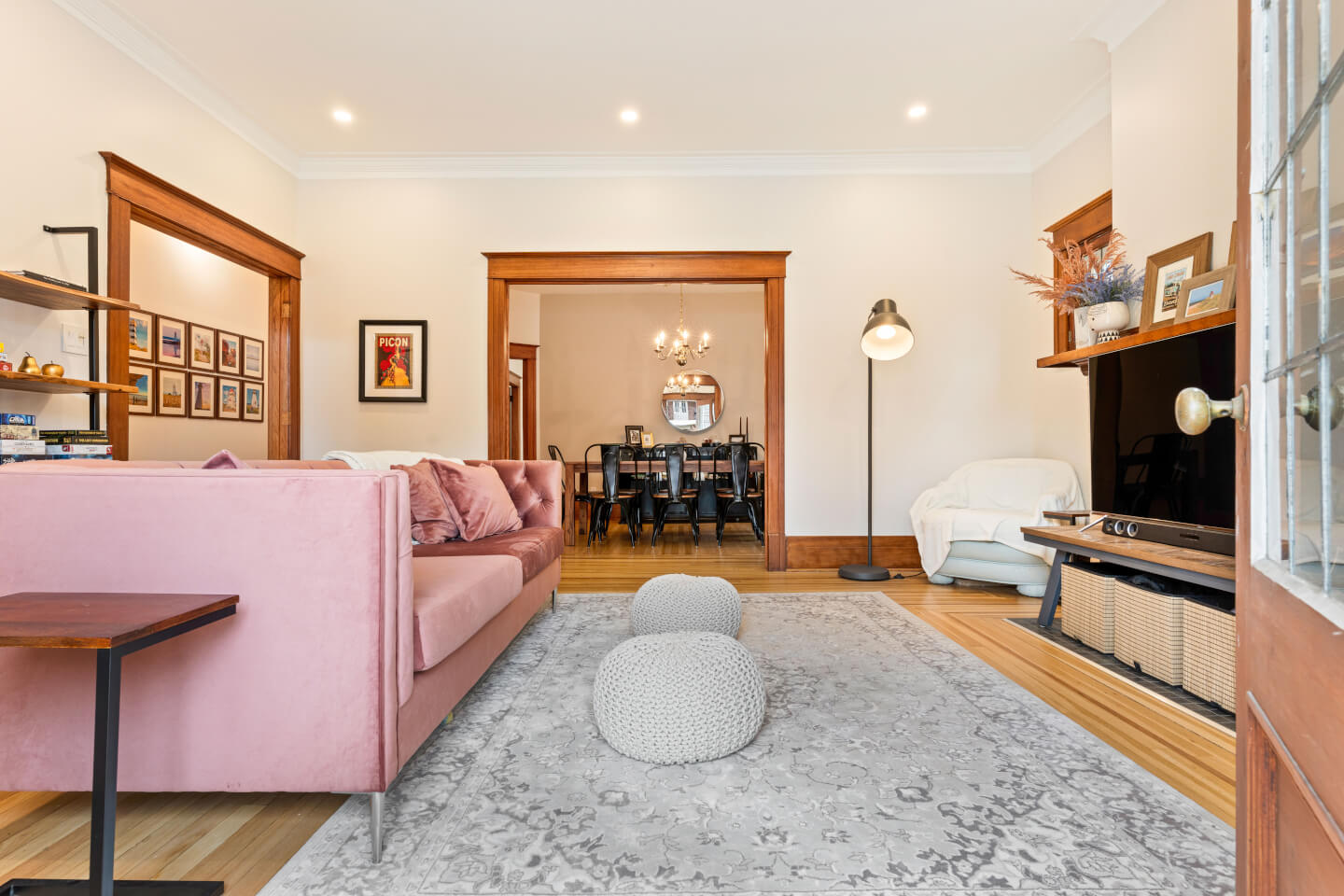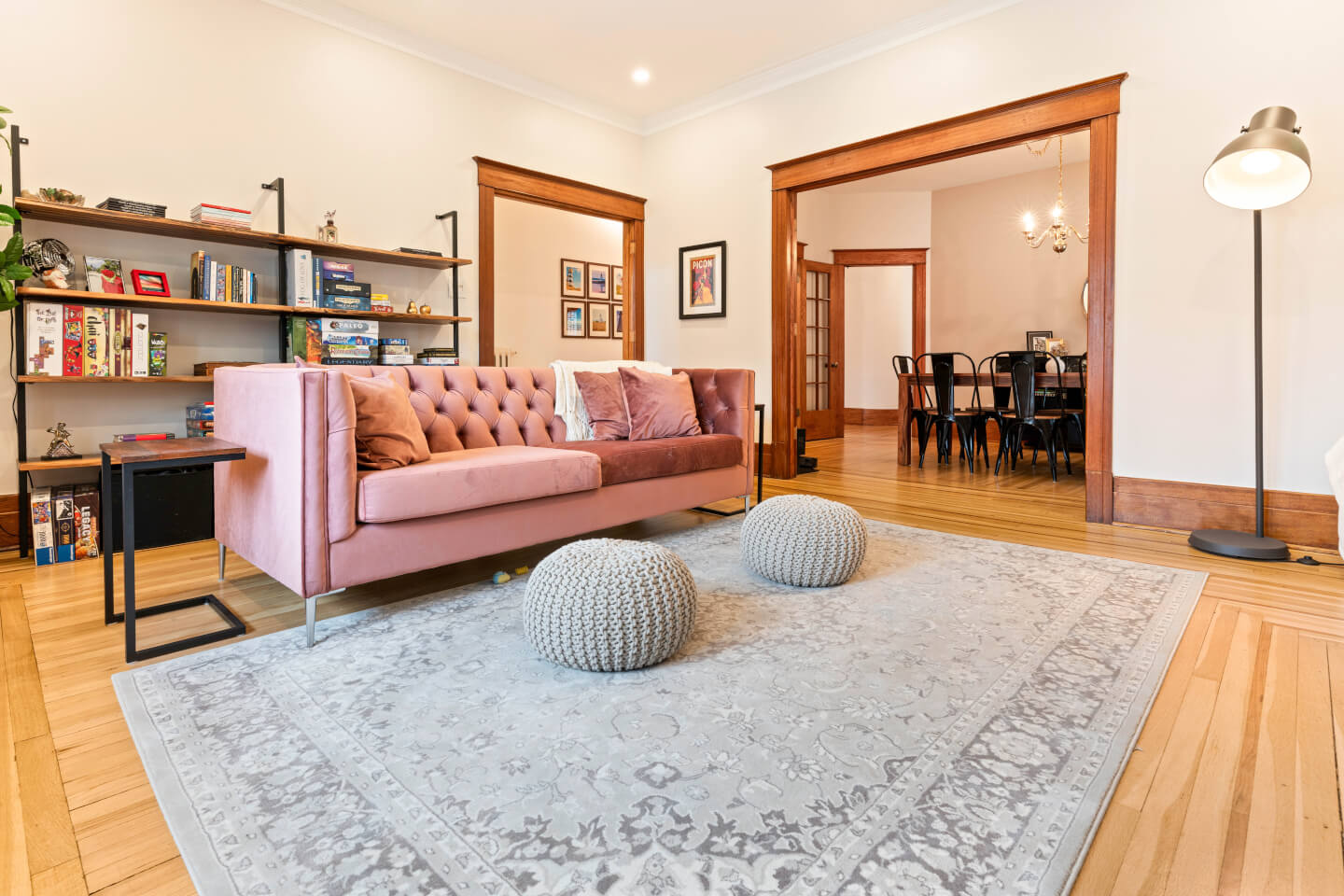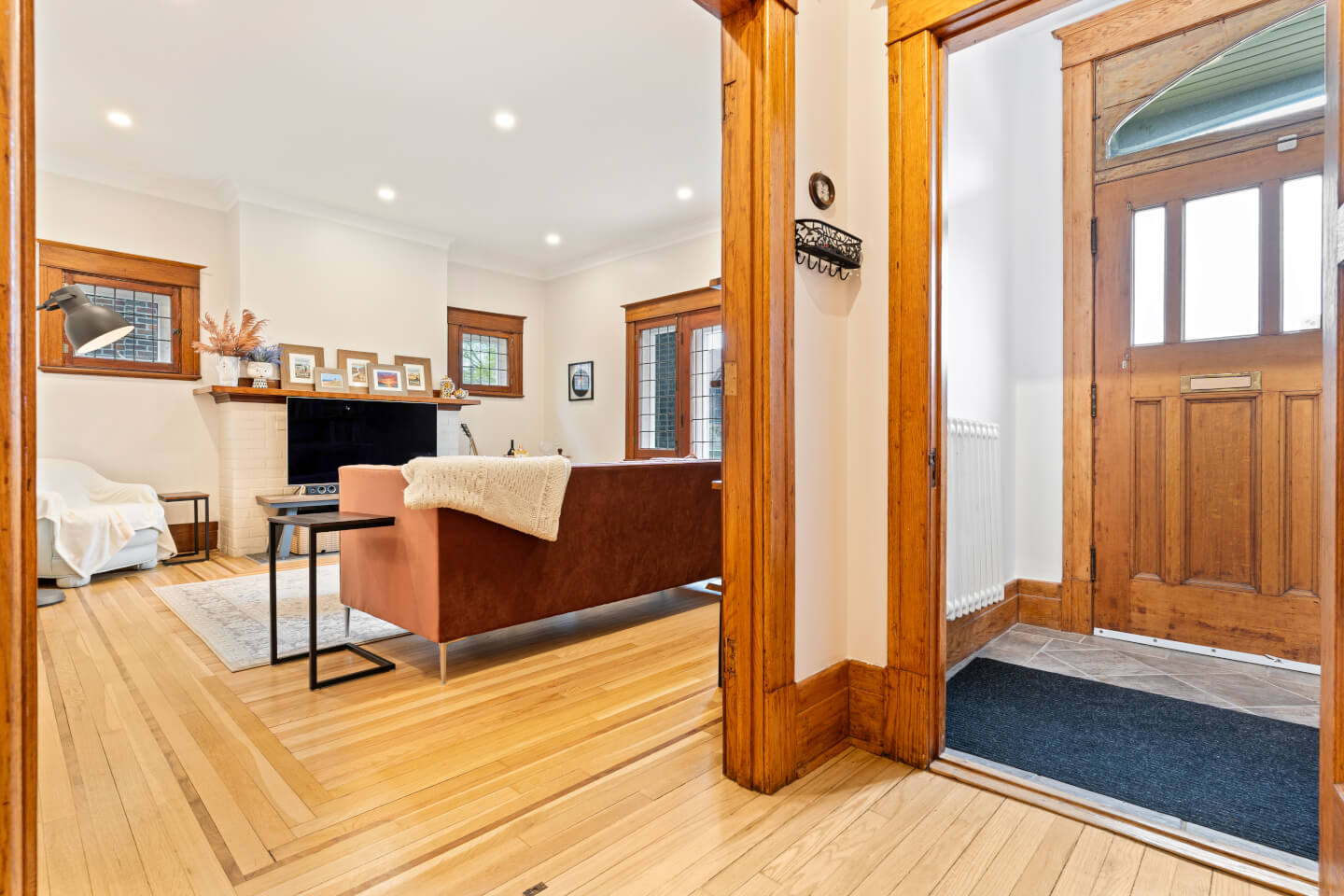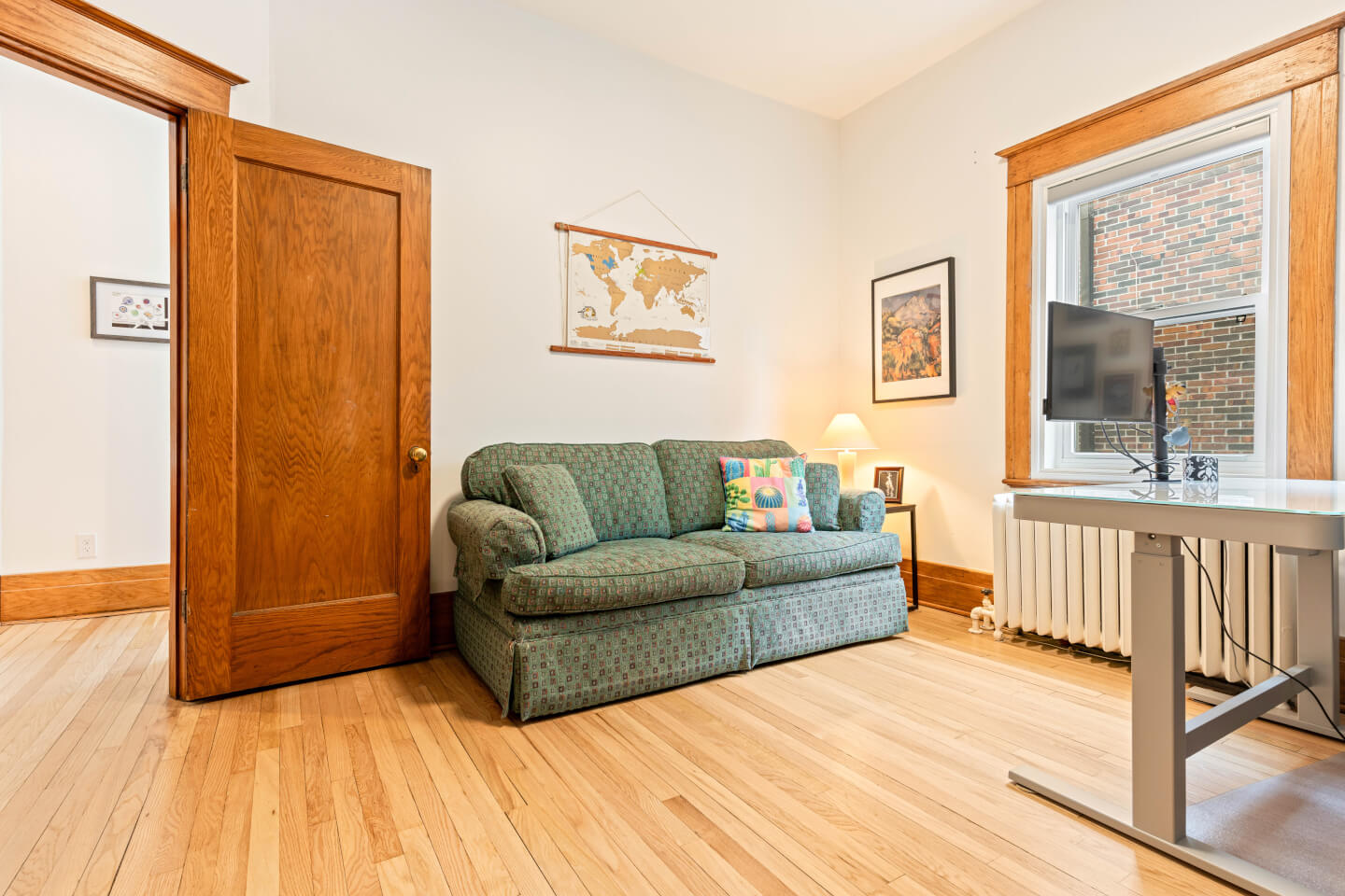 Dining room, built-in cabinet, oak floor, and mahogany insert
