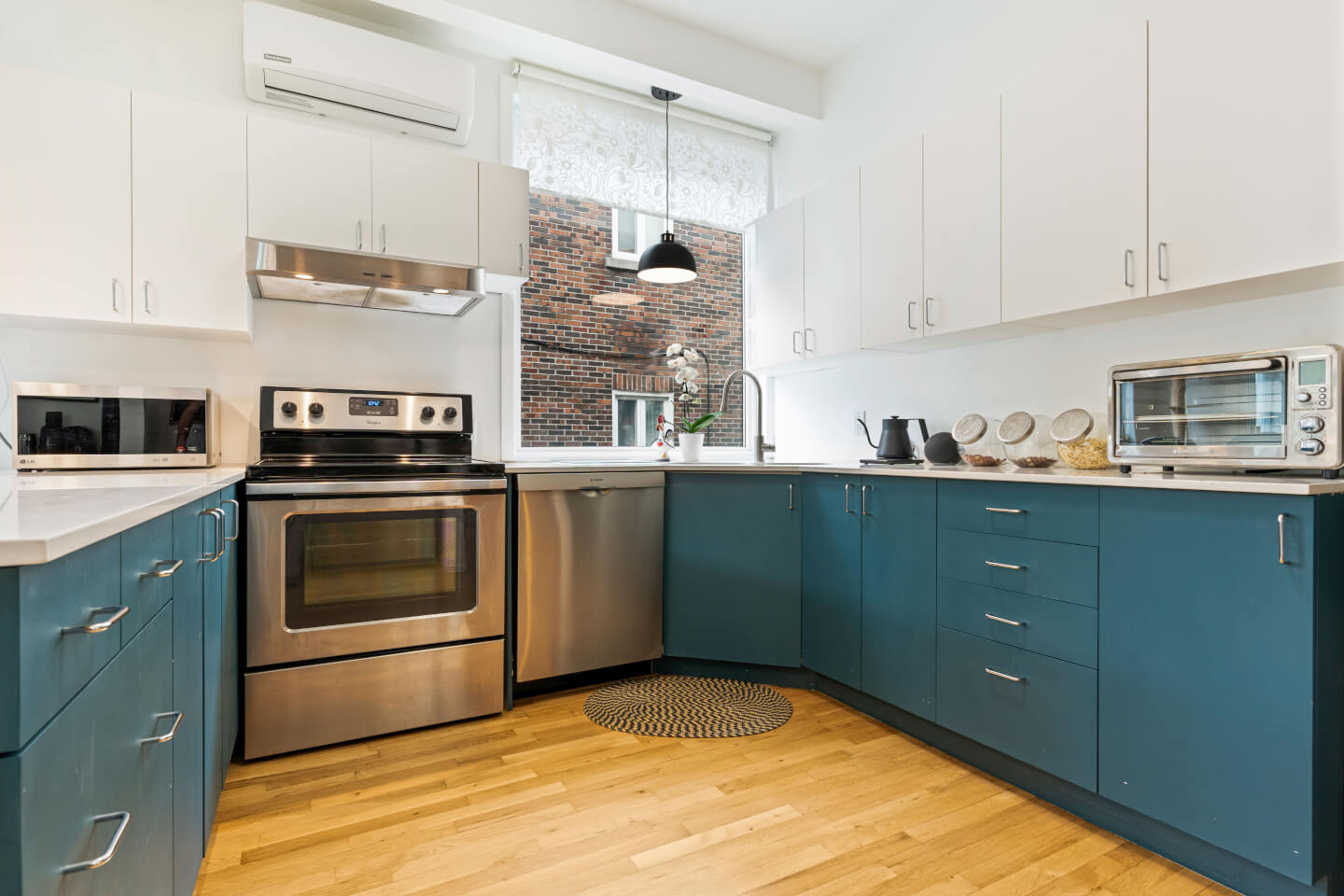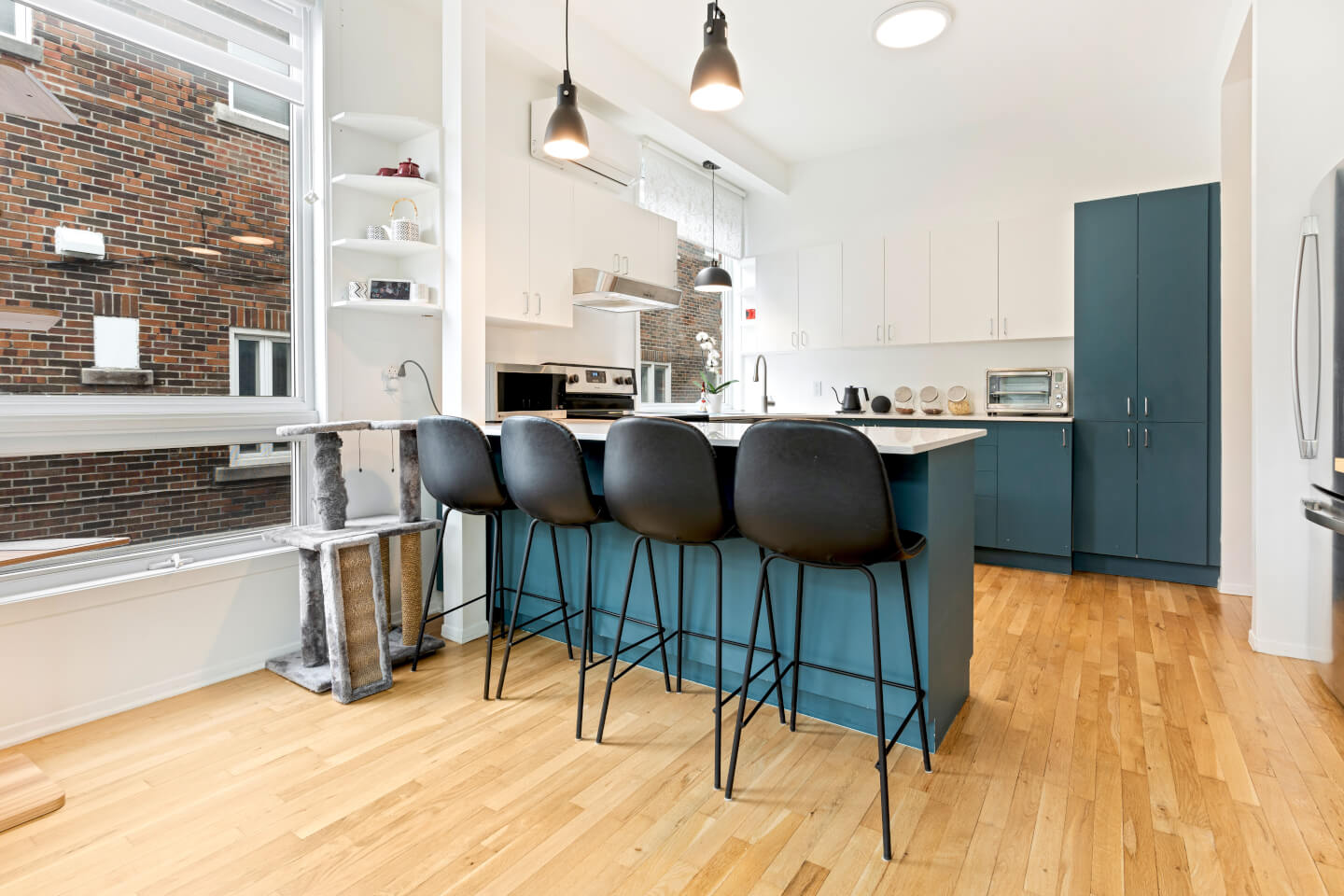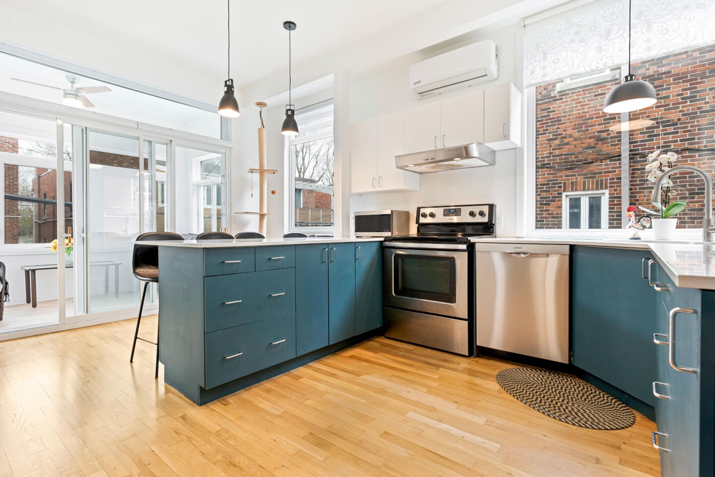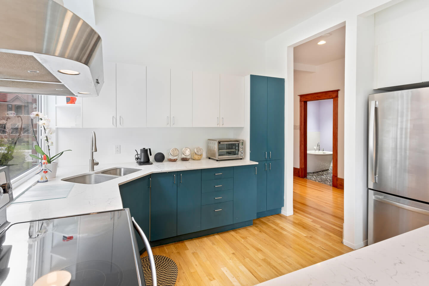 Large Bright Kitchen, quartz countertop and ceramic floor