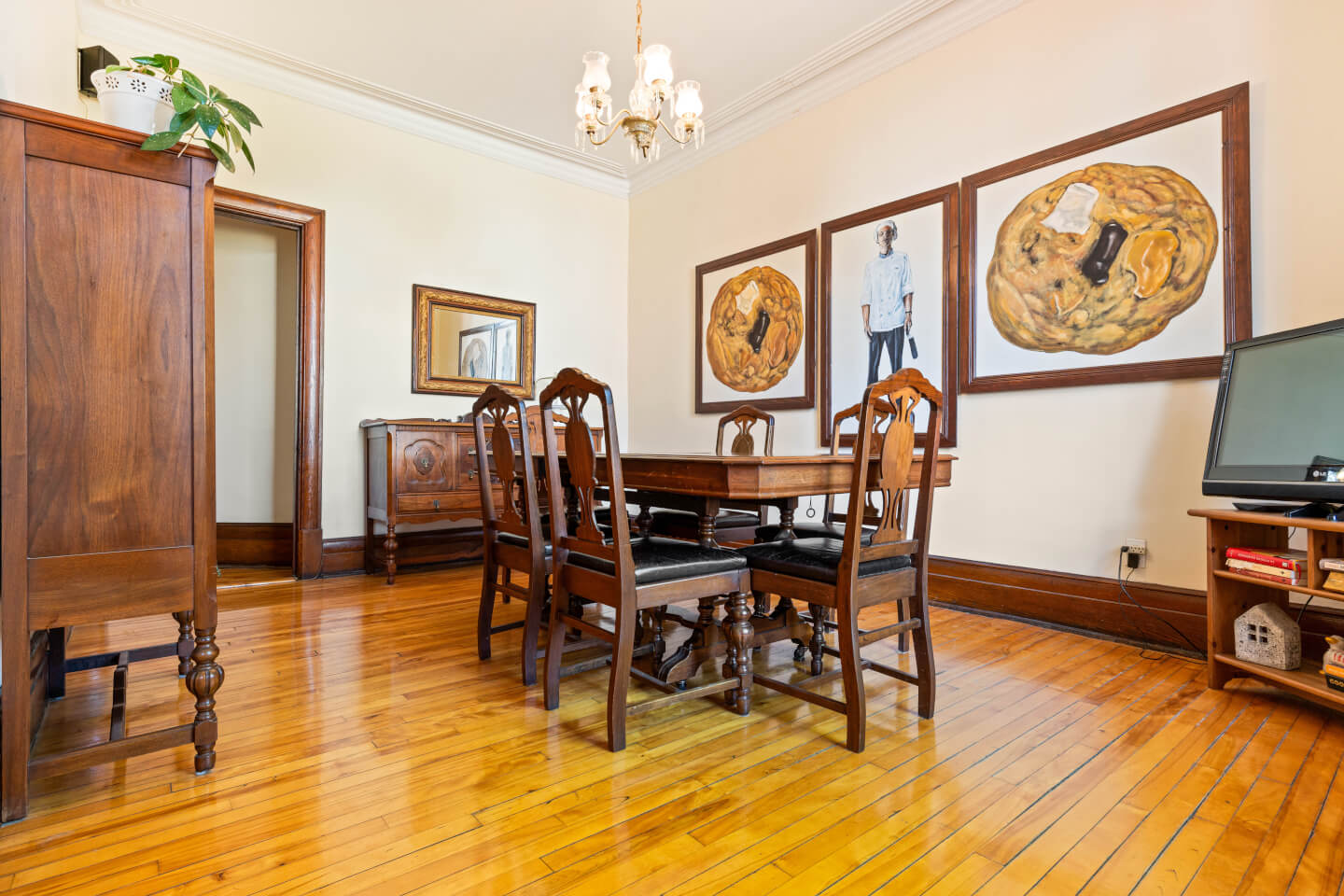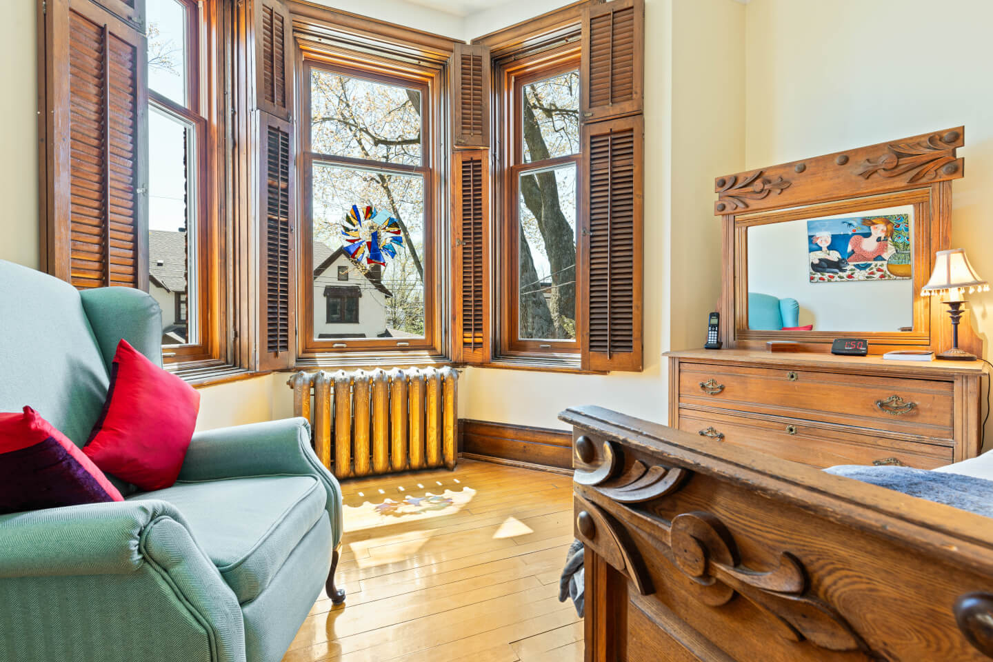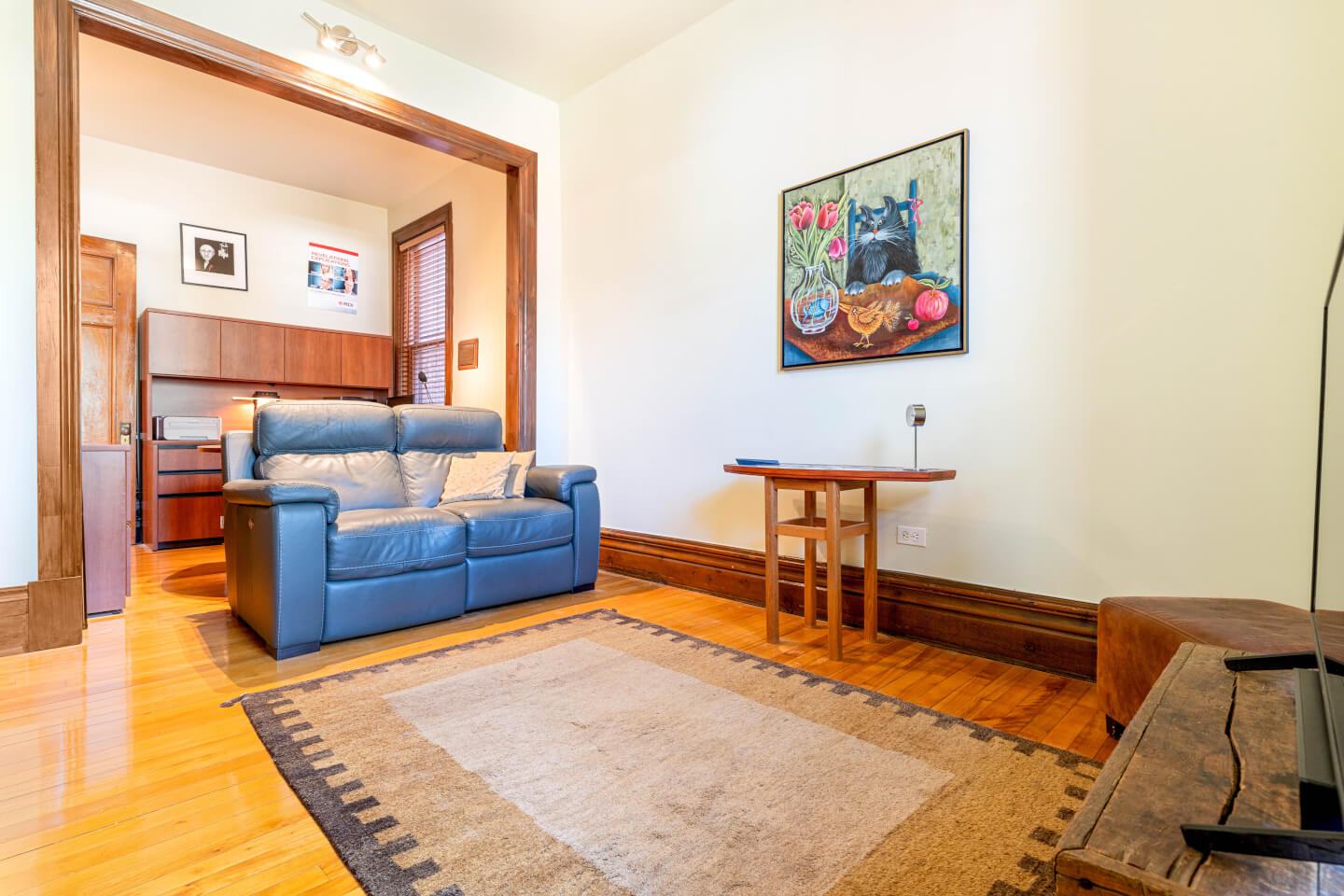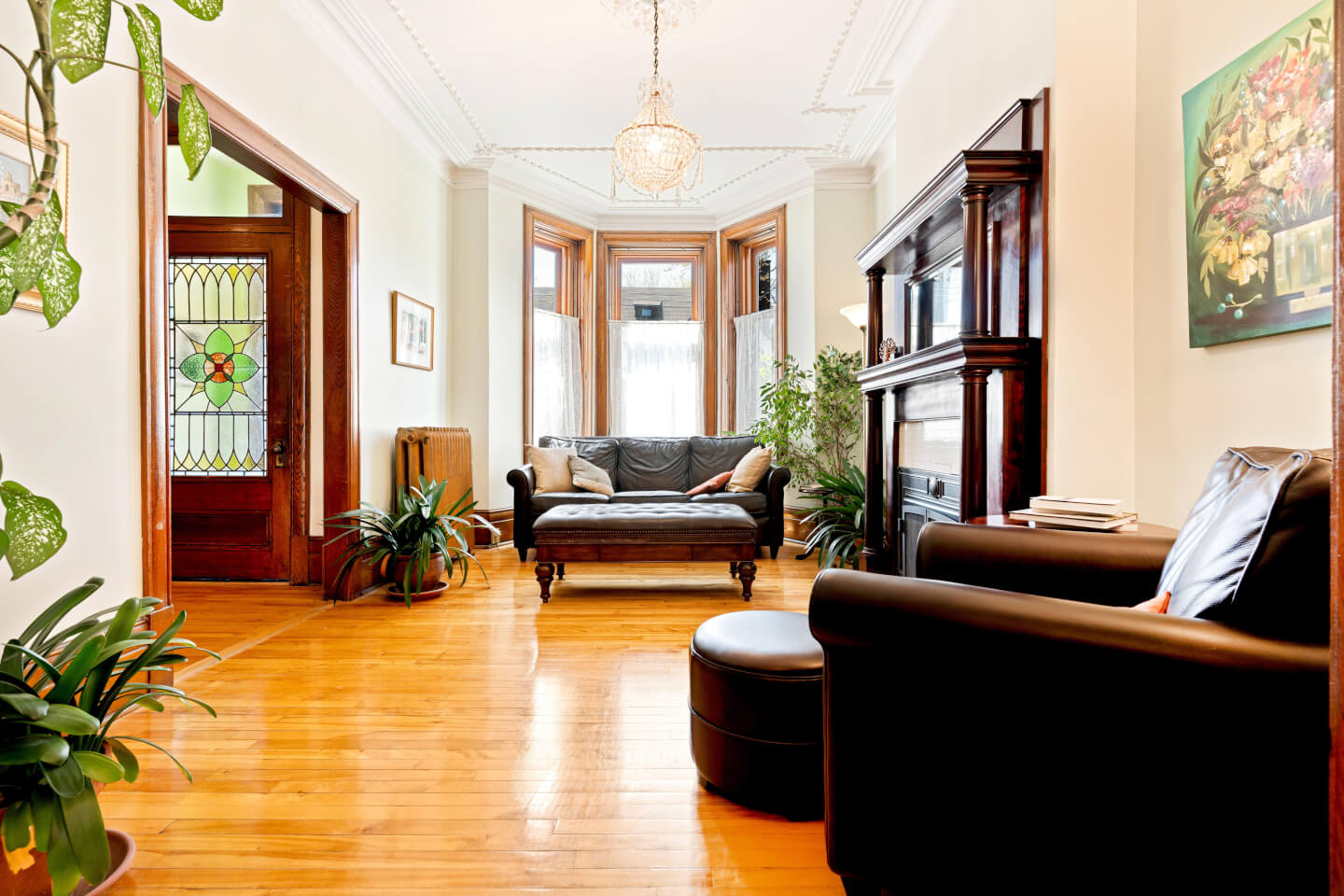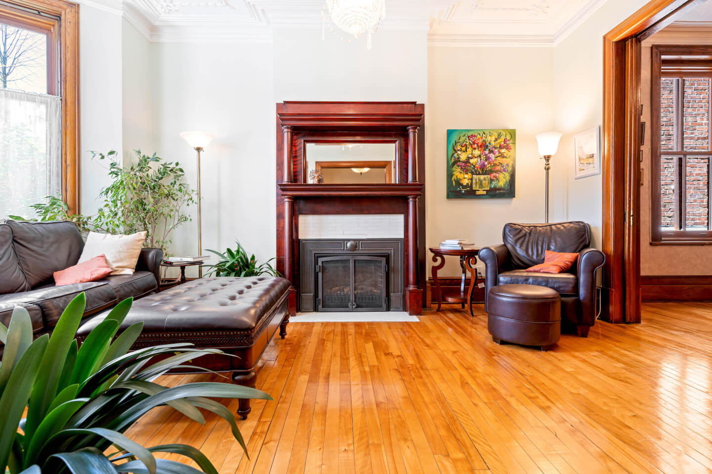 Living room, bay windows, gas fireplace, original Mantel fireplace with spectacular details