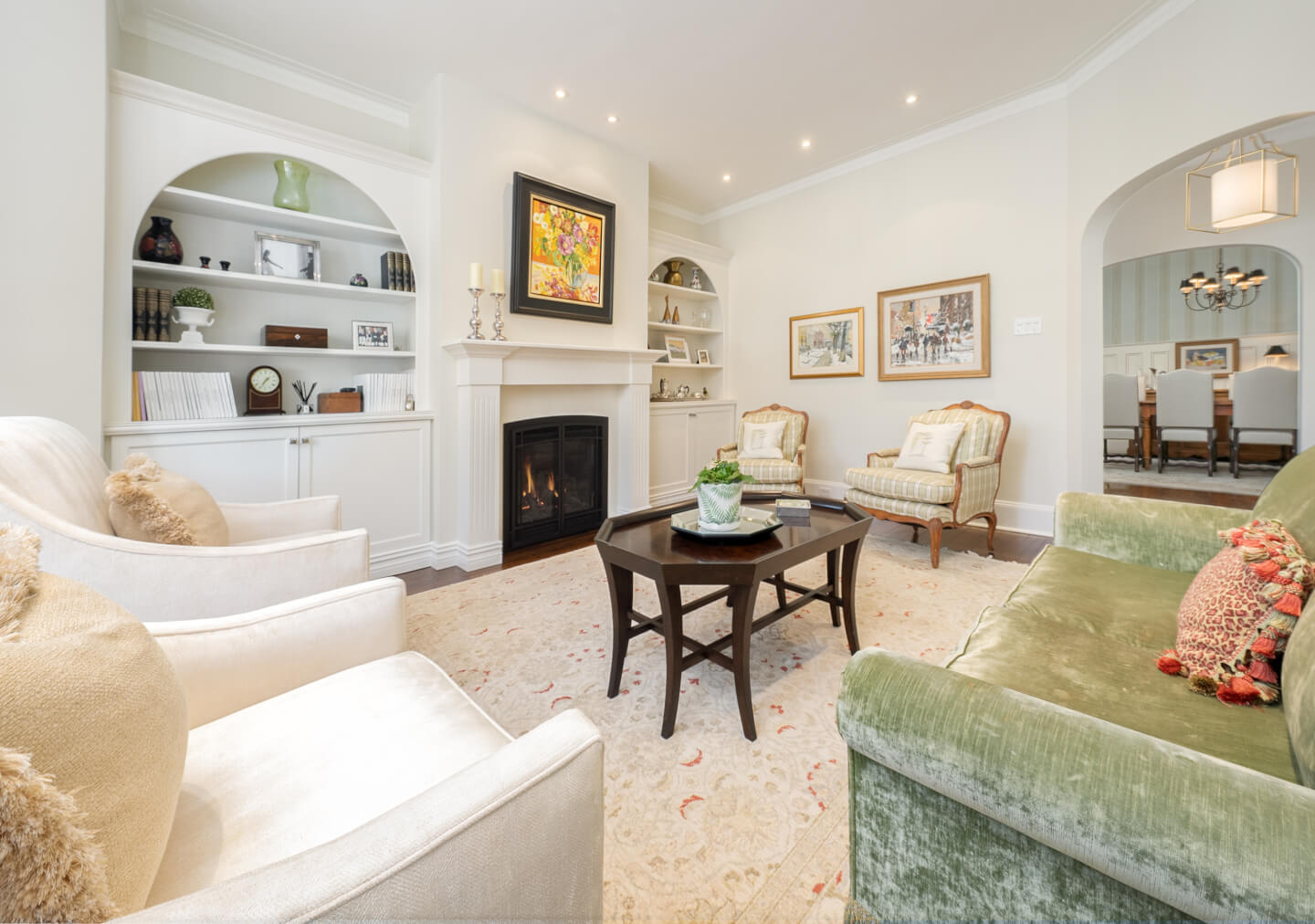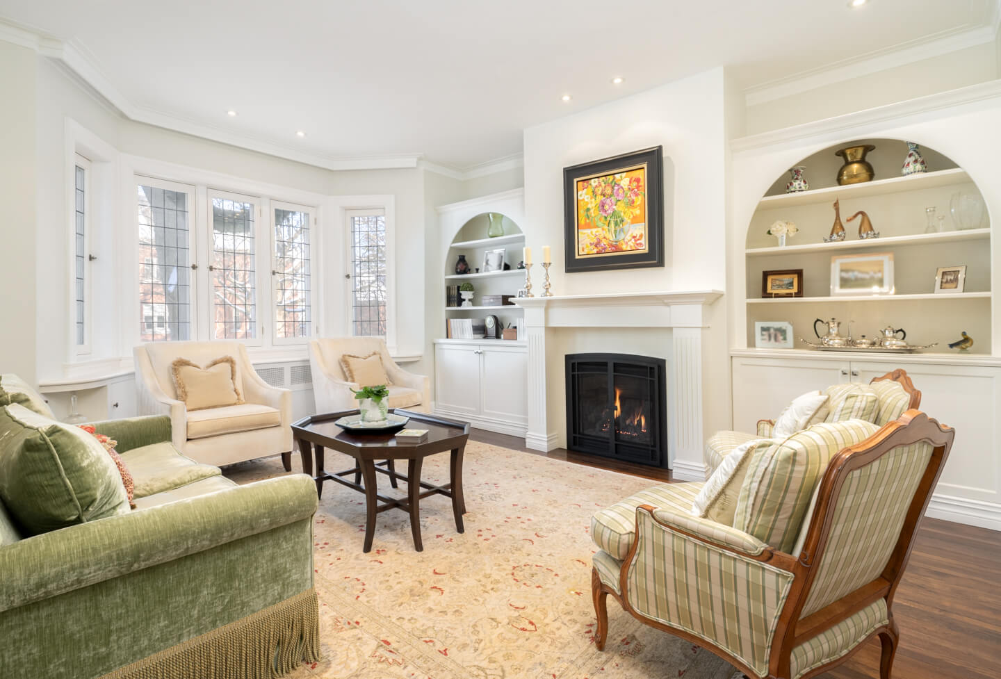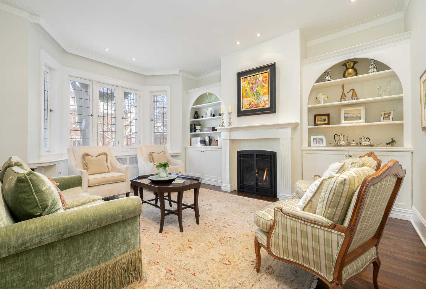 -Elegant living room with a bay window, gas fireplace, and custom built-ins.