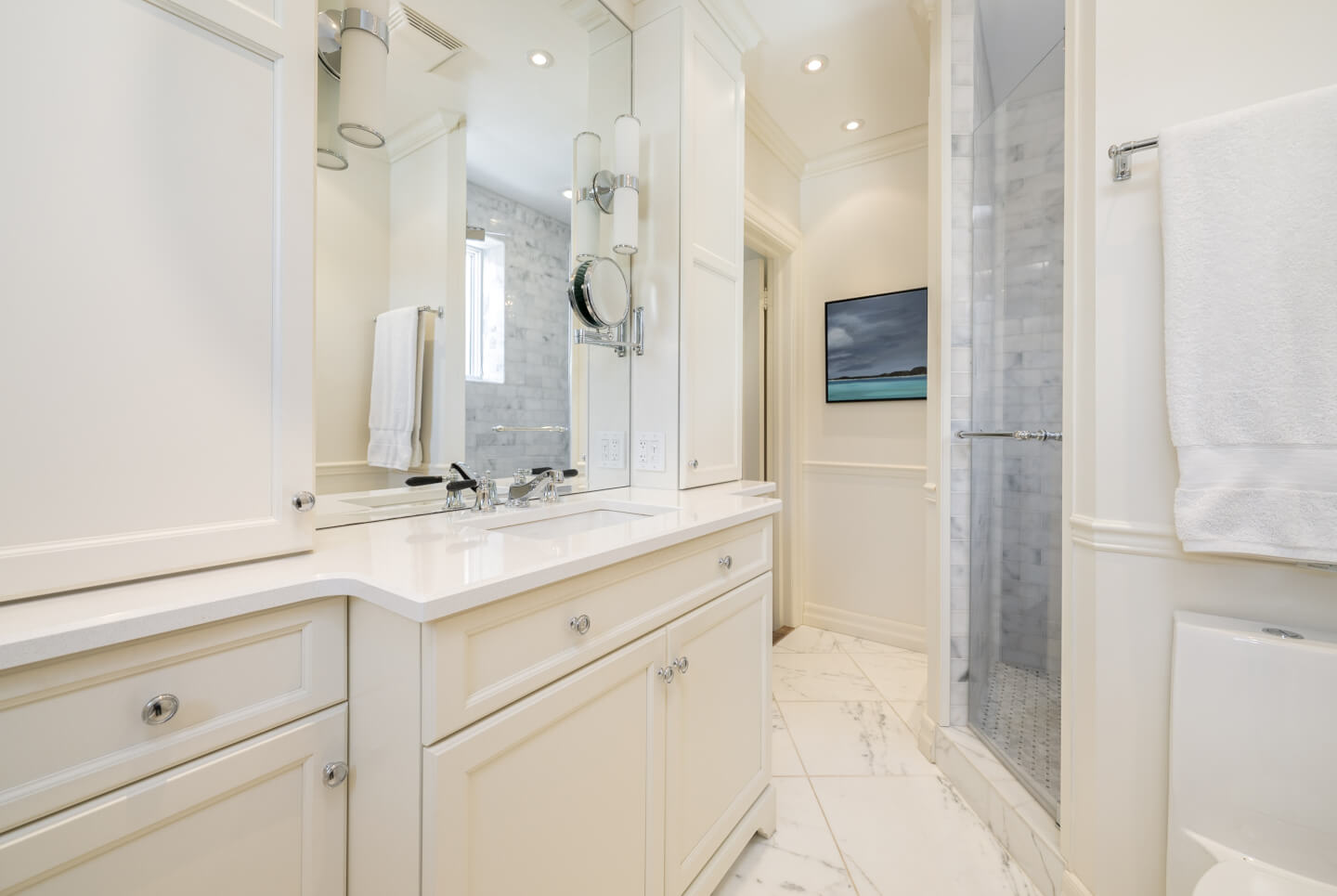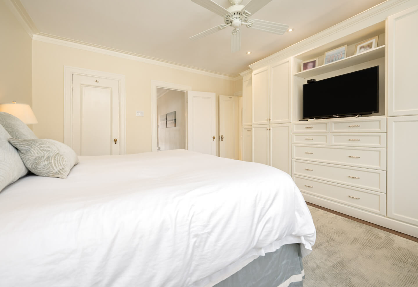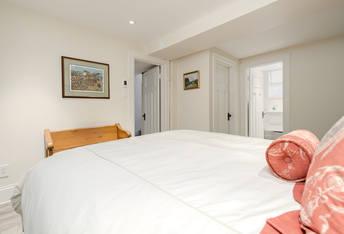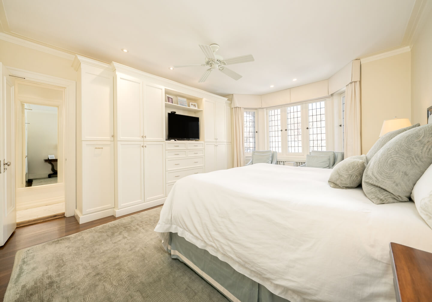 -Expansive primary suite with a walk-in closet, renovated en-suite, and built-in storage.