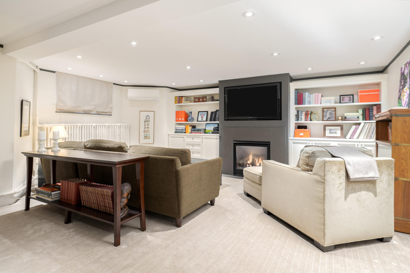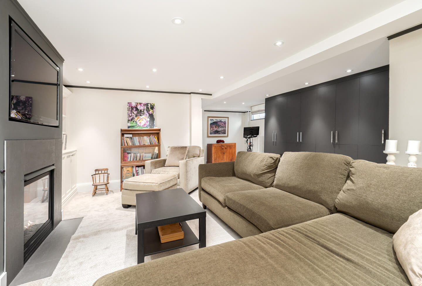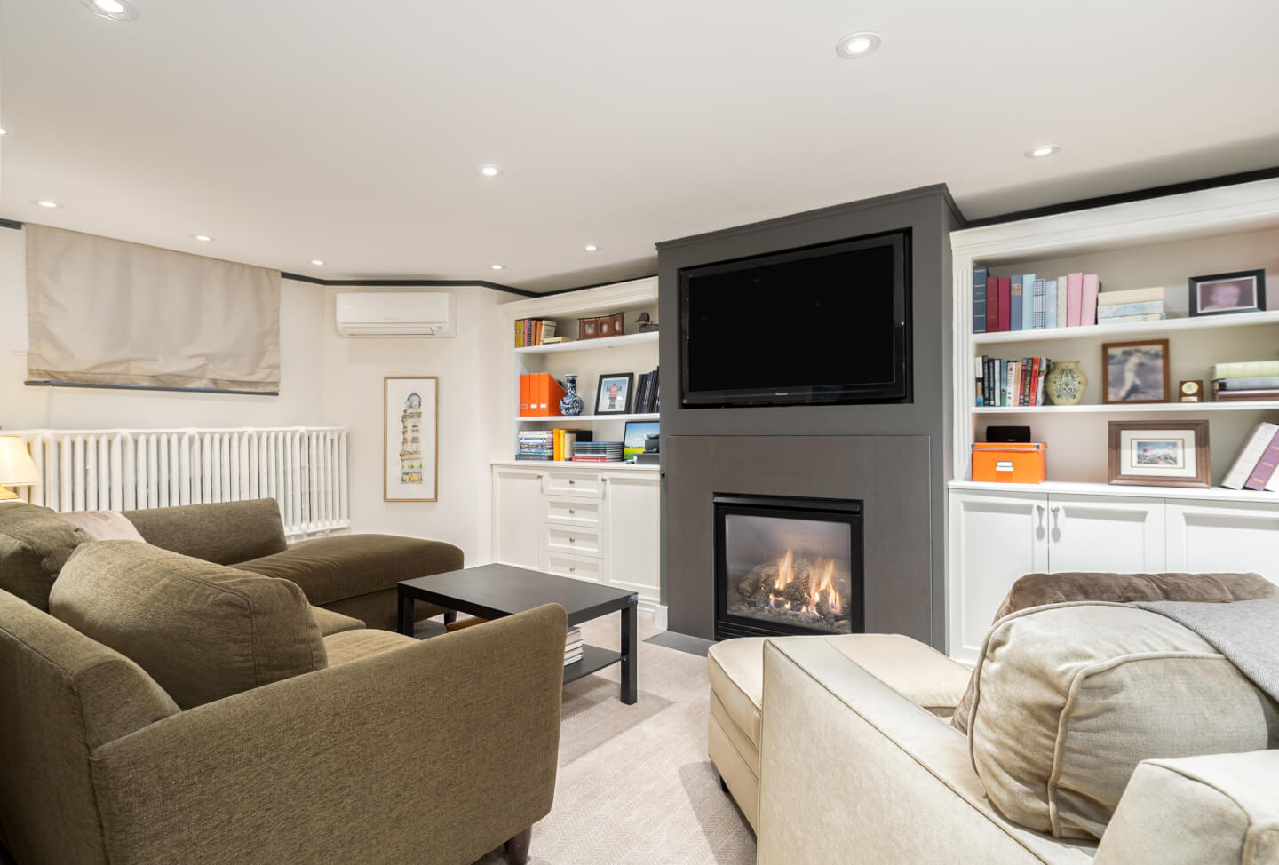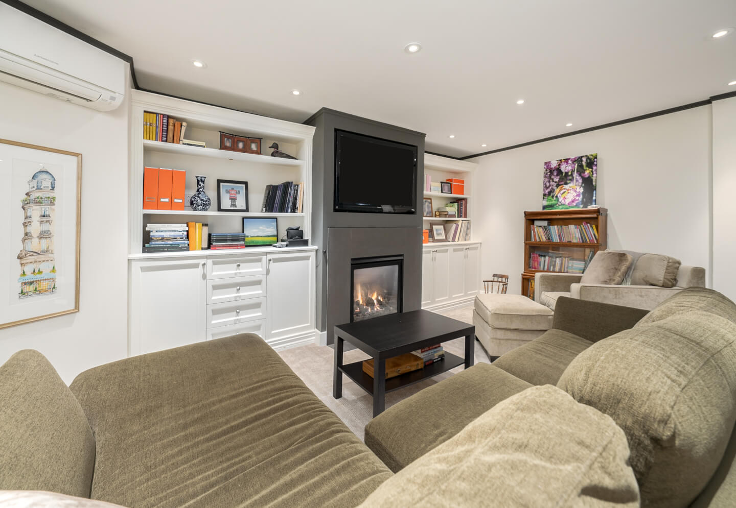 -Large family/playroom with a gas fireplace and custom storage.