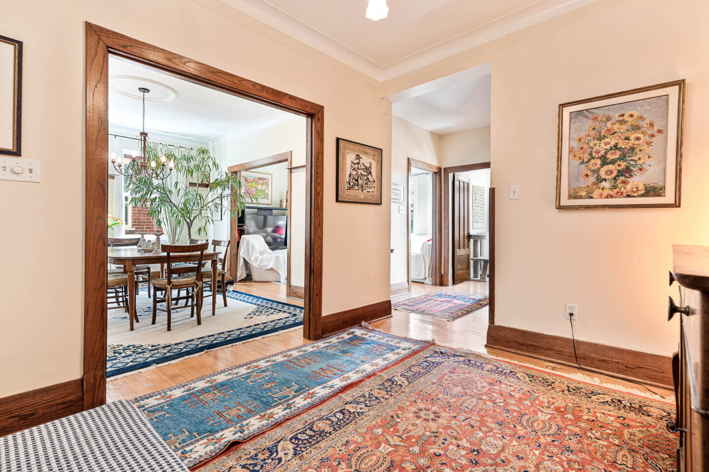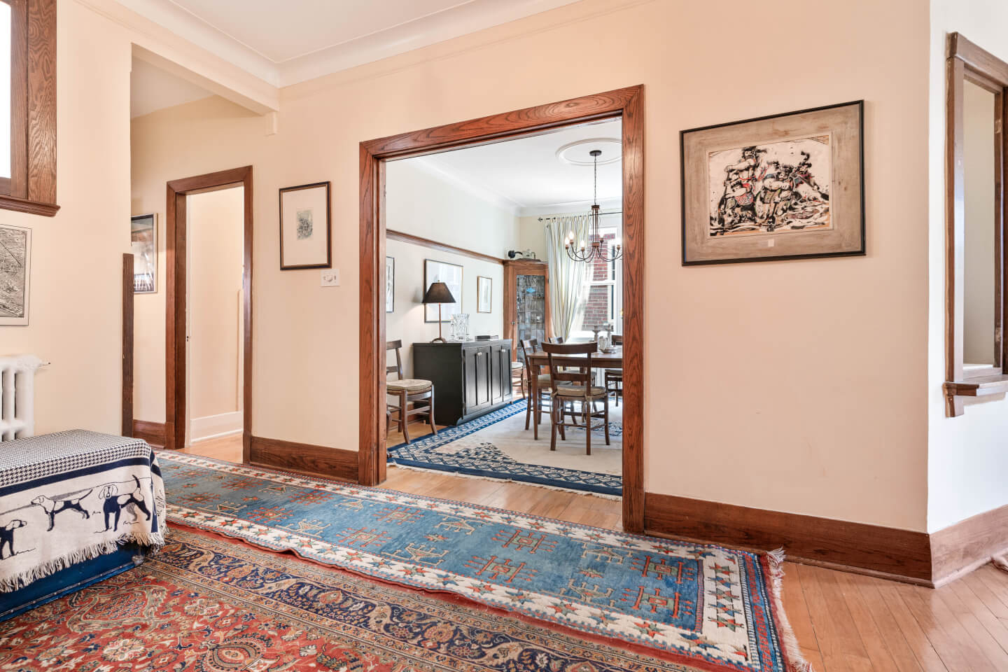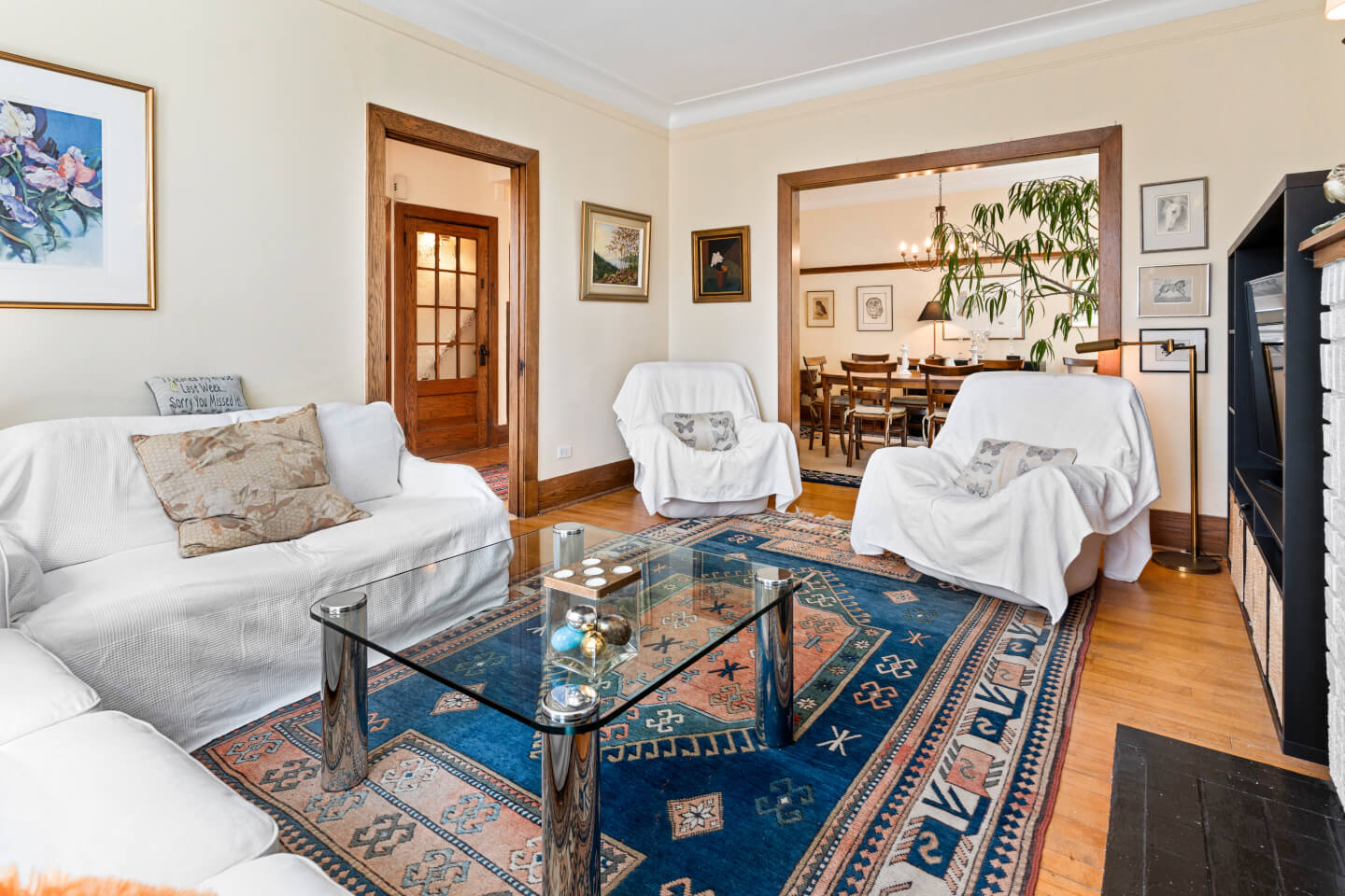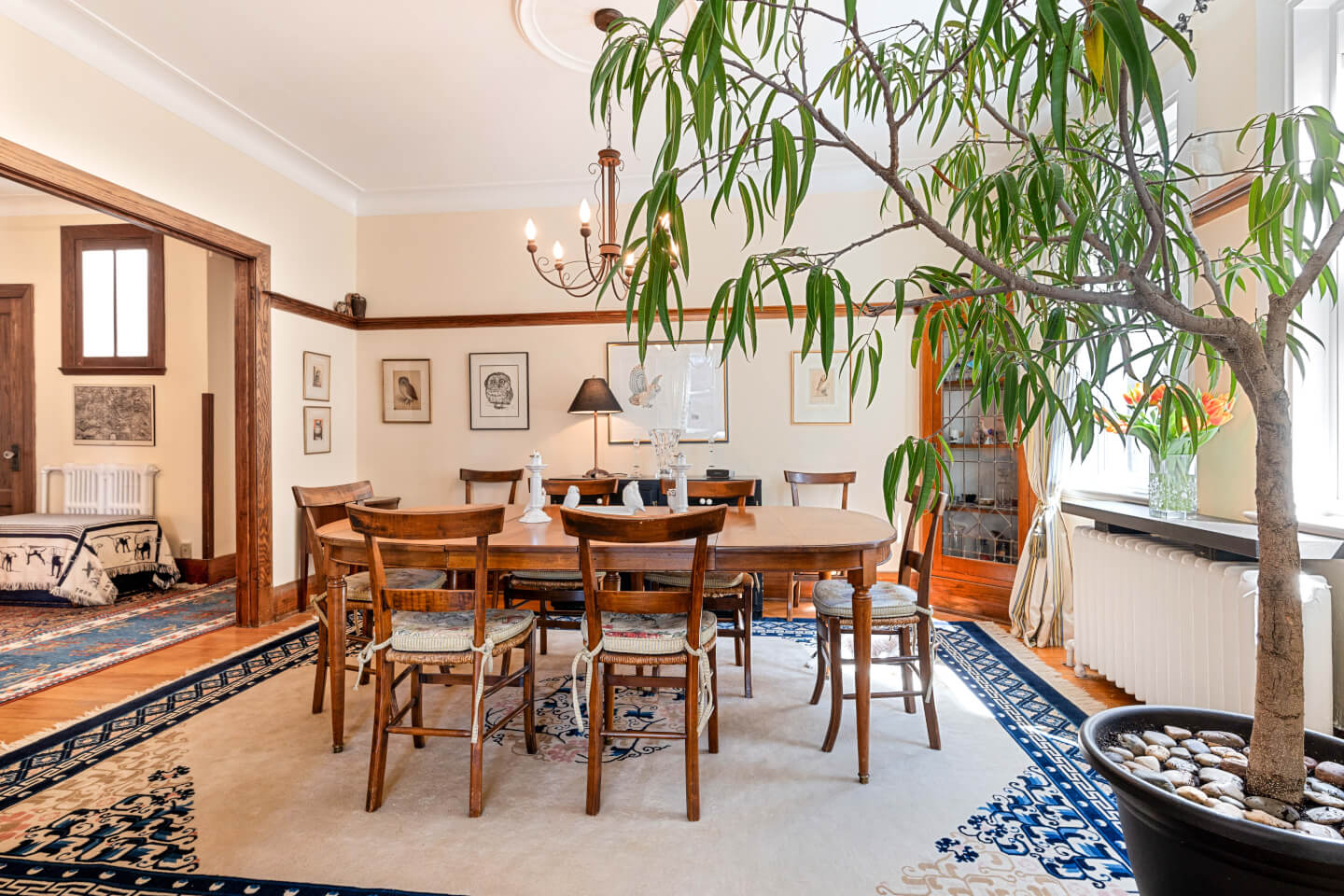 Living room open to the dining room (fireplace not compliant with Montreal city law)