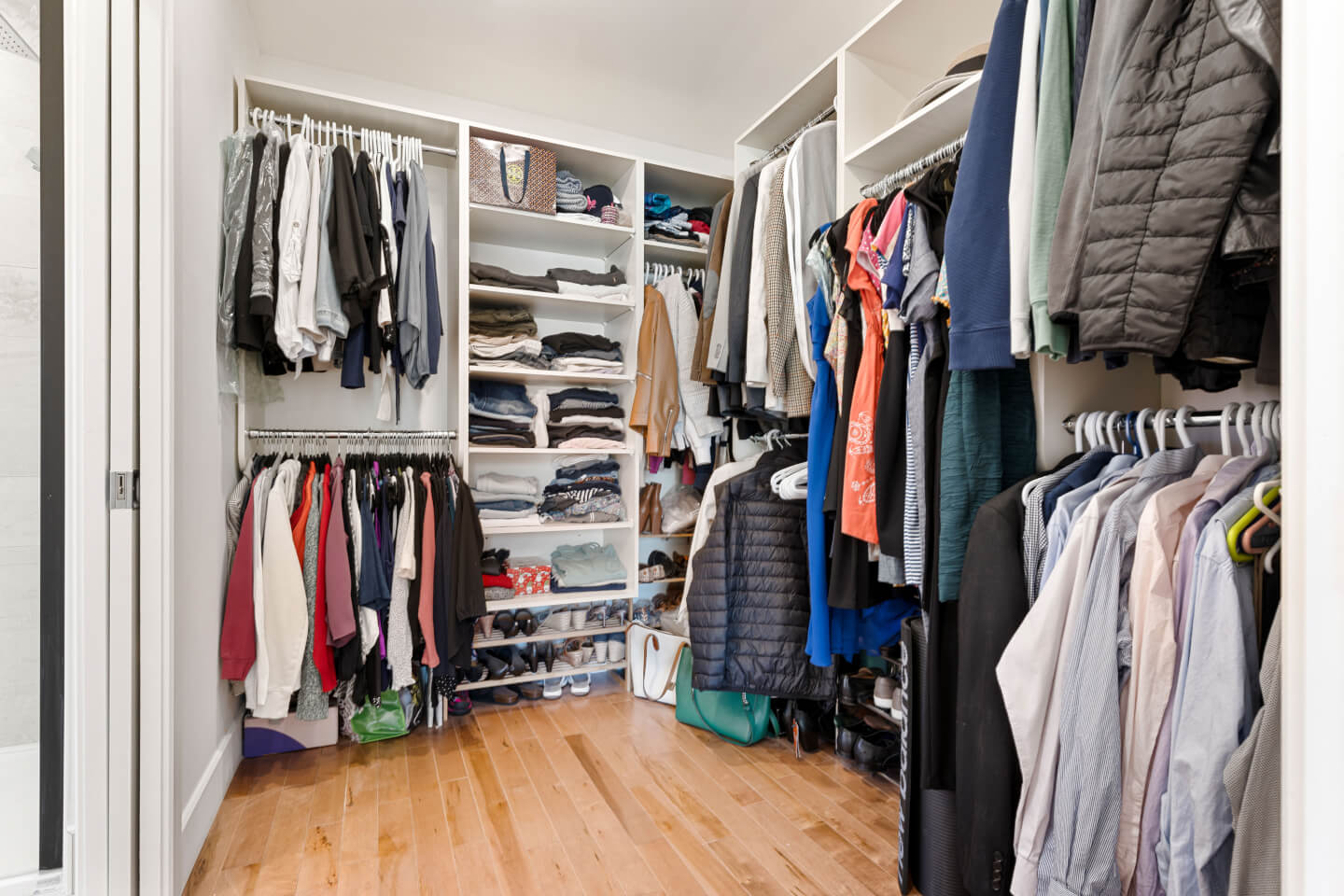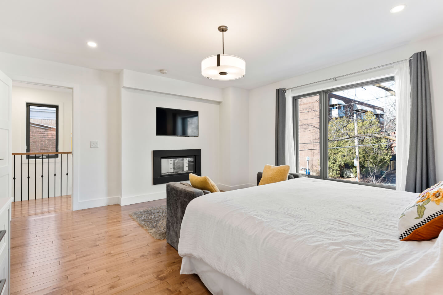 Primary bedroom with gas fireplace, large walk-in closet, and ensuite bathroom