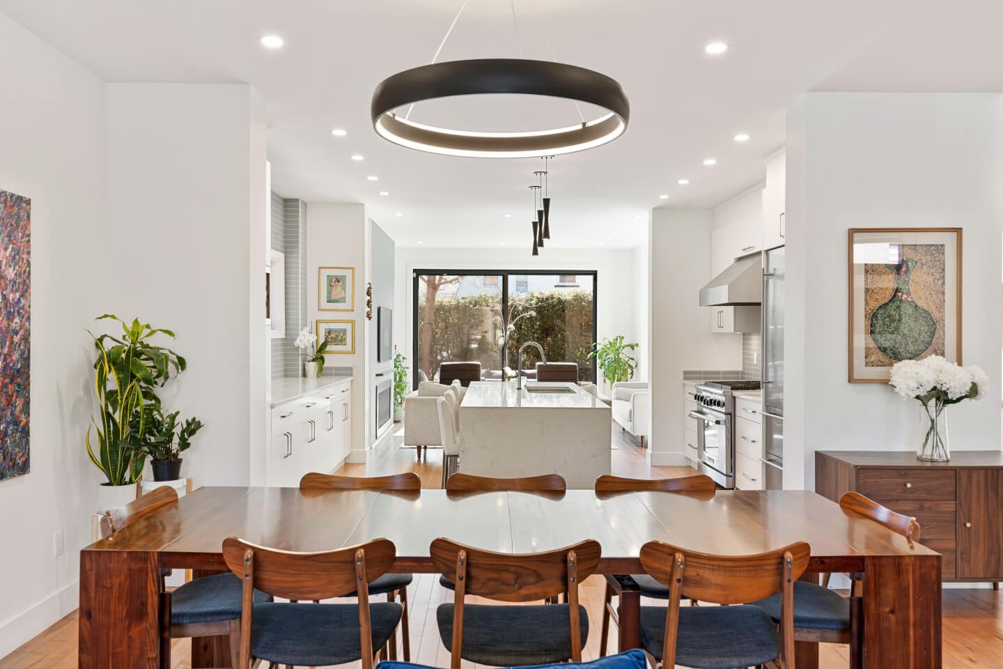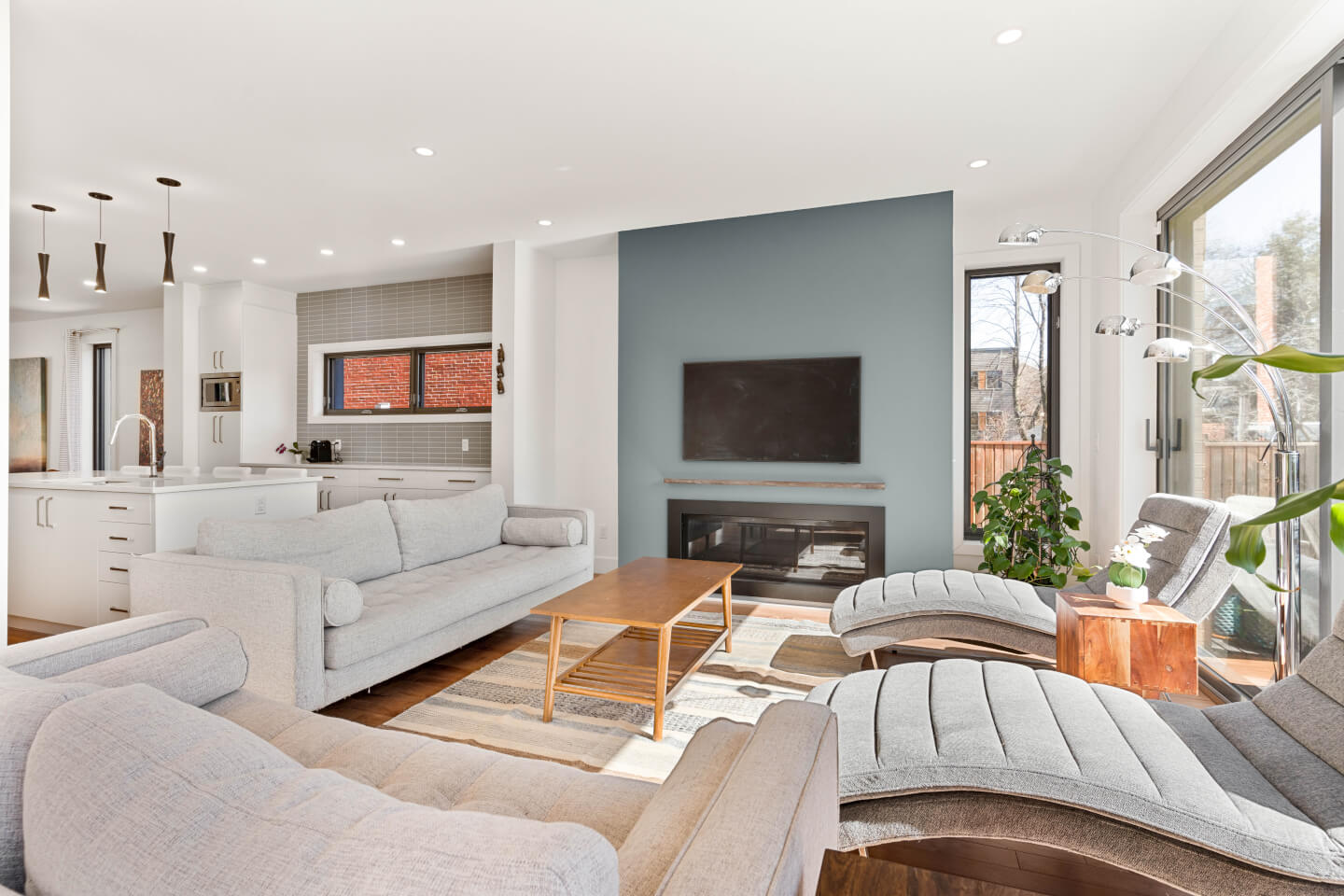 Den with gas fireplace open to the kitchen with two oversized patio doors