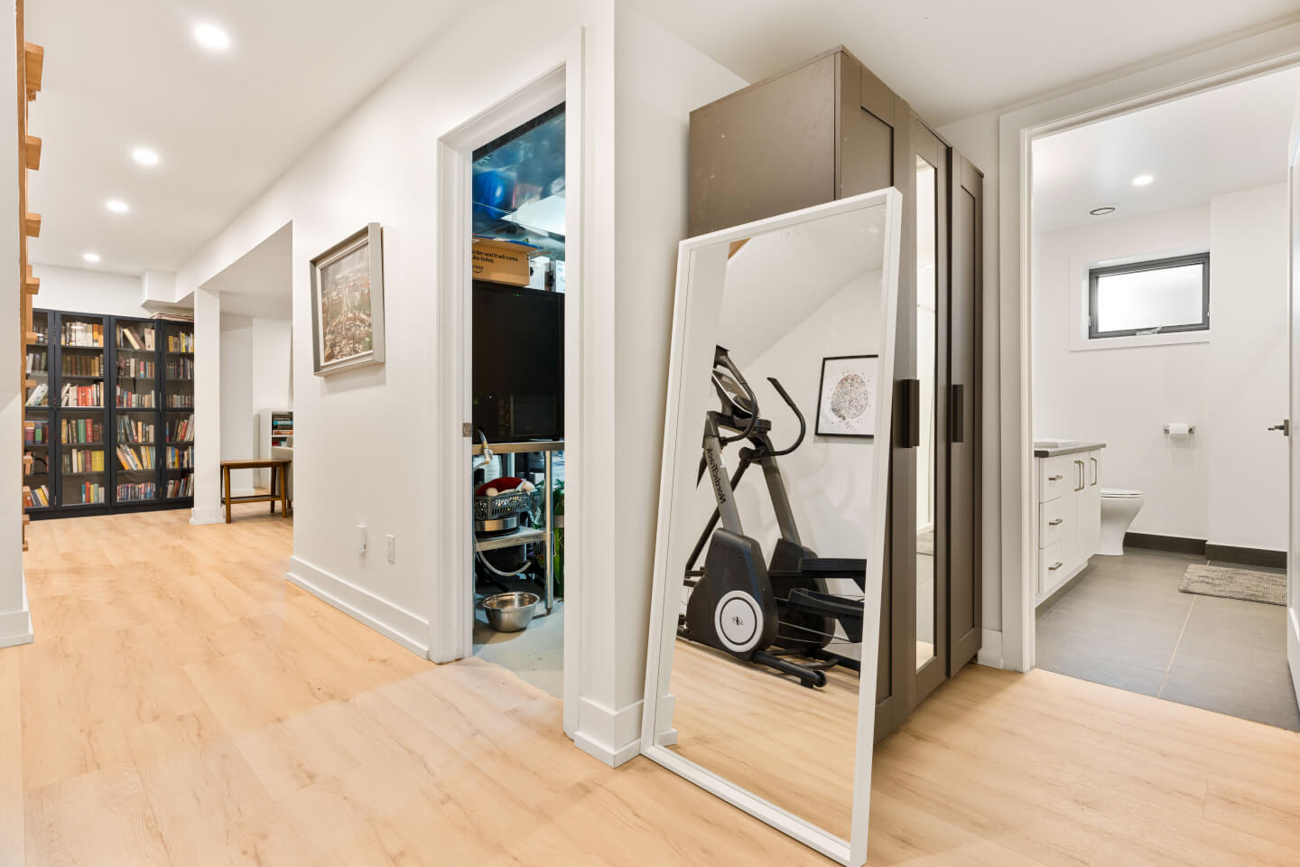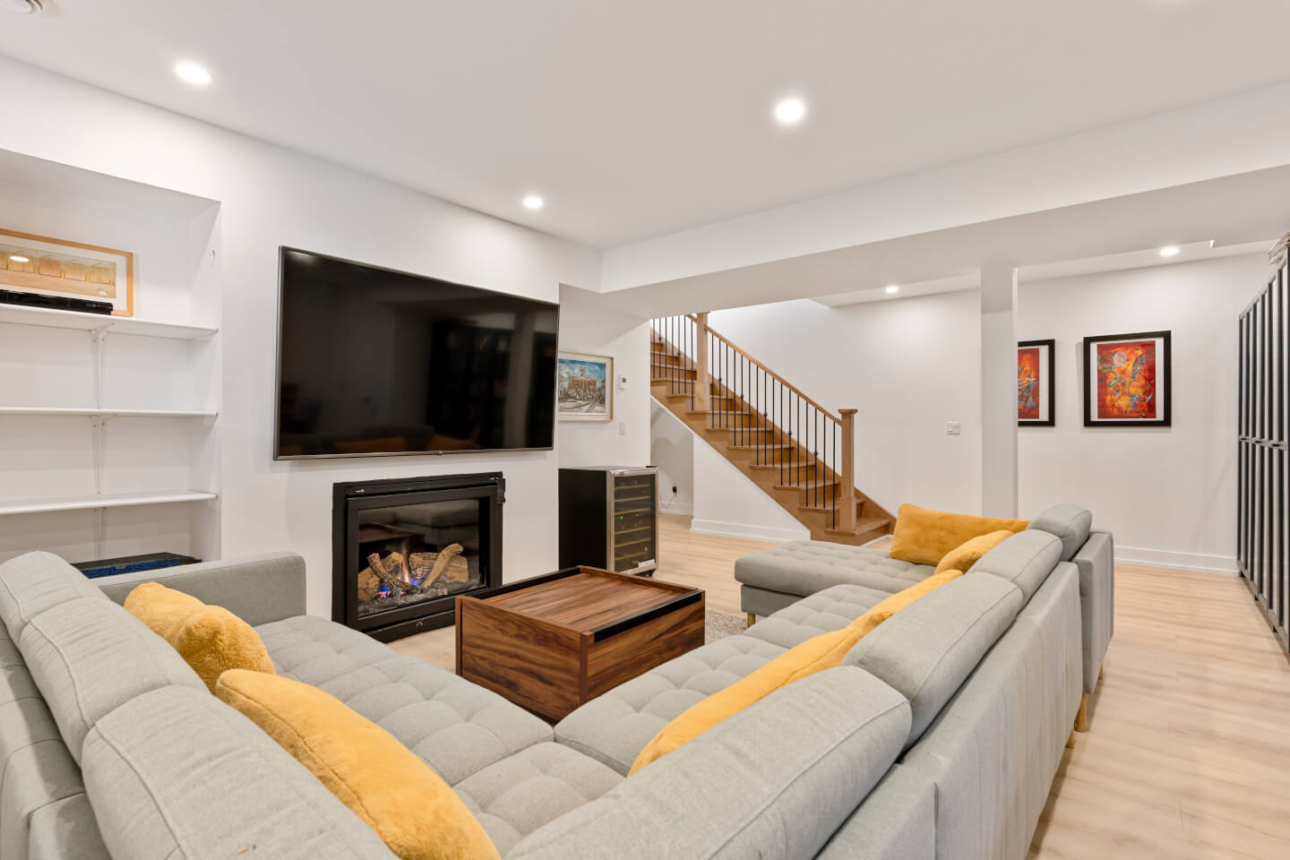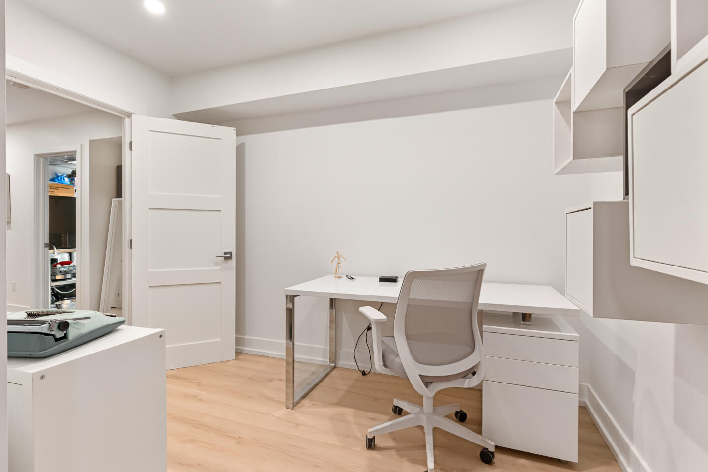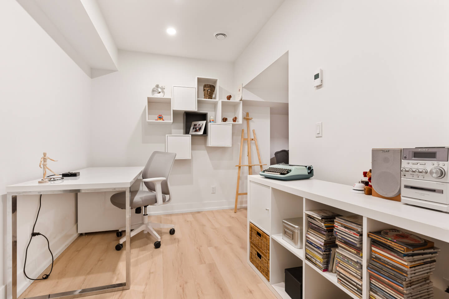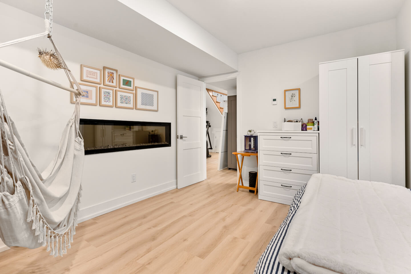 Heated floors throughout (except bathroom) Family room with gas fireplace Bedroom with electric fireplace Bathroom Storage Office or playroom