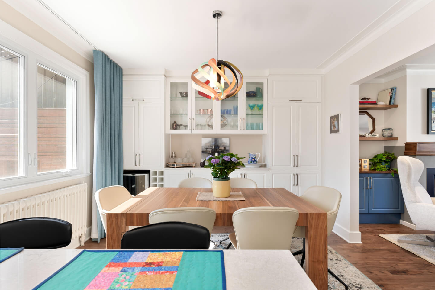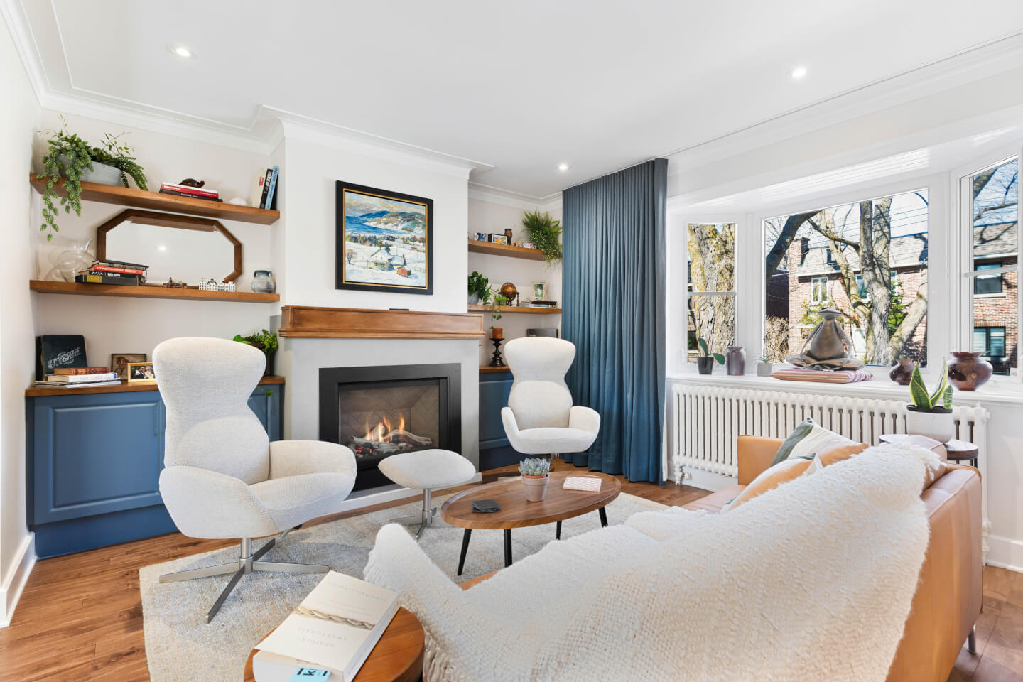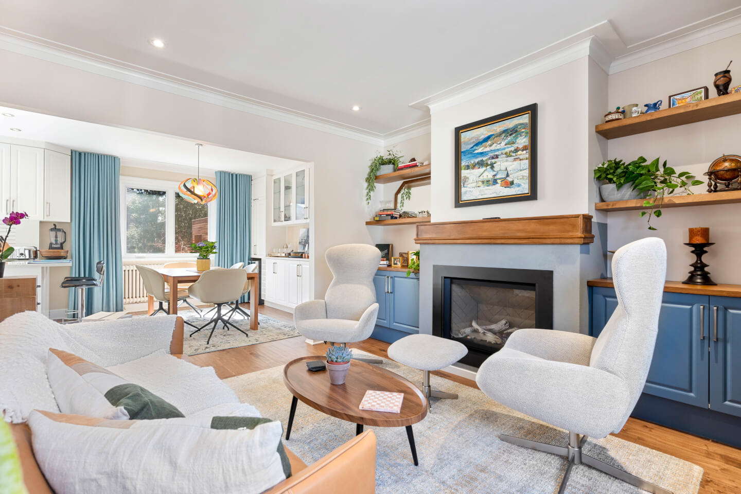 Living room with bay window, built-in cabinets, and gas fireplace opening onto the dining room
