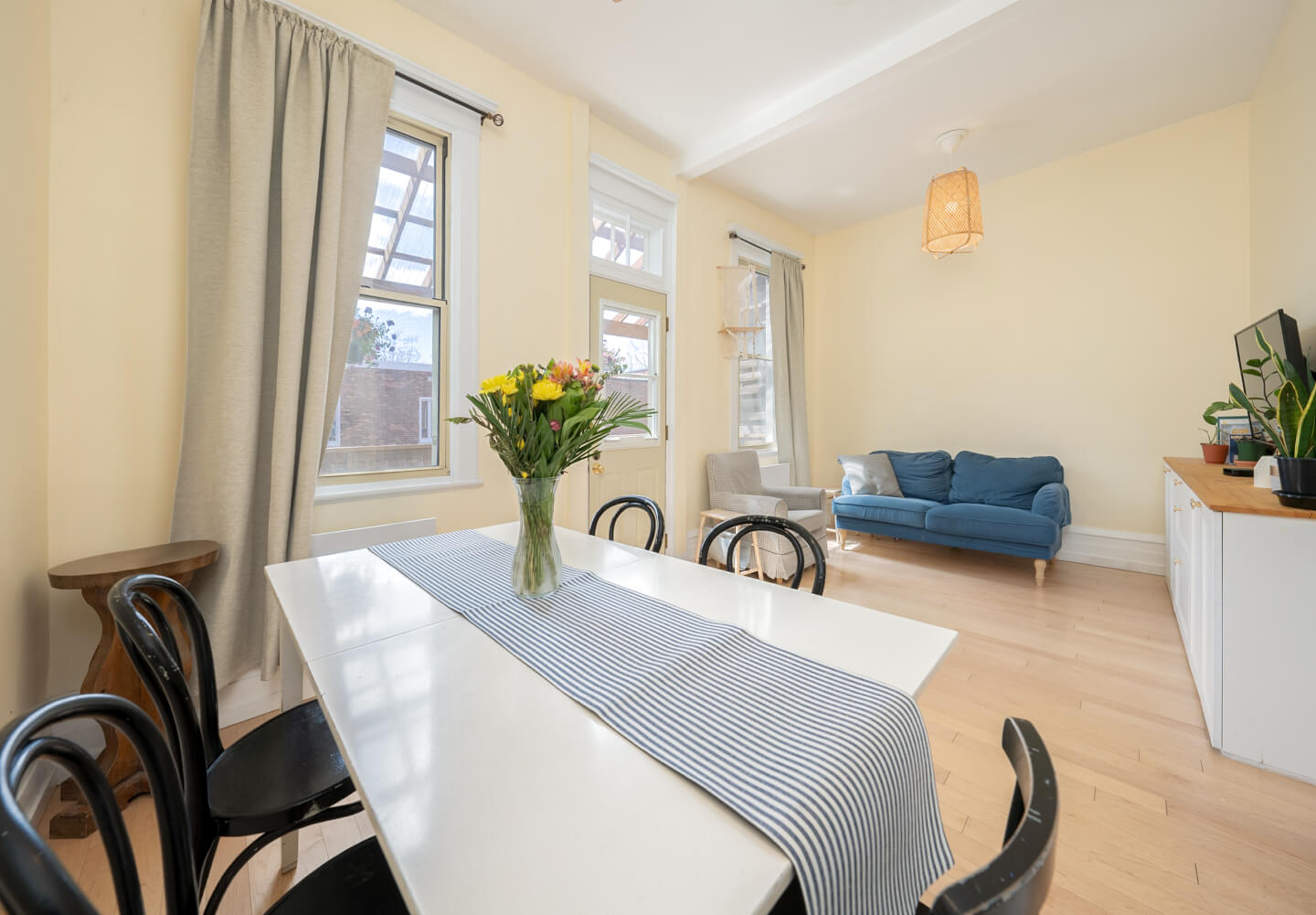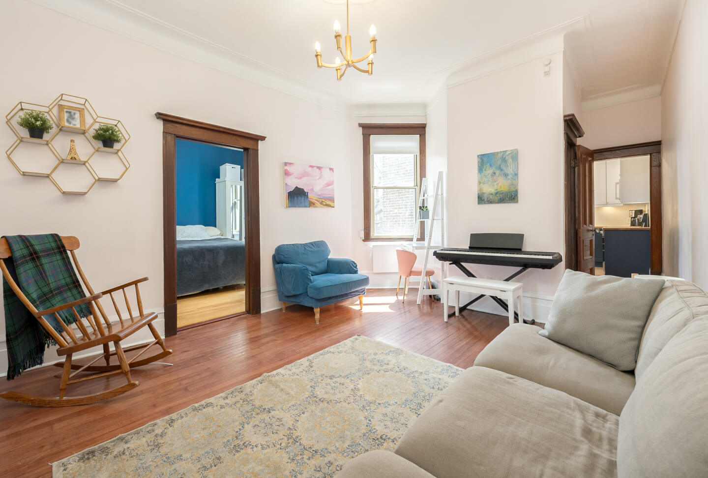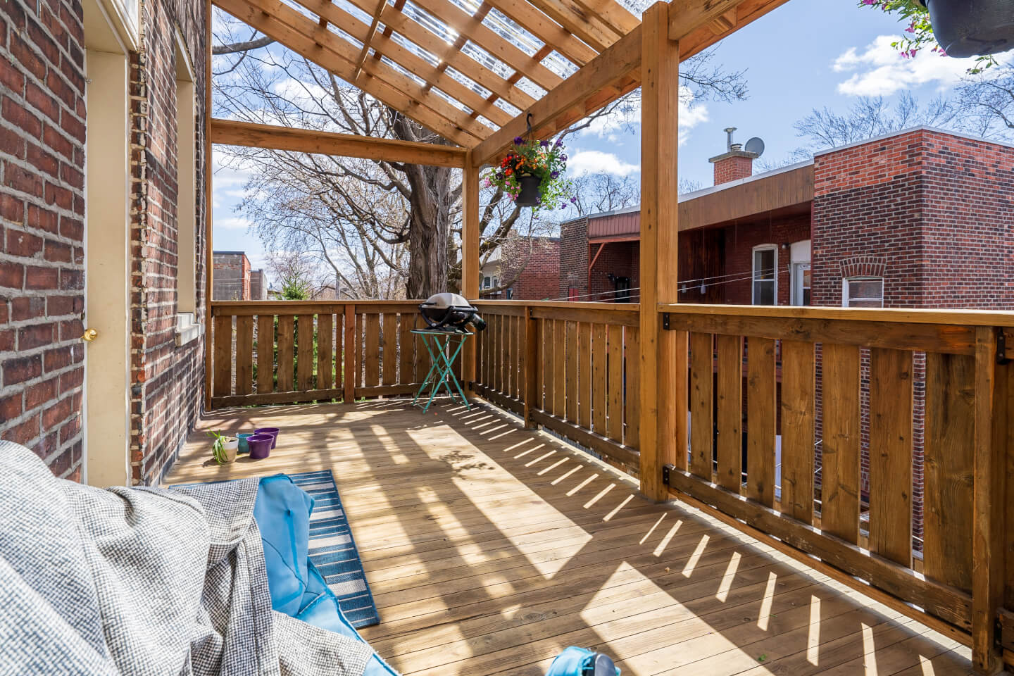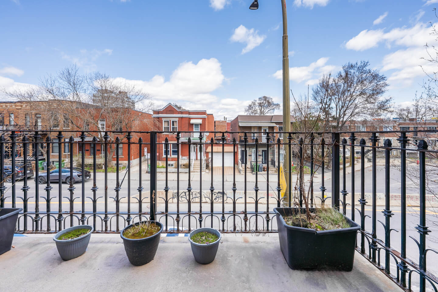 Charming undivided property located on the 2nd floor of a well-maintained building that combines timeless architectural charm with thoughtful modern updates. This inviting unit offers three closed bedrooms, a bathroom refreshed in 2017, and a stylish kitchen renovated in 2022, seamlessly connected to the dining area and bright, open living room—ideal for entertaining guests. Original woodwork, soaring 10-foot ceilings, a front balcony, and a sun-filled private rear terrace. Includes a den, a home office, and an unfinished basement space with excellent potential. Prime location near parks, schools, shops, cafés, restaurants, and public transit. A true gem!