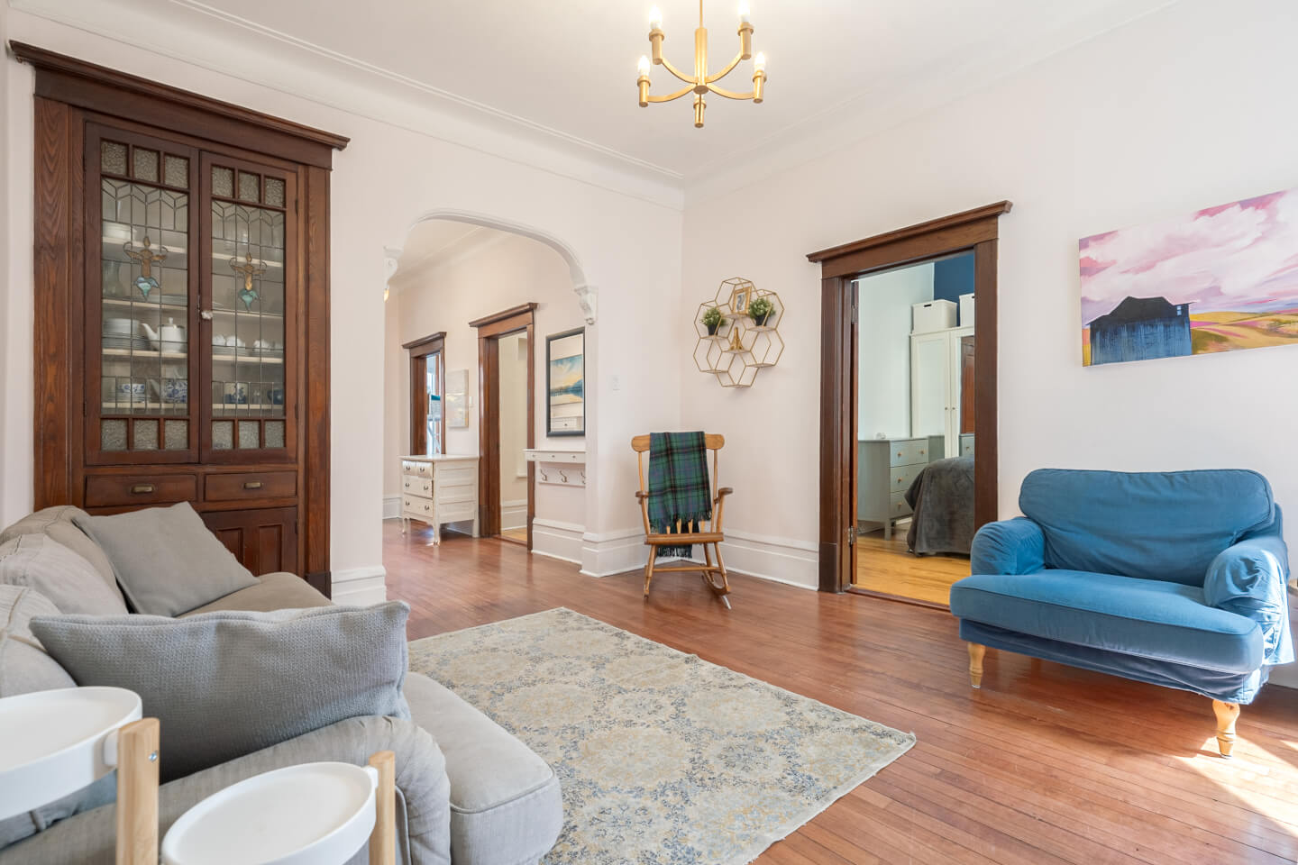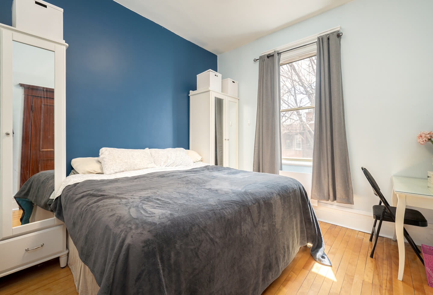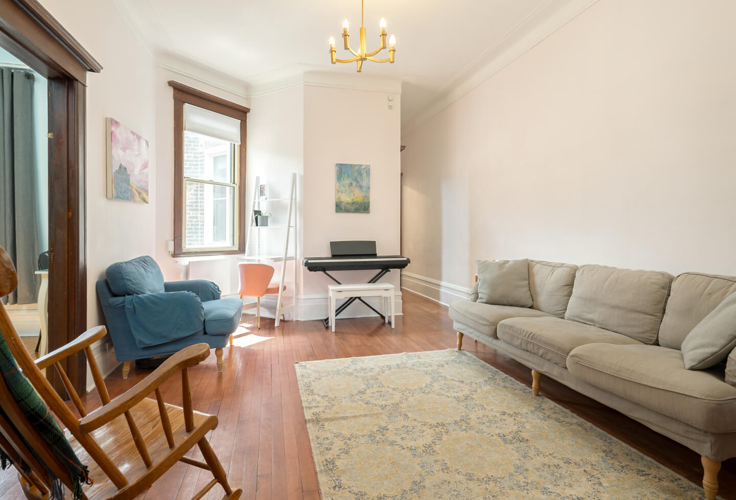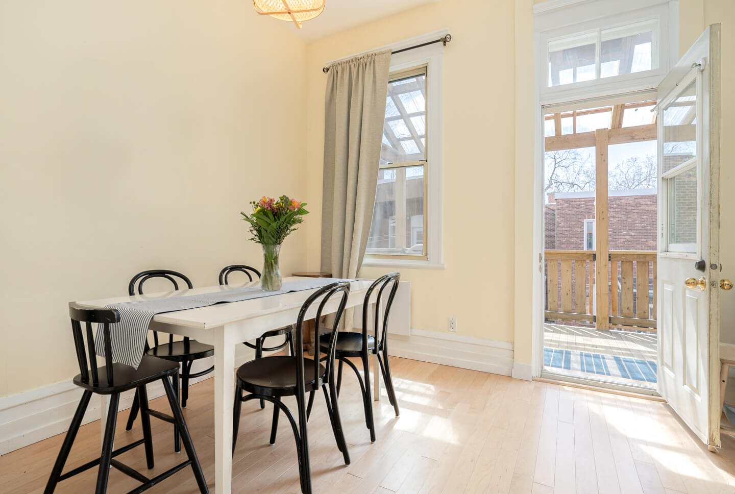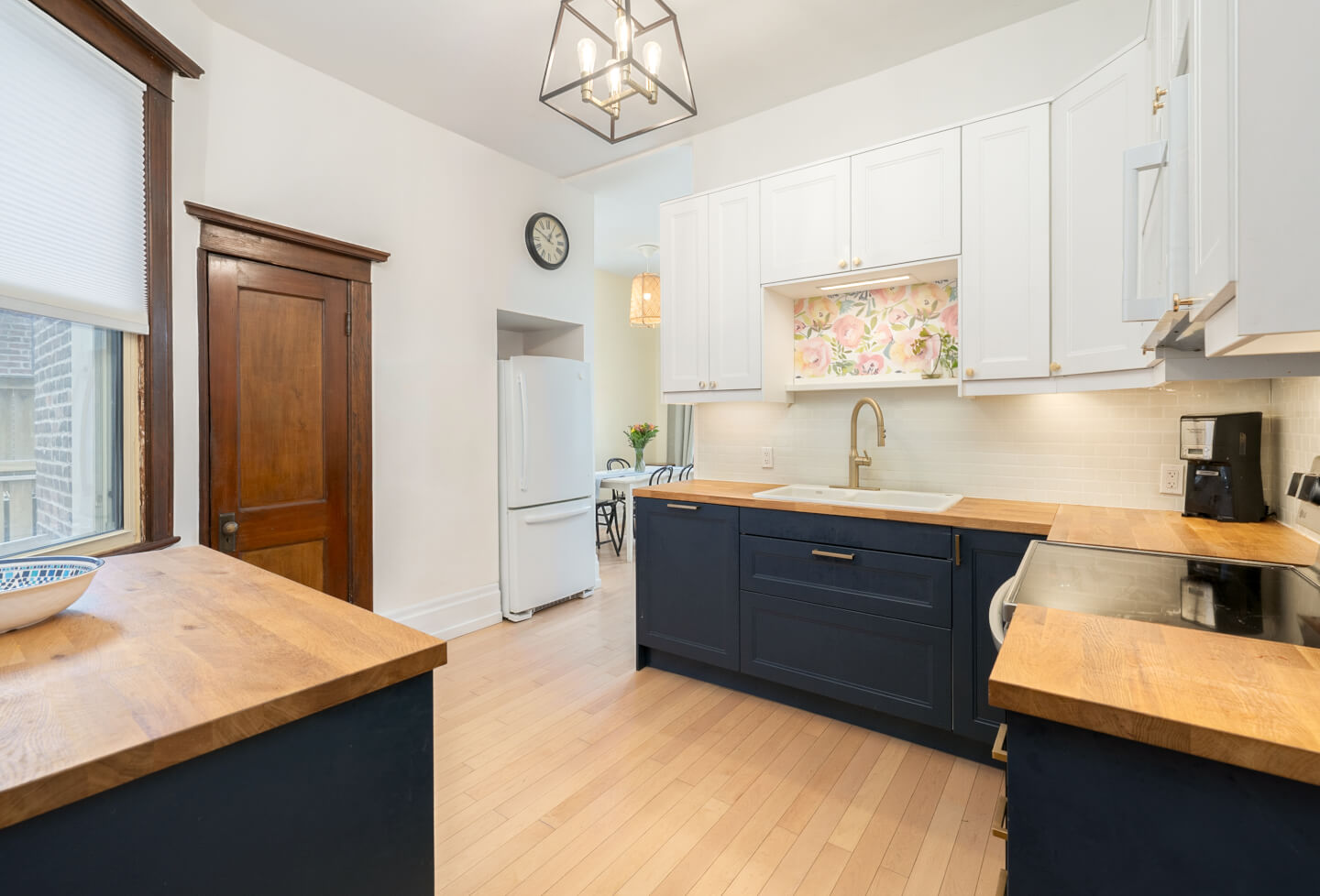 Charming undivided property located on the 2nd floor of a well-maintained building that combines timeless architectural charm with thoughtful modern updates. This inviting unit offers three closed bedrooms, a bathroom refreshed in 2017, and a stylish kitchen renovated in 2022, seamlessly connected to the dining area and bright, open living room—ideal for entertaining guests. Original woodwork, soaring 10-foot ceilings, a front balcony, and a sun-filled private rear terrace. Includes a den, a home office, and an unfinished basement space with excellent potential. Prime location near parks, schools, shops, cafés, restaurants, and public transit. A true gem!
