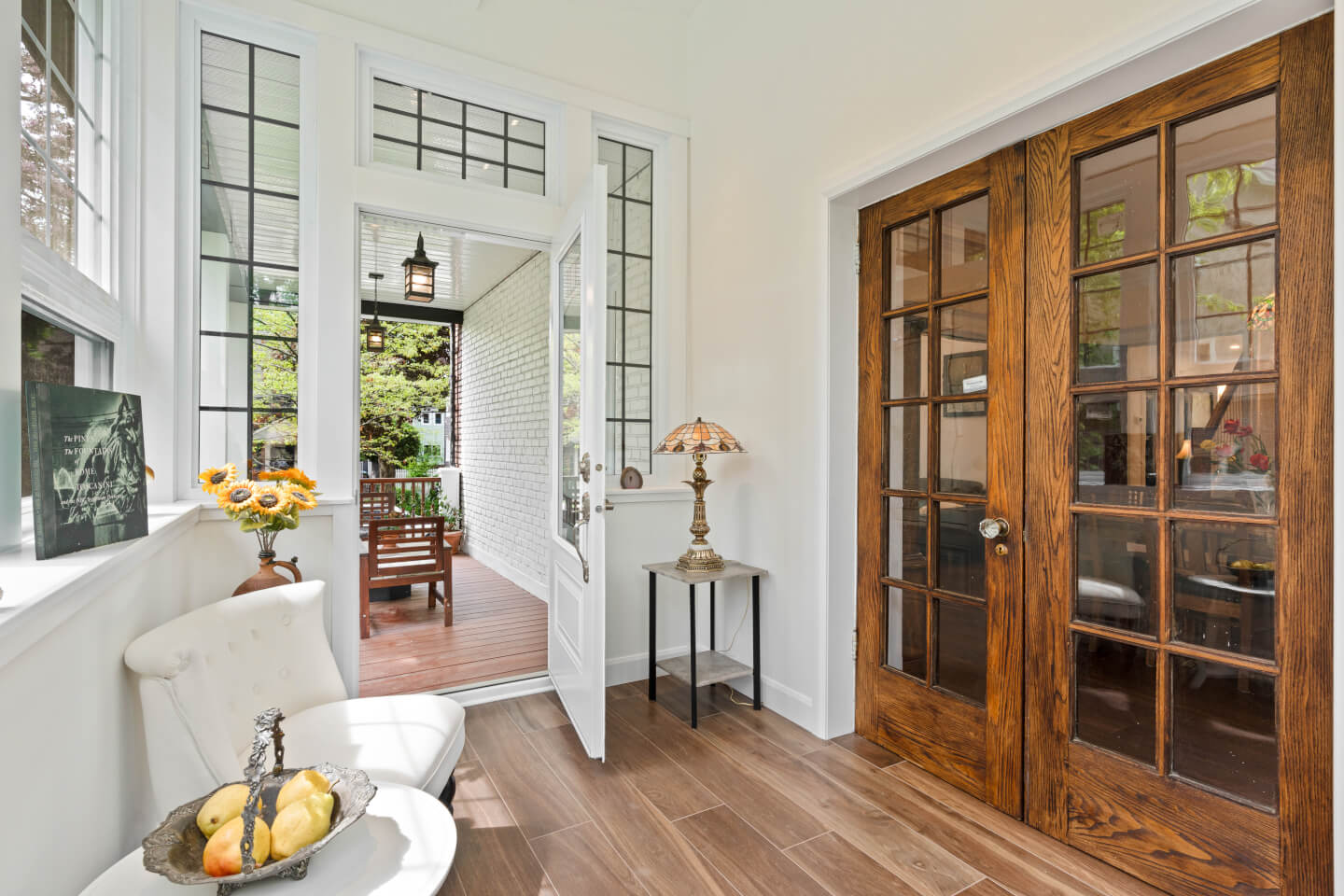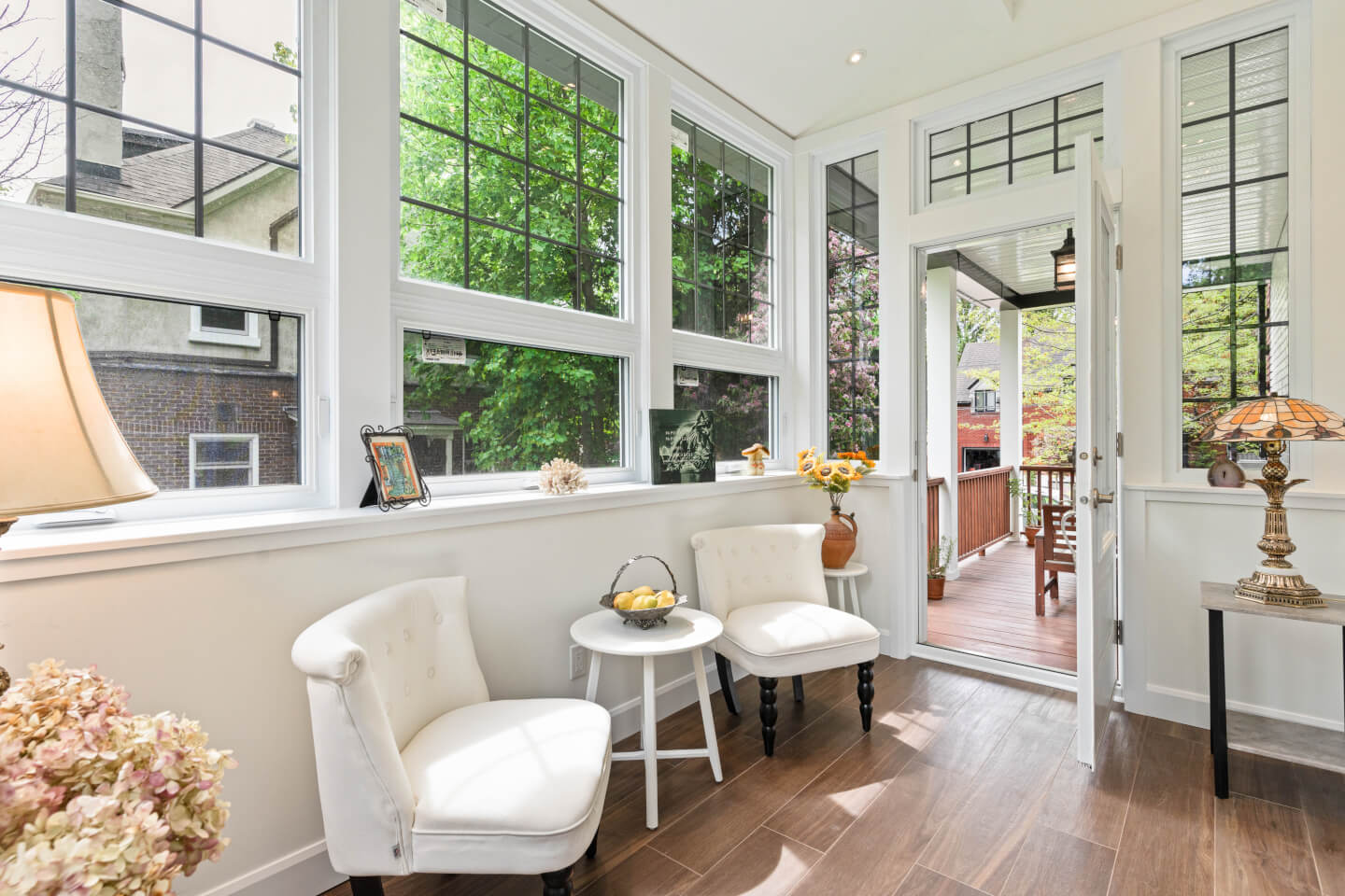 -renovate a four-season solarium (windows plus heated floors, exterior deck door, and restore French doors and AC)