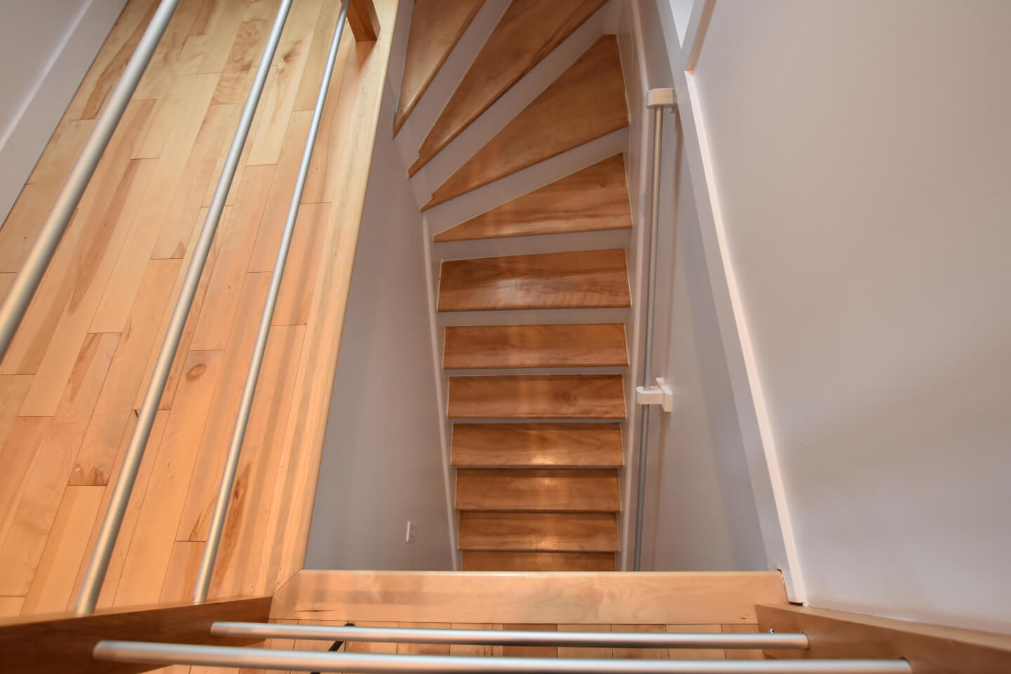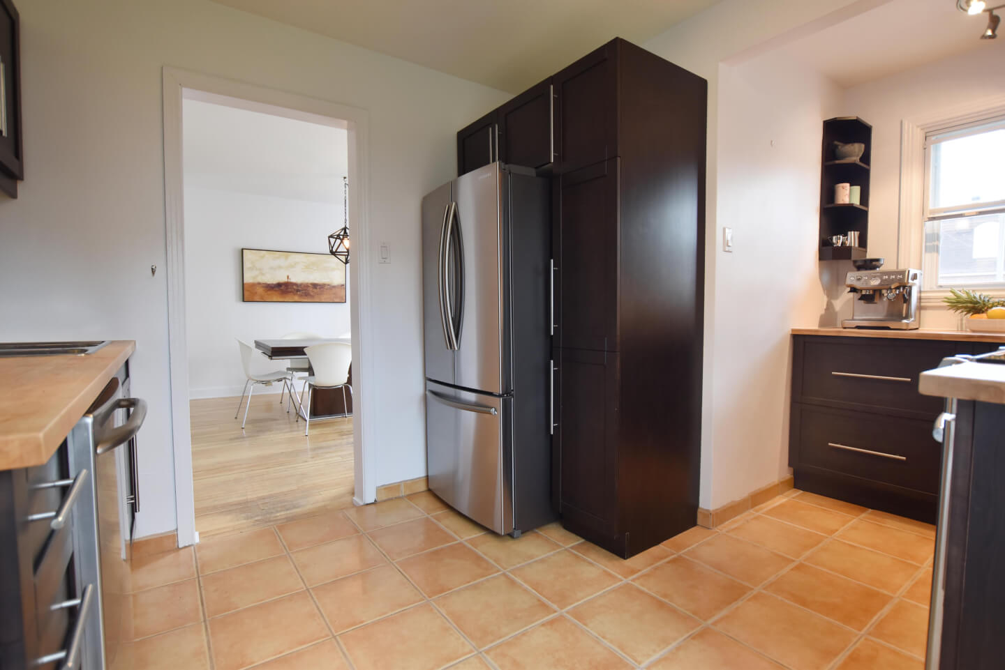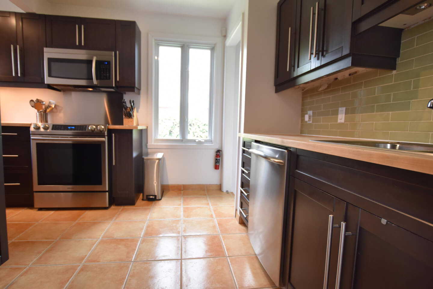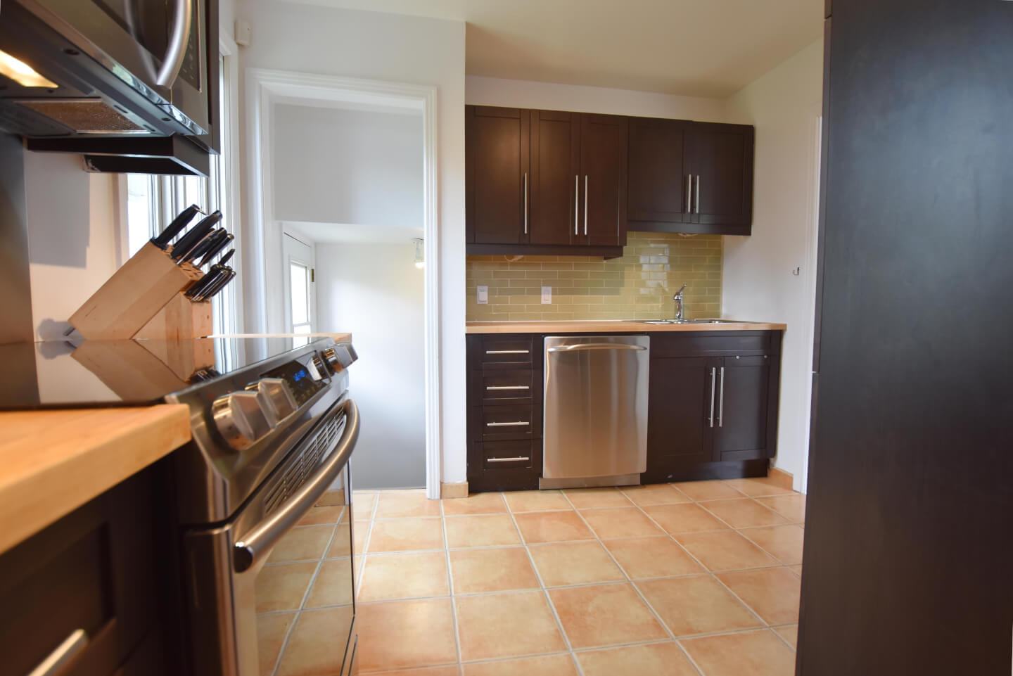 Jolie cuisine récente, comptoir de bois, accès au sous-sol