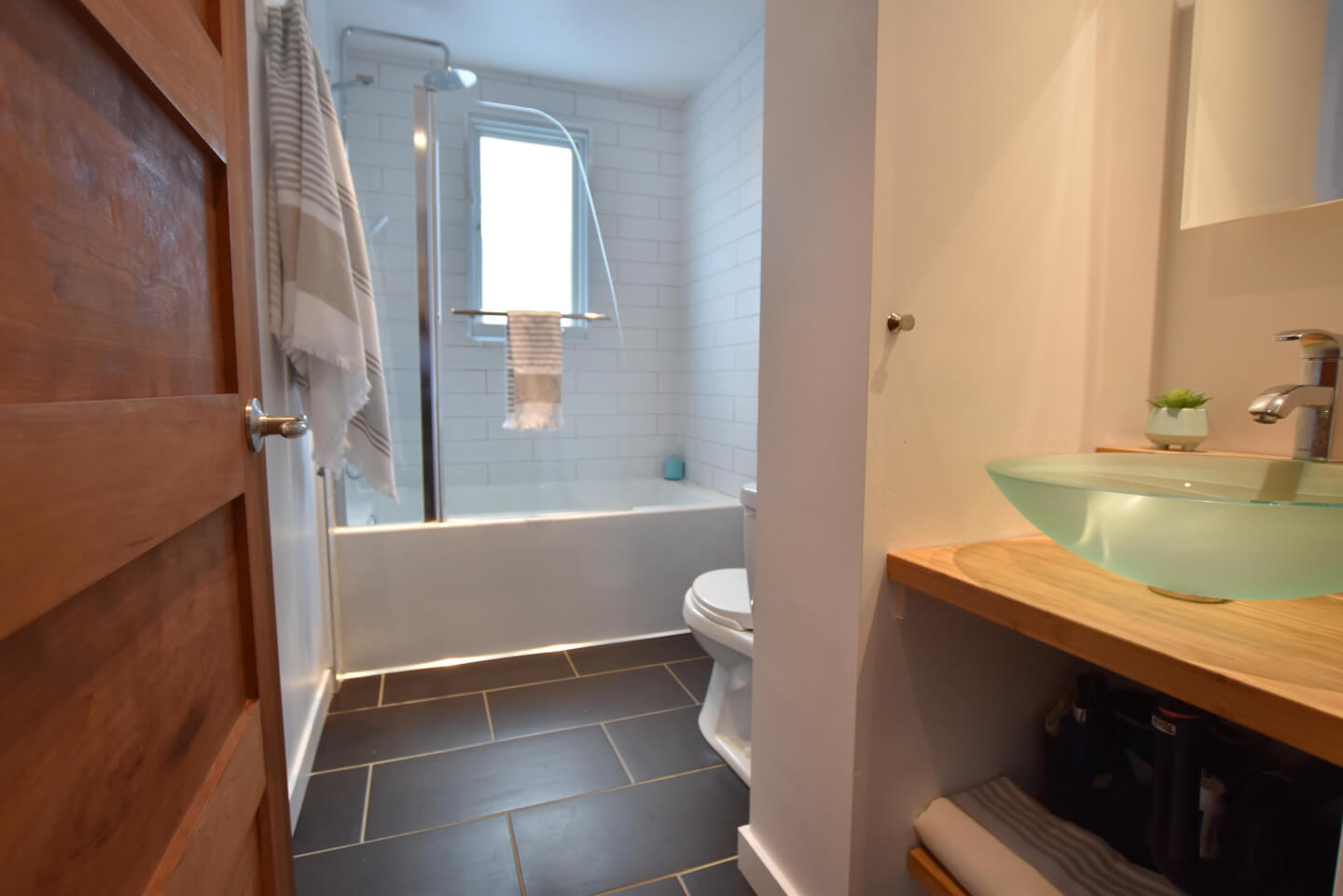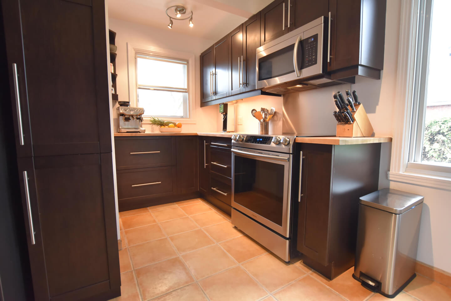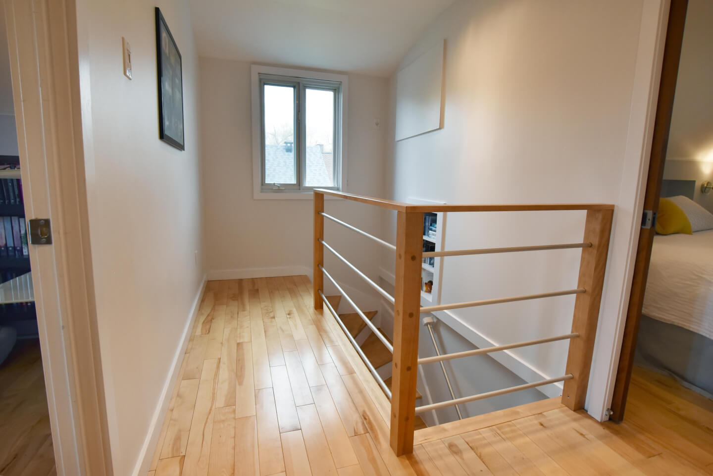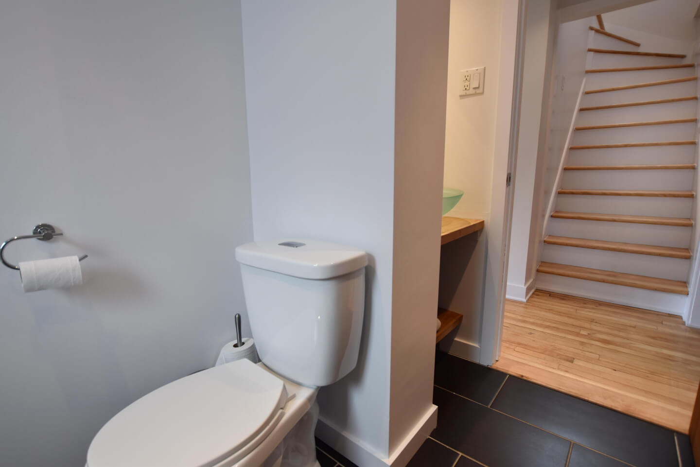Jolie cuisine récente, comptoir de bois, accès au sous-sol