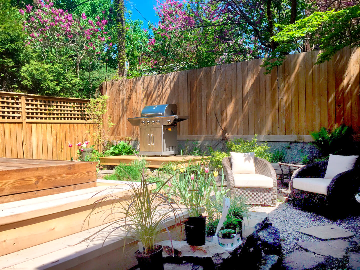 Dinette avec banquette incorporer à ses deux encastrés donnant vue du jardin de vivaces et la grande terrasse