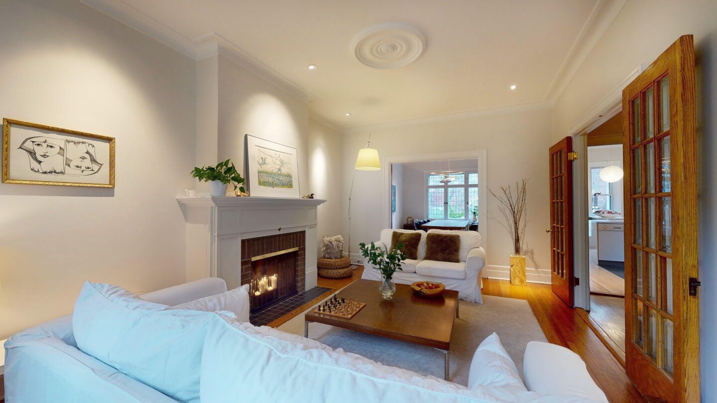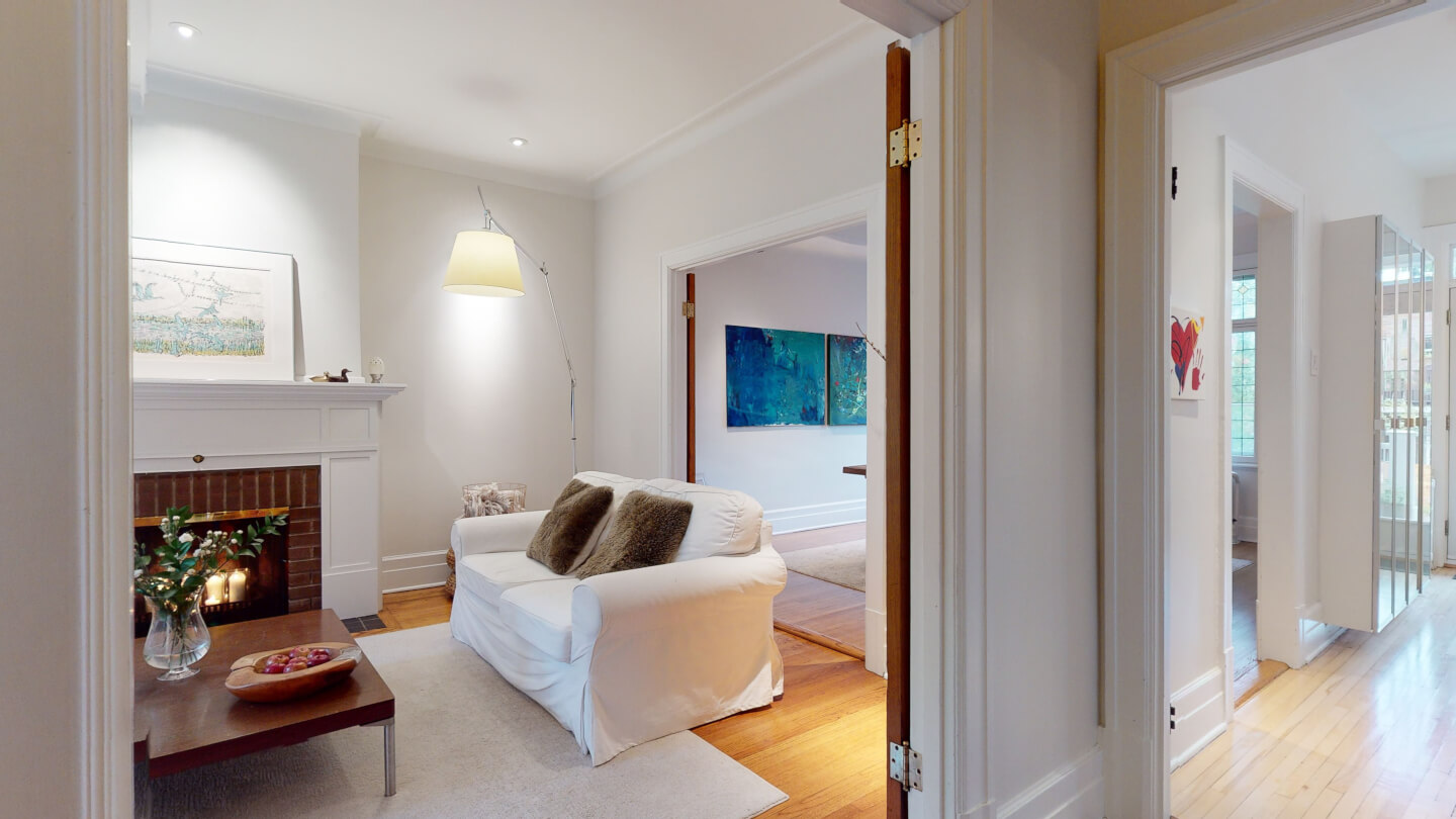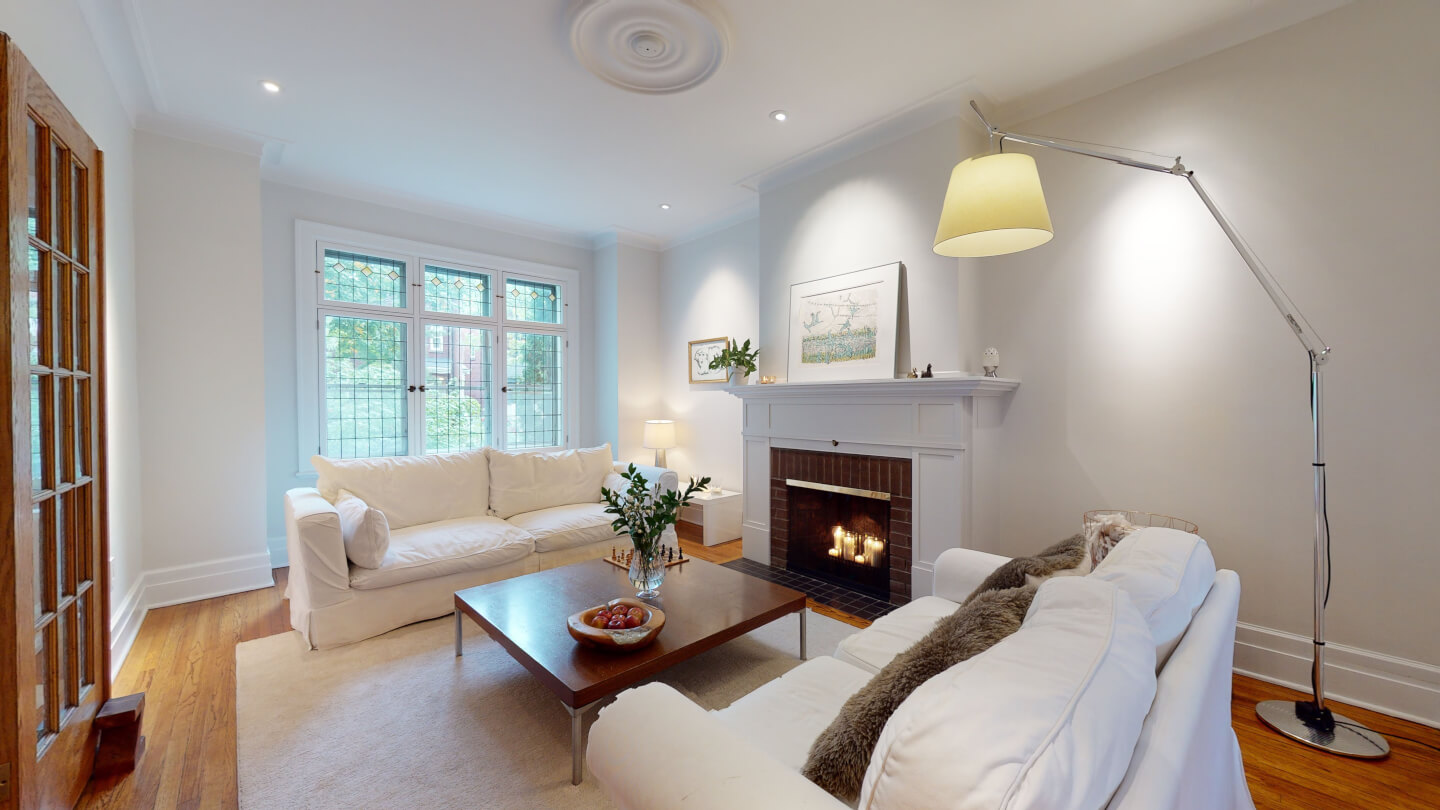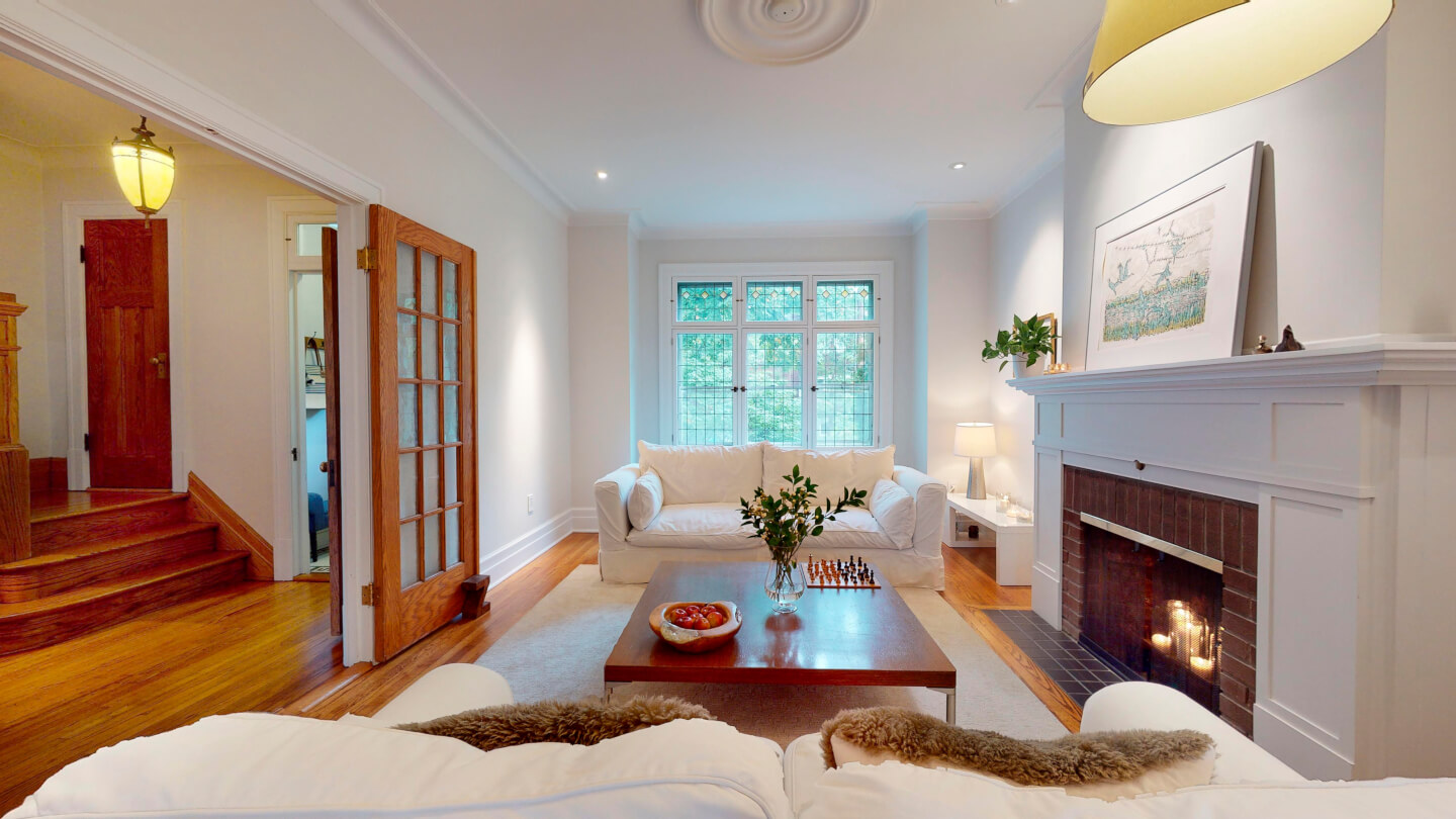 Élégant salon avec jolie fenestration de plomb restaurée (foyer d’origine 1922)