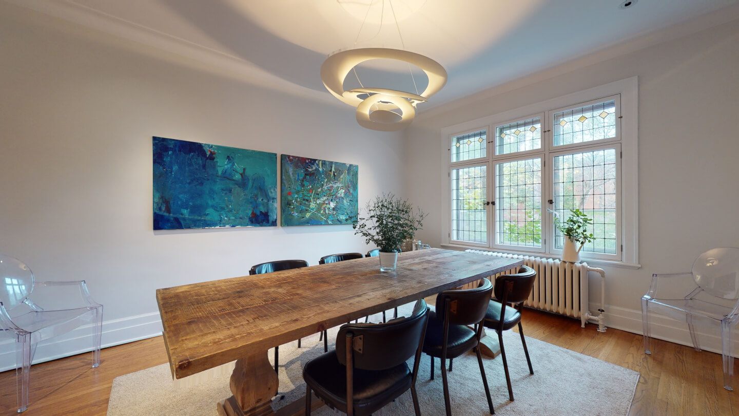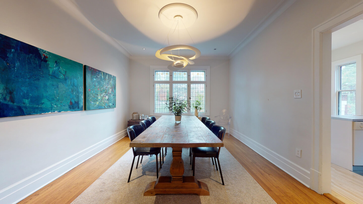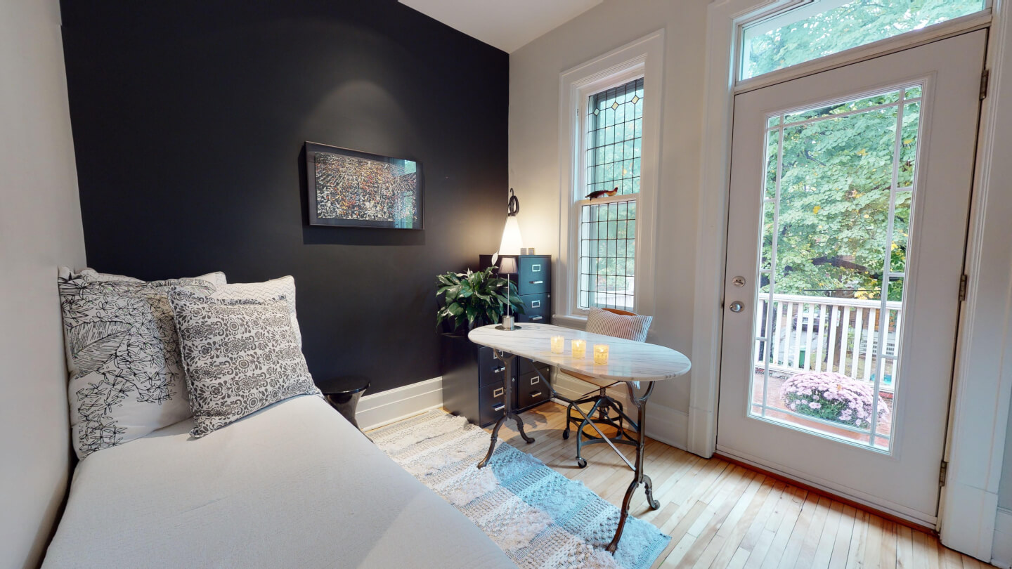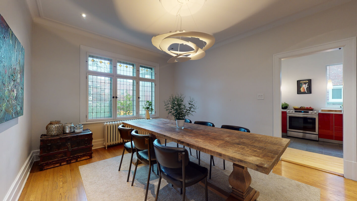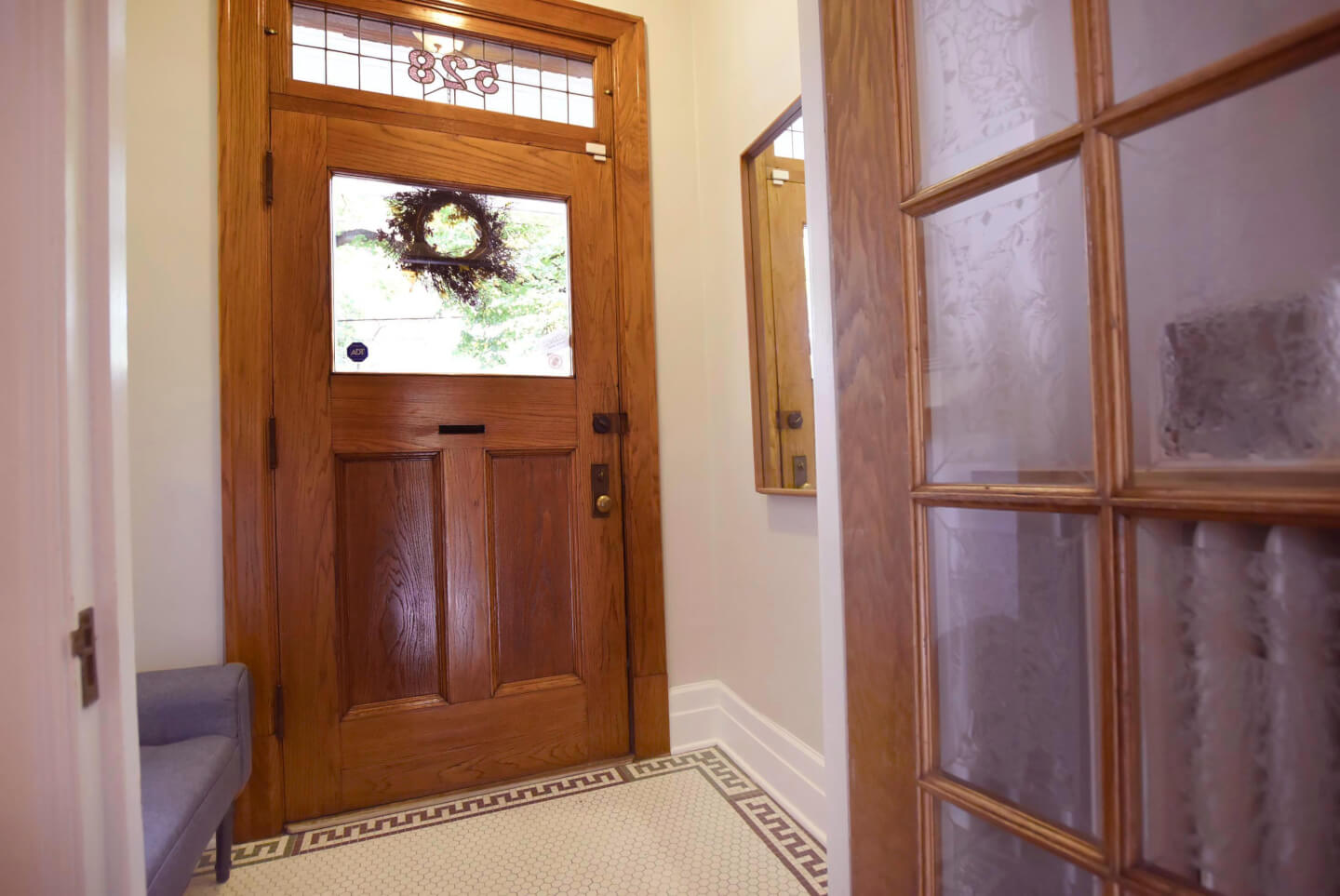 Élégant salon avec jolie fenestration de plomb restaurée (foyer d’origine 1922)