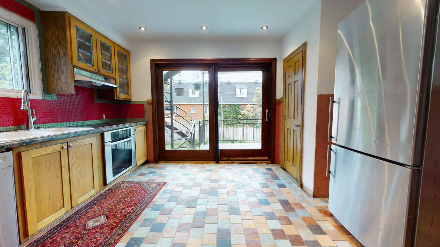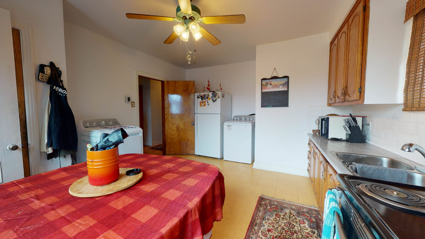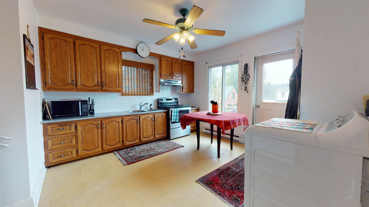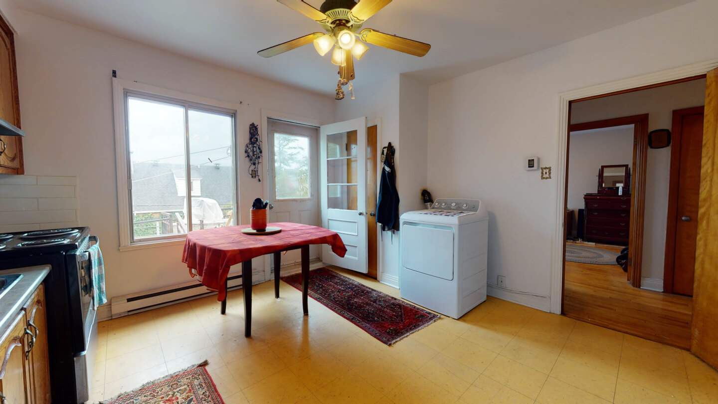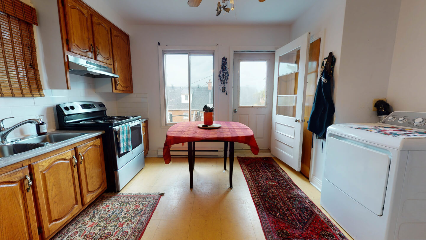 Cuisine coin repas, porte et balcon, plancher de linoléum, lavoir