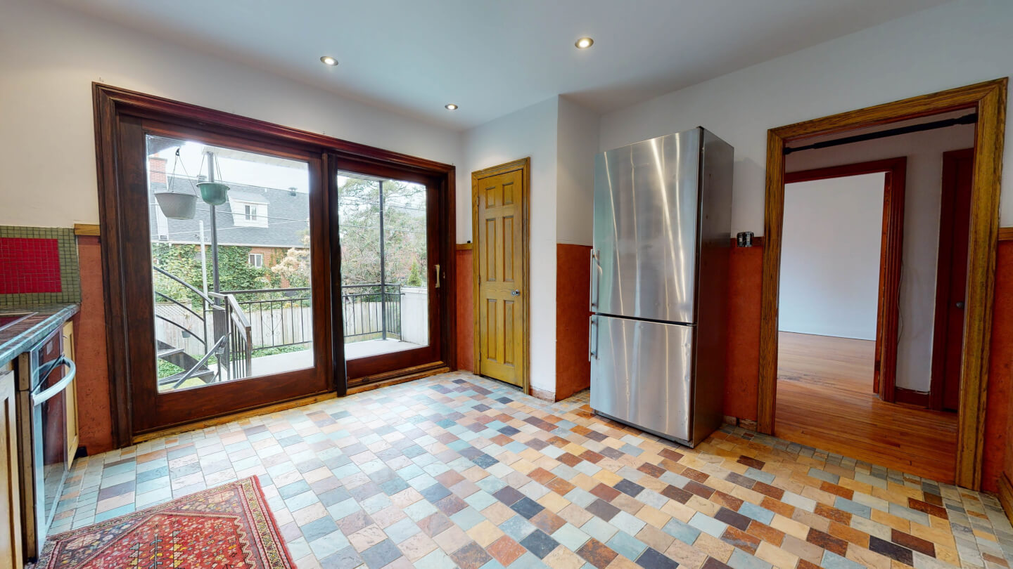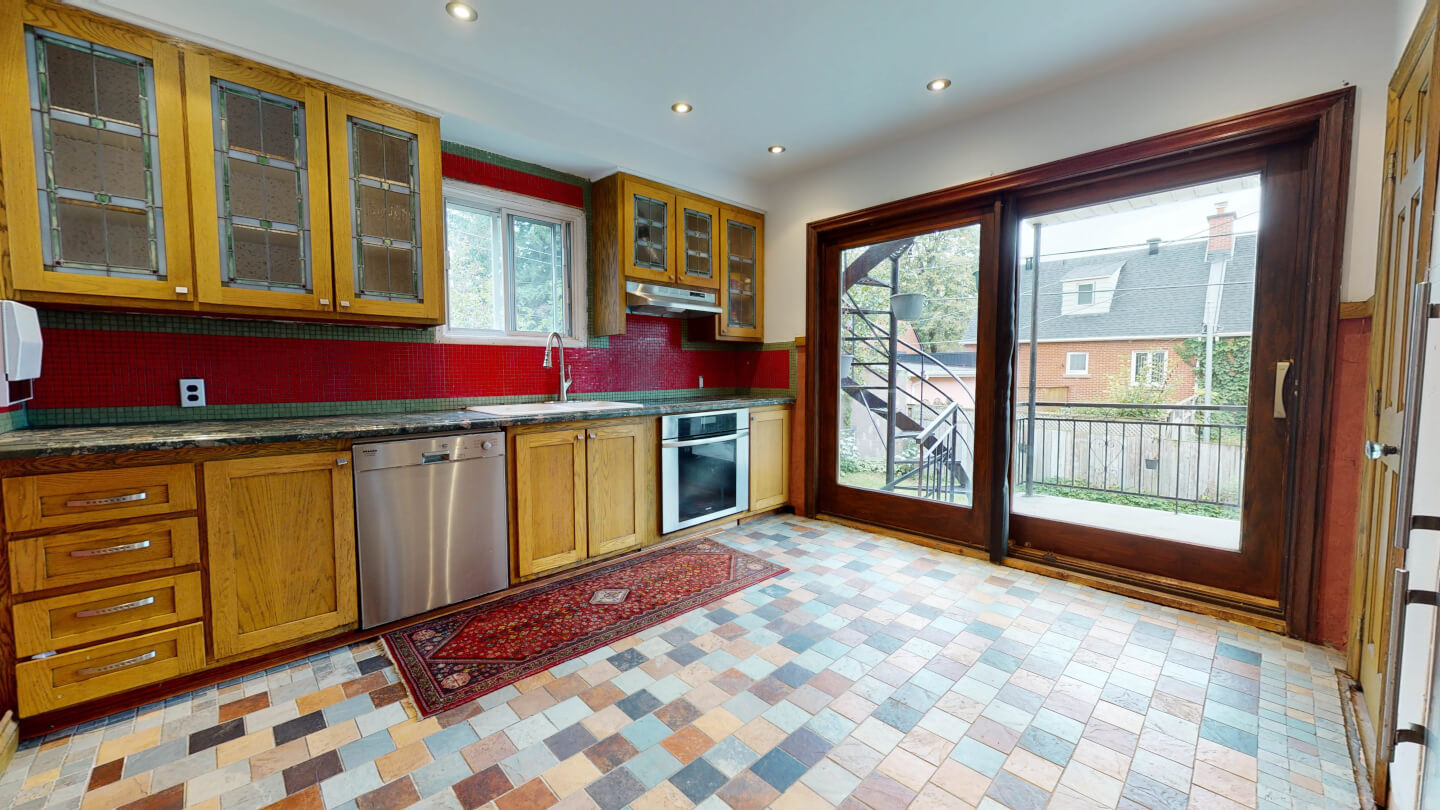 Cuisine coin repas, porte patio et balcon, plancher de céramique